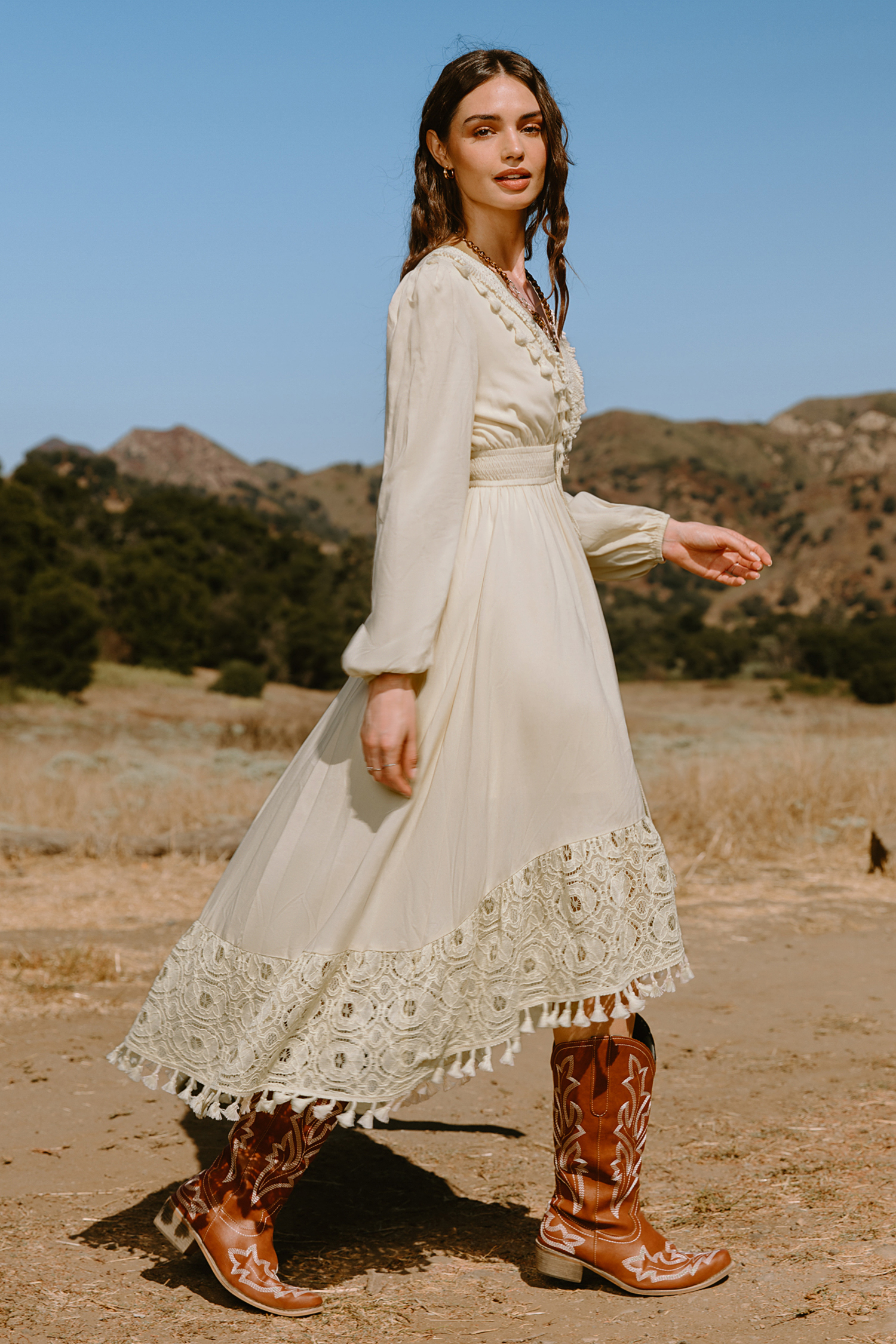 Apricot Plunging Blouson Sleeve Midi Dress