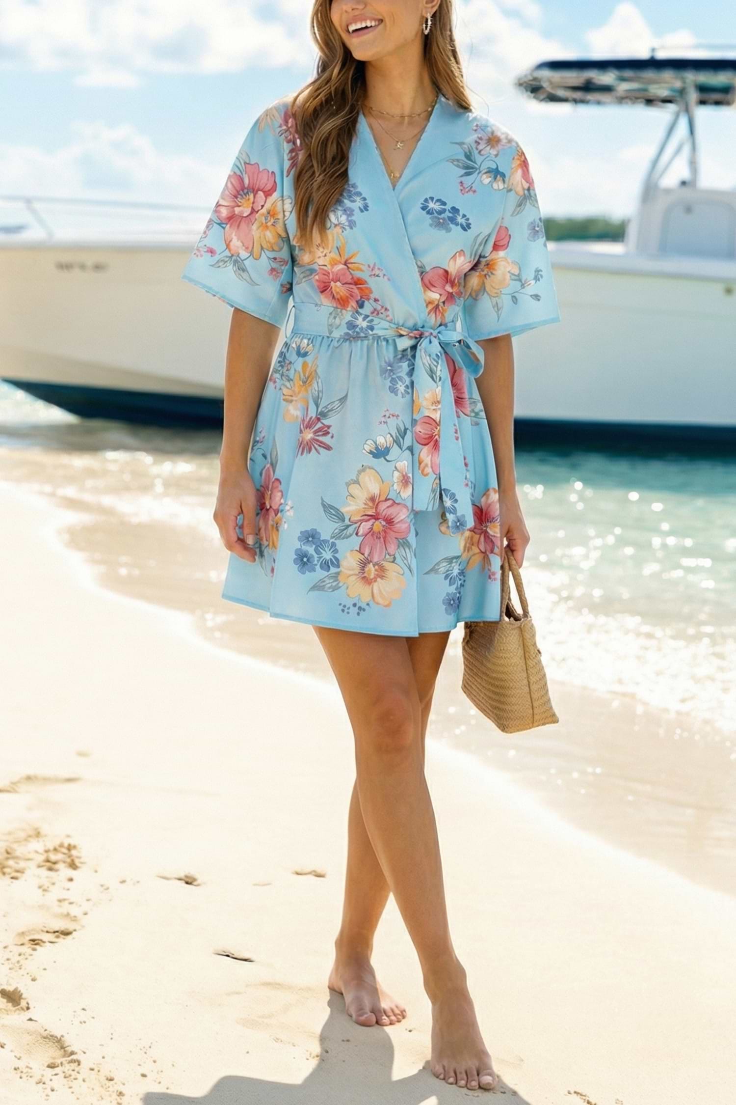 The Barefoot in Bimini Floral Mini Dress is made for easy, sunkissed days! The surplice neckline and half sleeves keep it comfortable, while the waist tie shapes the fit and the mini length keeps it playful.
