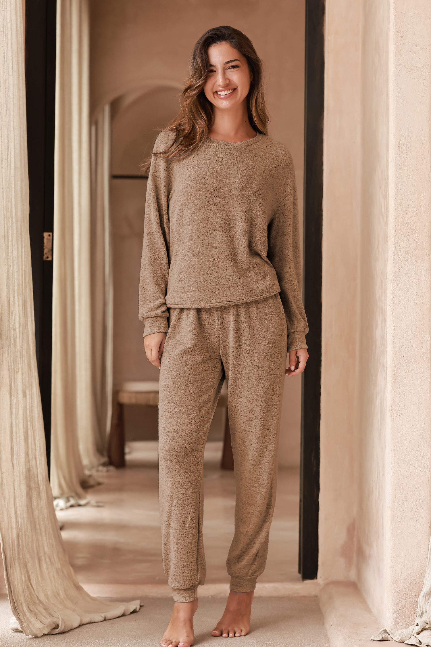 The Bed Head Babe Beige Pajama Set is made for laid-back, sleepy-day vibes! A round neckline pairs with long sleeves for cozy comfort, while the matching pants complete the soft, relaxed look.