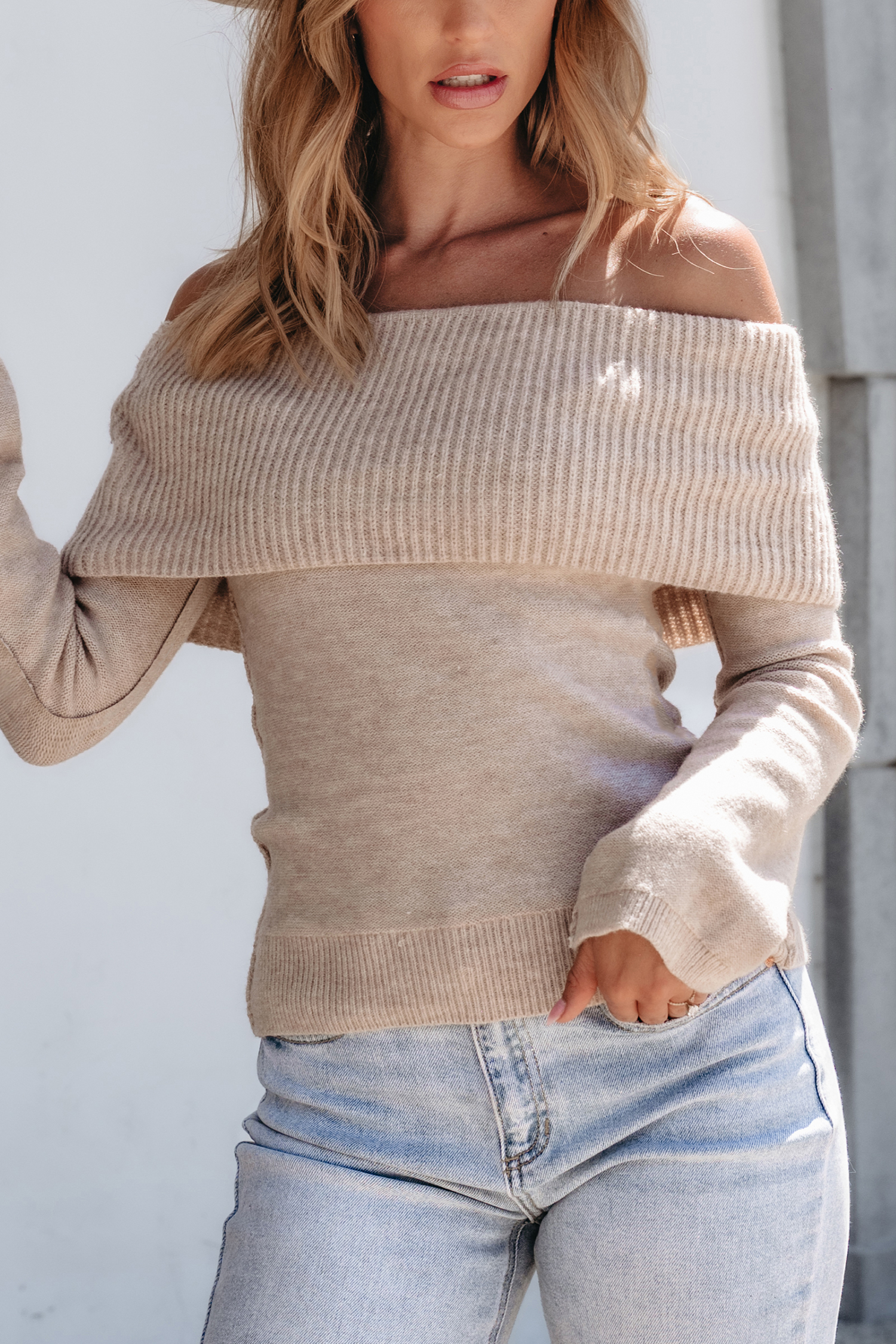 HomeBeige Foldover Off-Shoulder Flared Sleeve Top