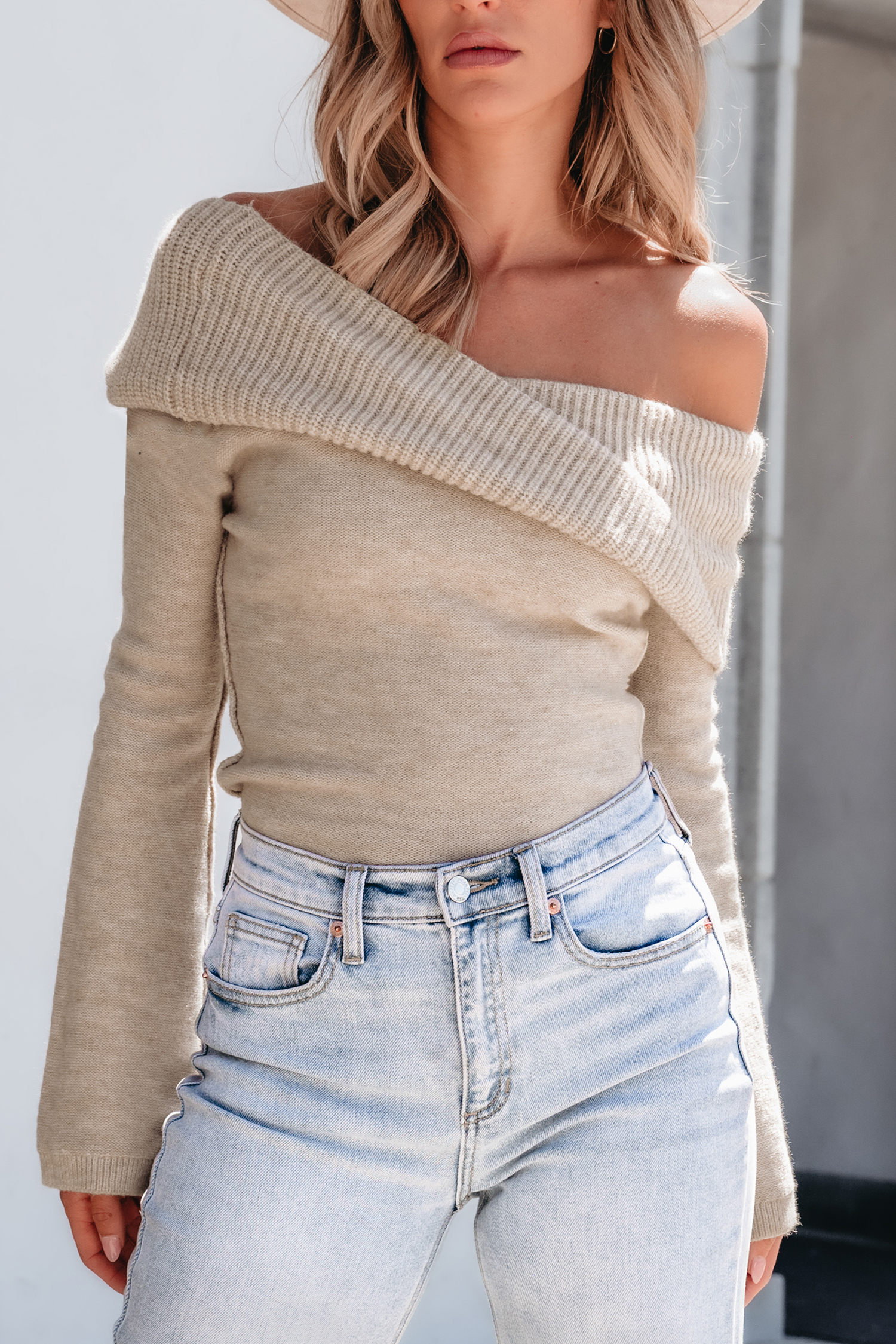 Beige Foldover Off-Shoulder Flared Sleeve Top