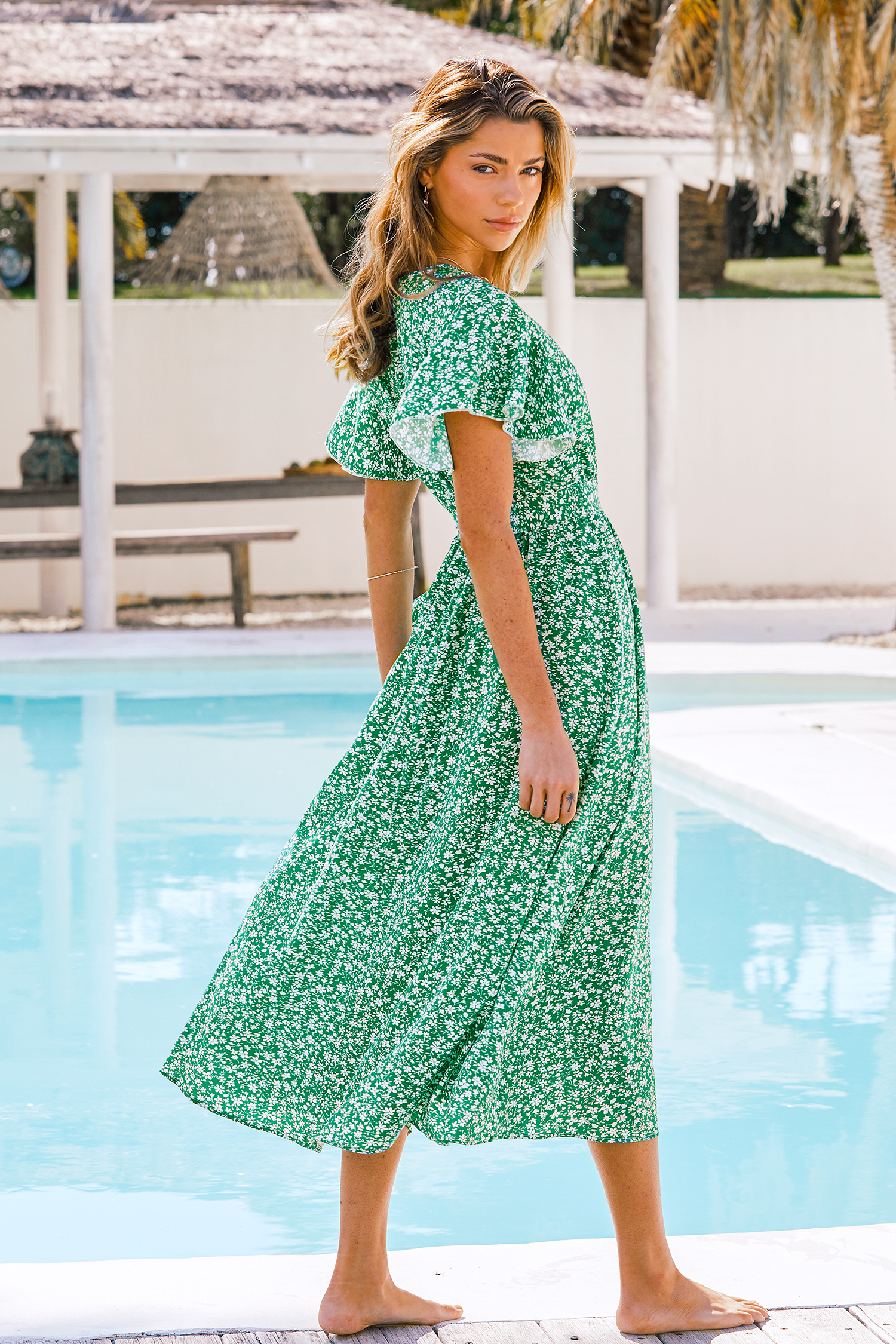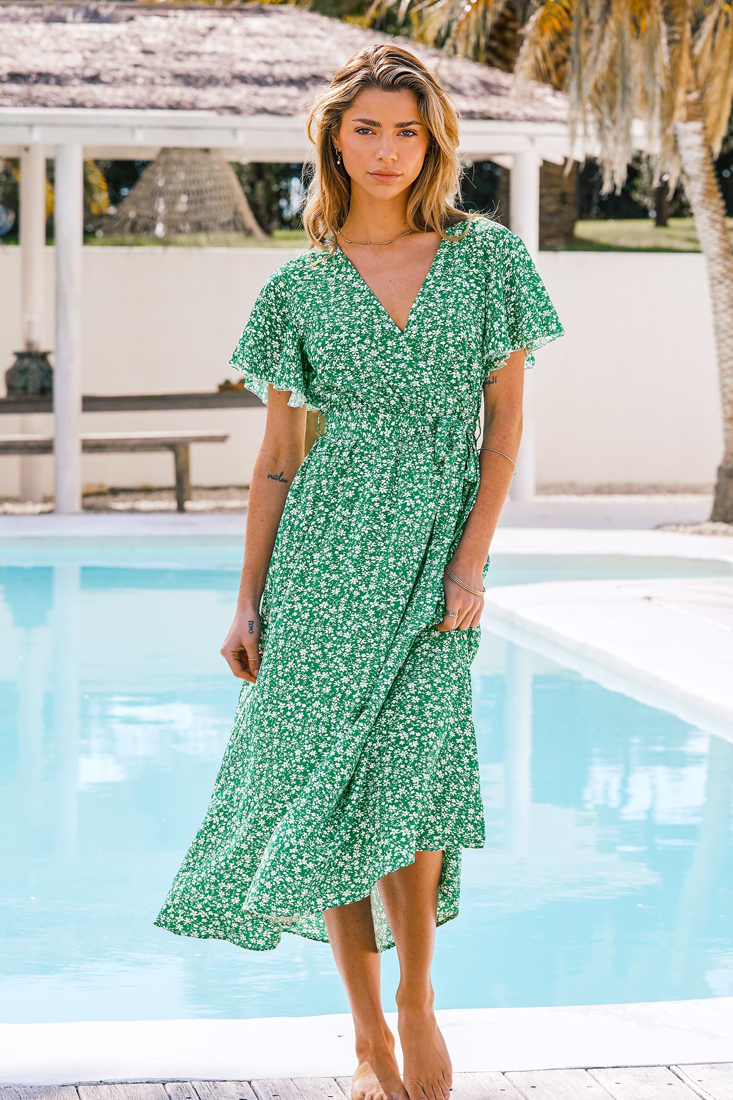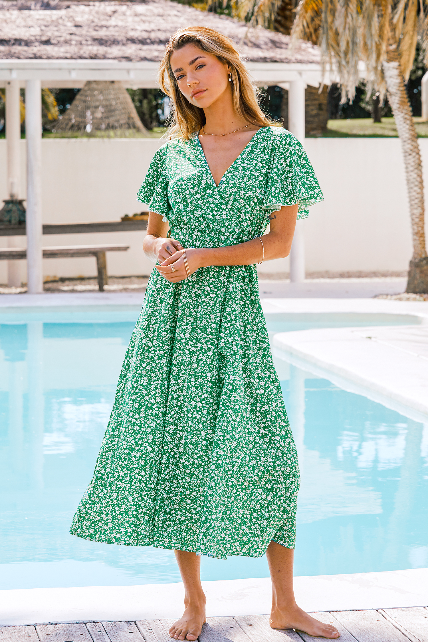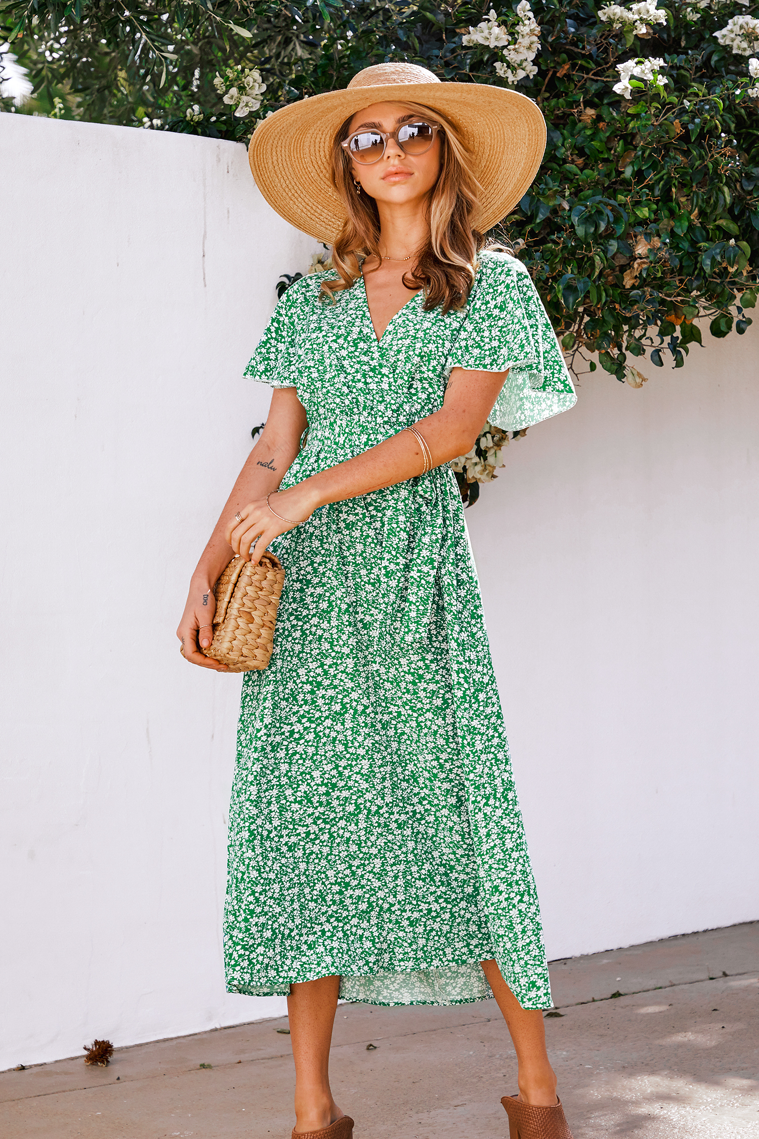 Belted Ditsy Floral Print Midi Dress