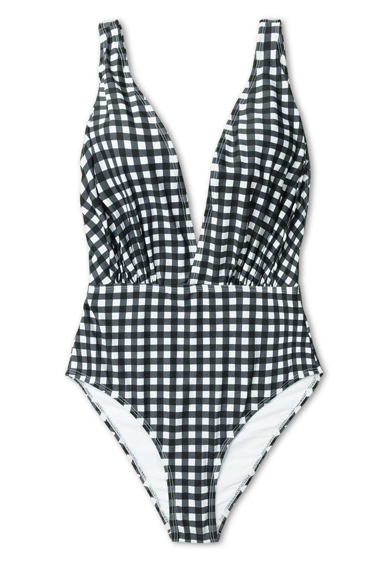 HomeBlack and White Plaid Plunging One-Piece Swimsuit