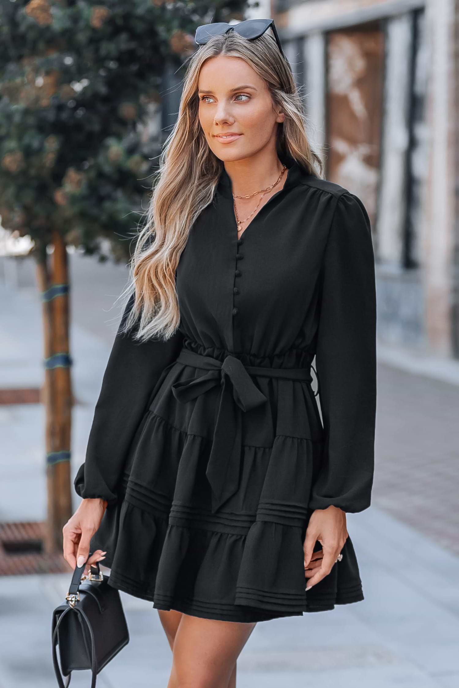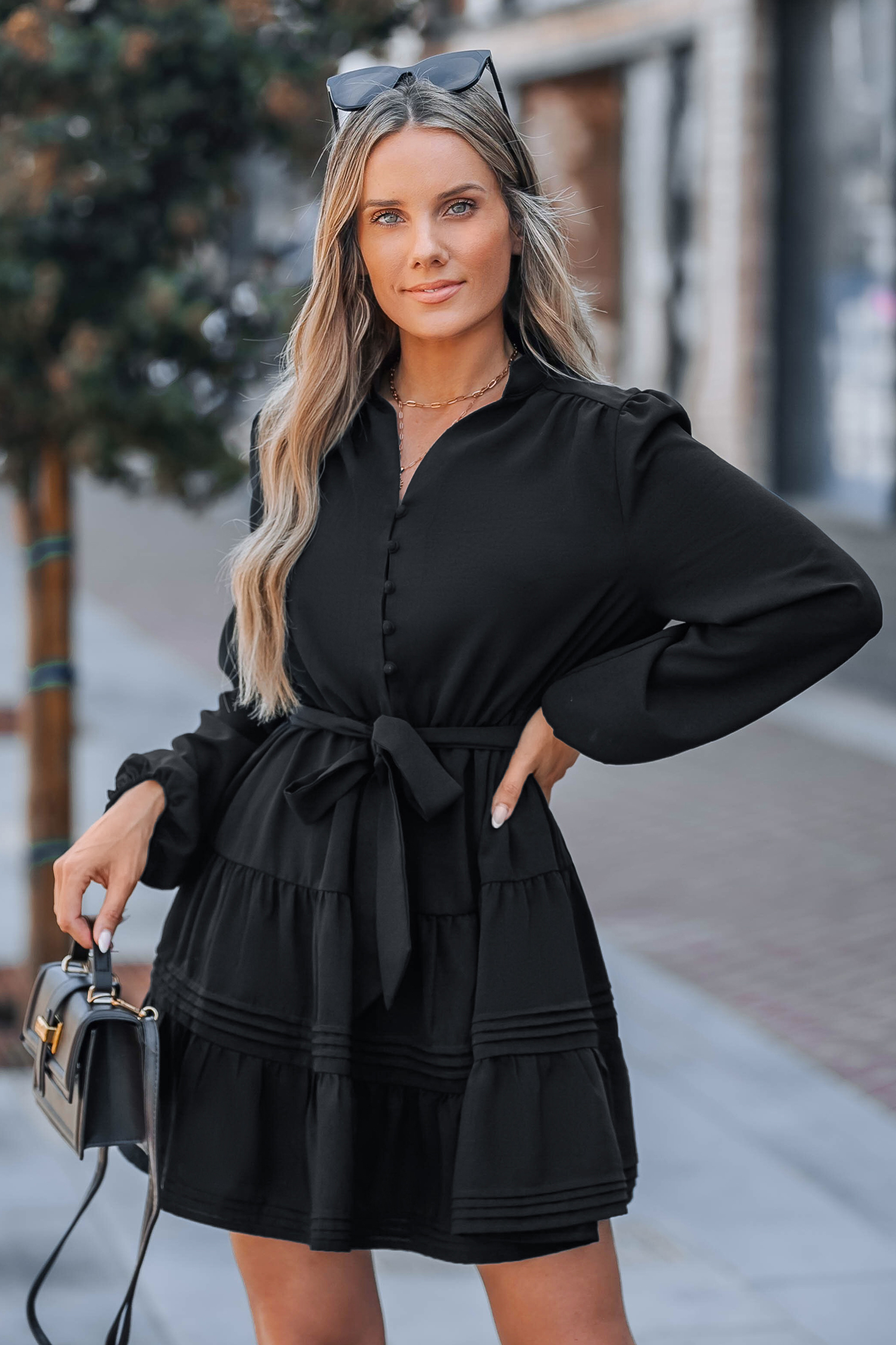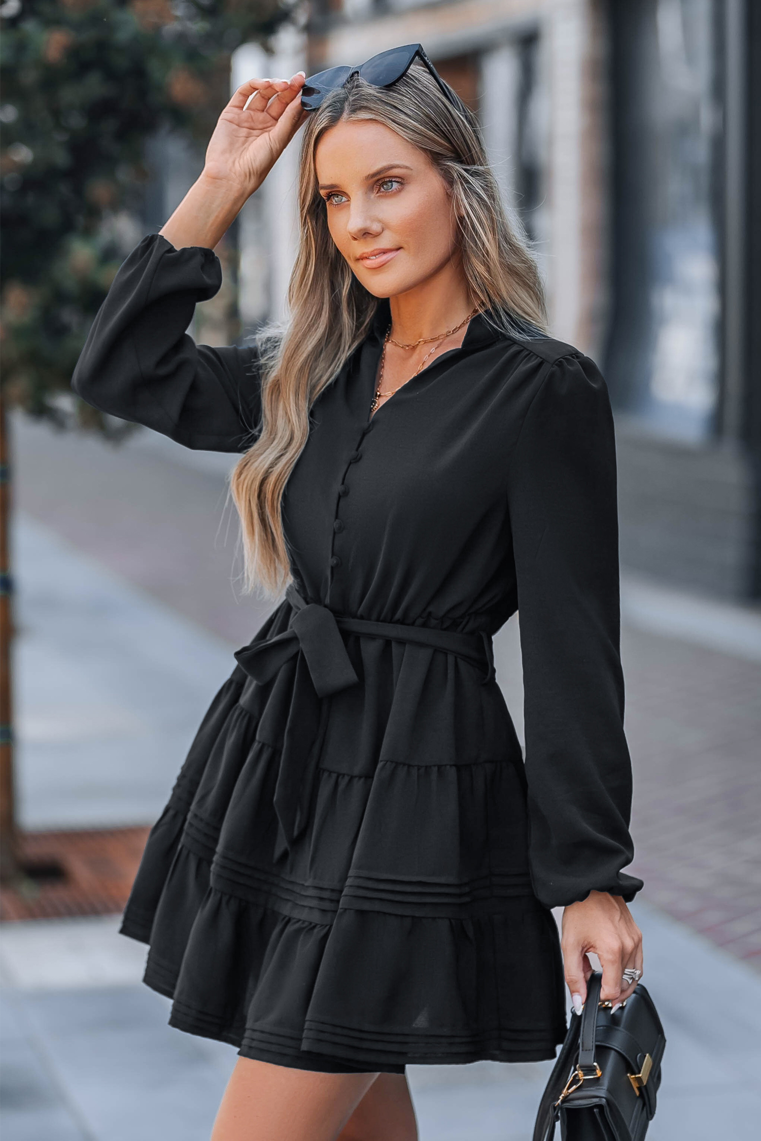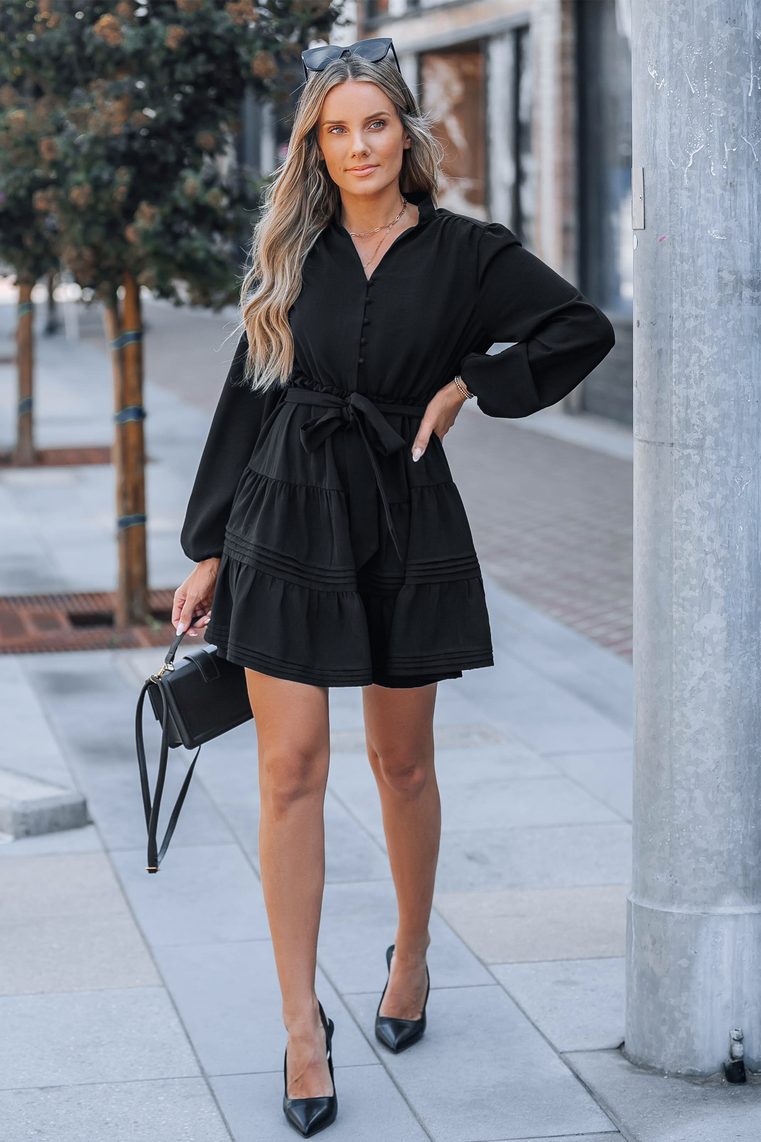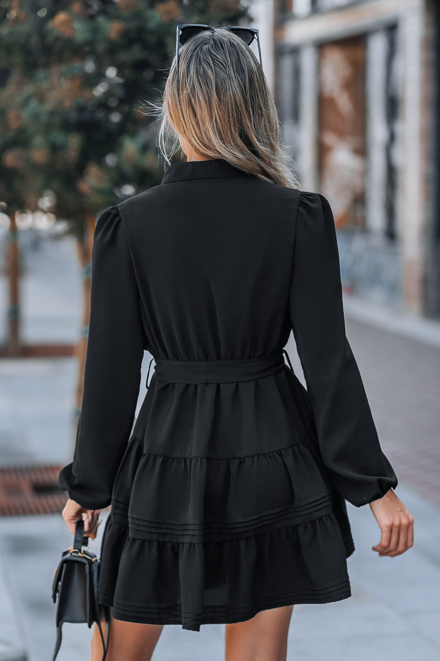 Black Belted Bubble Sleeve Mini Dress