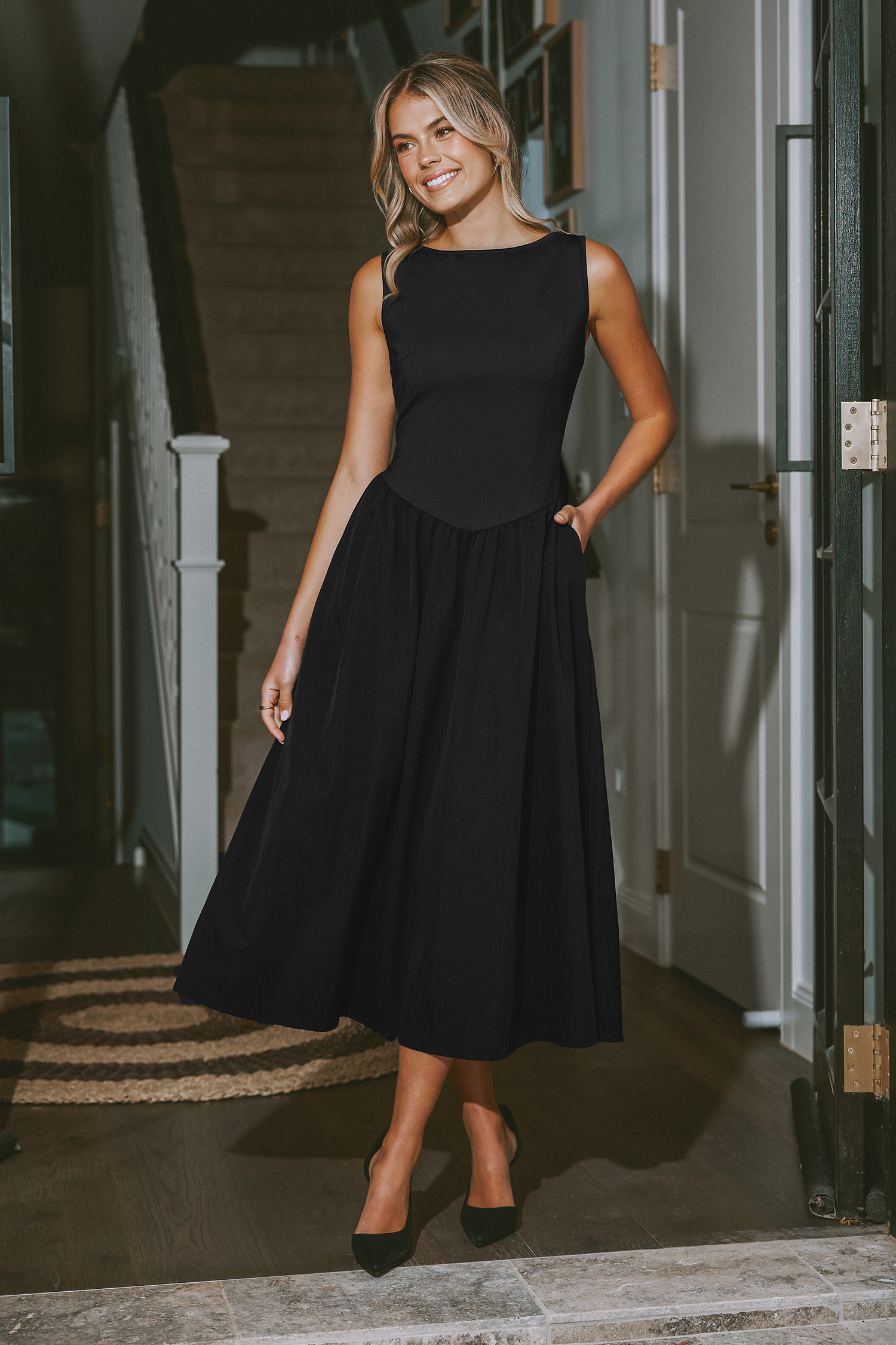 Black Boatneck Sleeveless Drop Waist Midi Dress