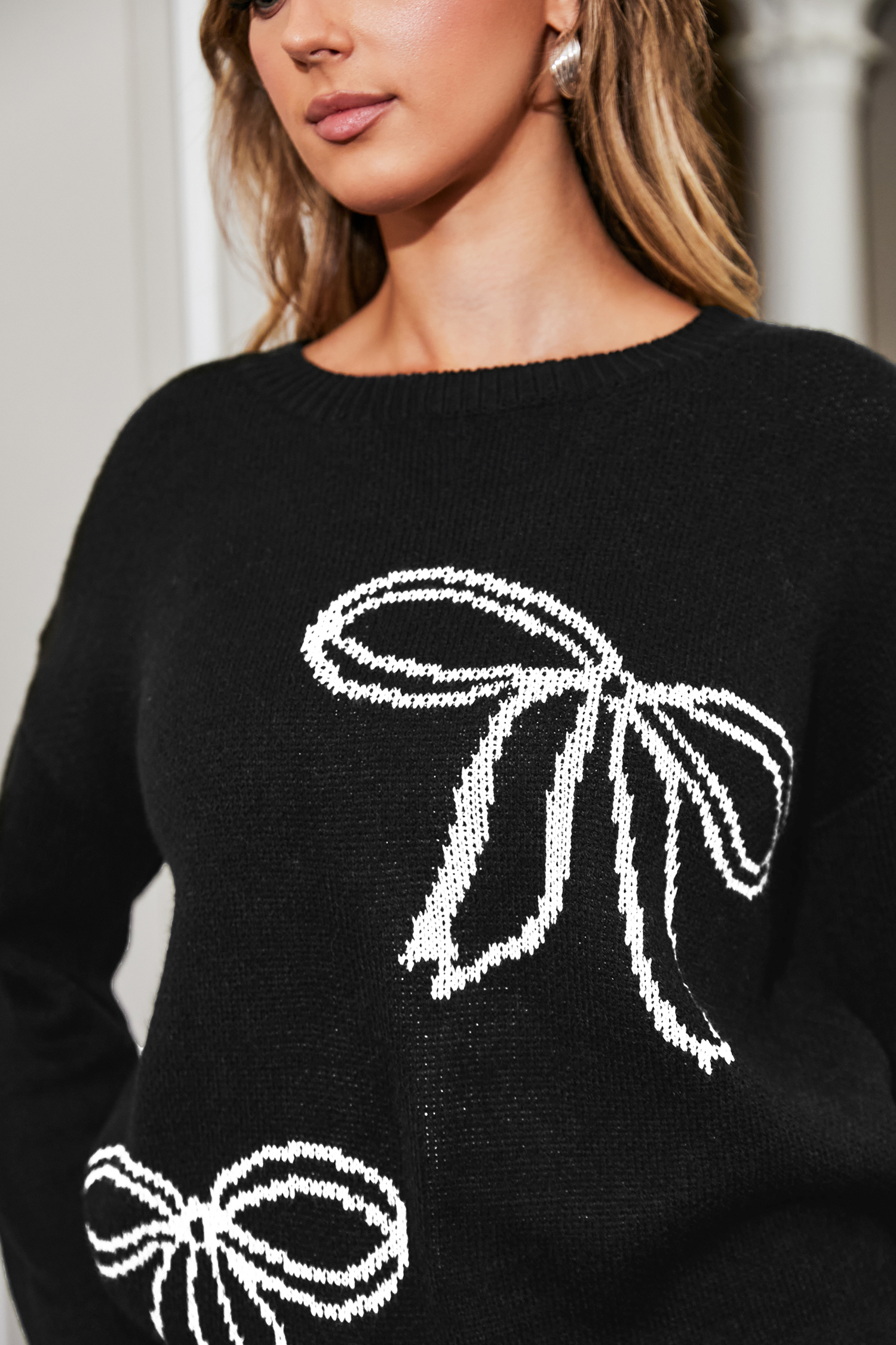 Black Bow Tie Print Long Sleeve Sweater