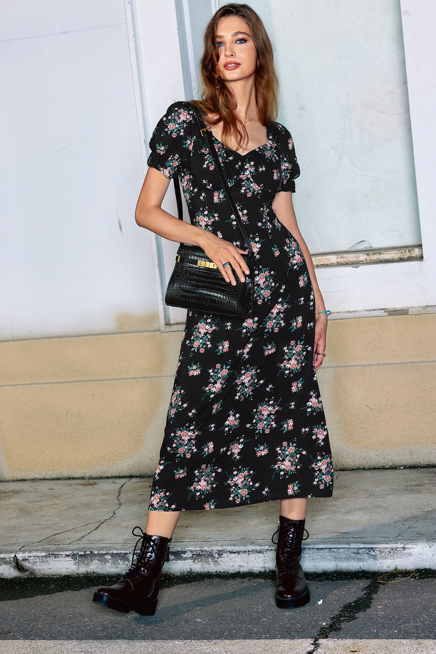 Black Floral Diamond Collar Puff Sleeve Midi Dress
