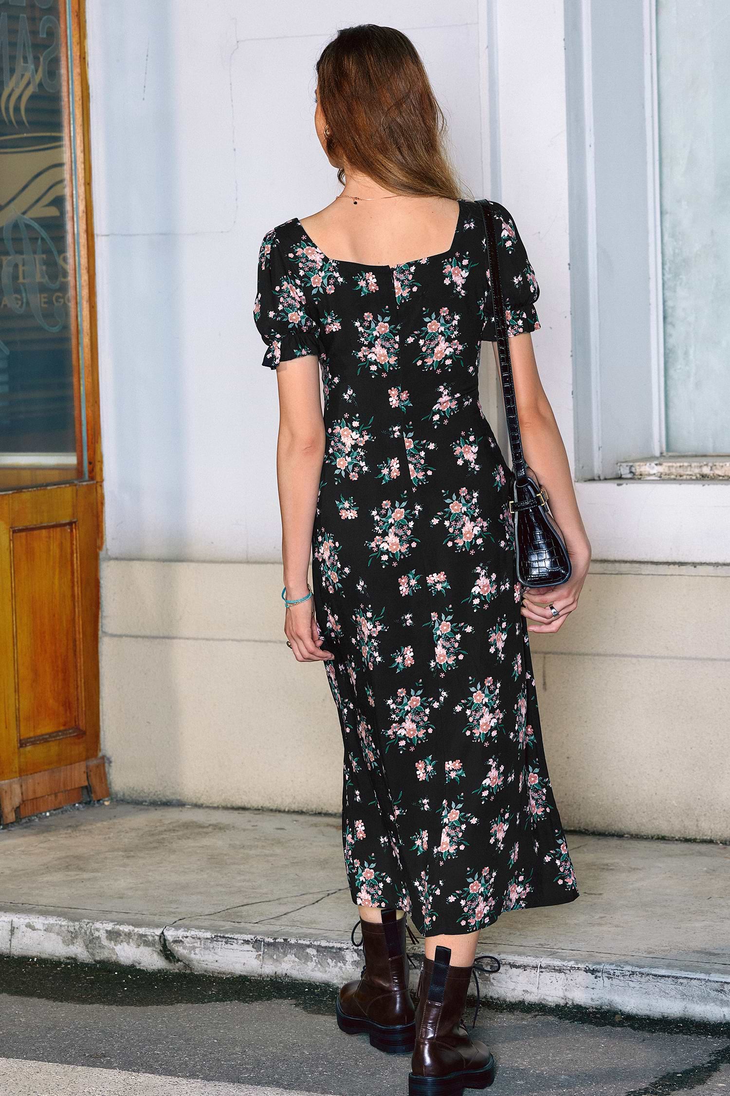 HomeBlack Floral Diamond Collar Puff Sleeve Midi Dress