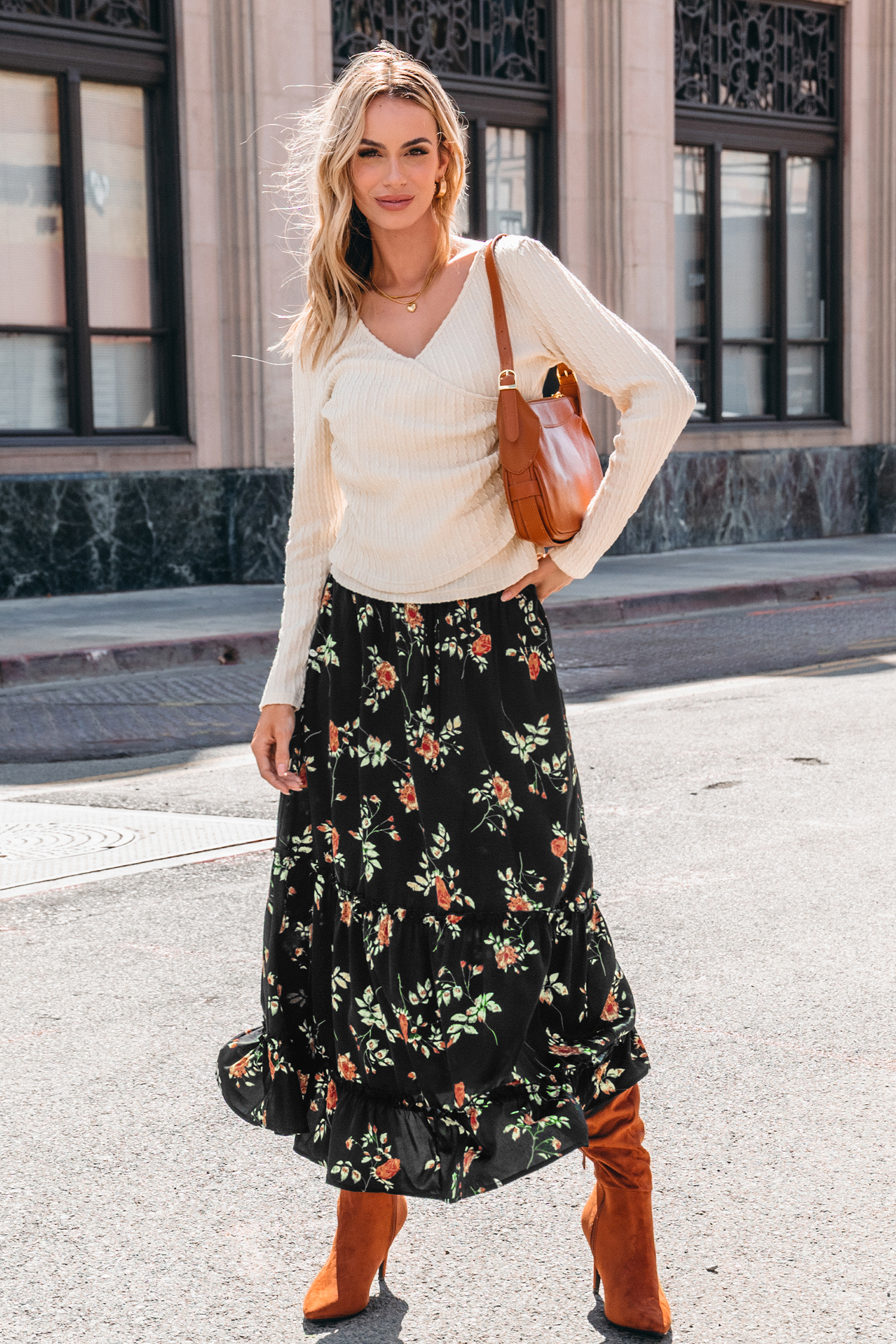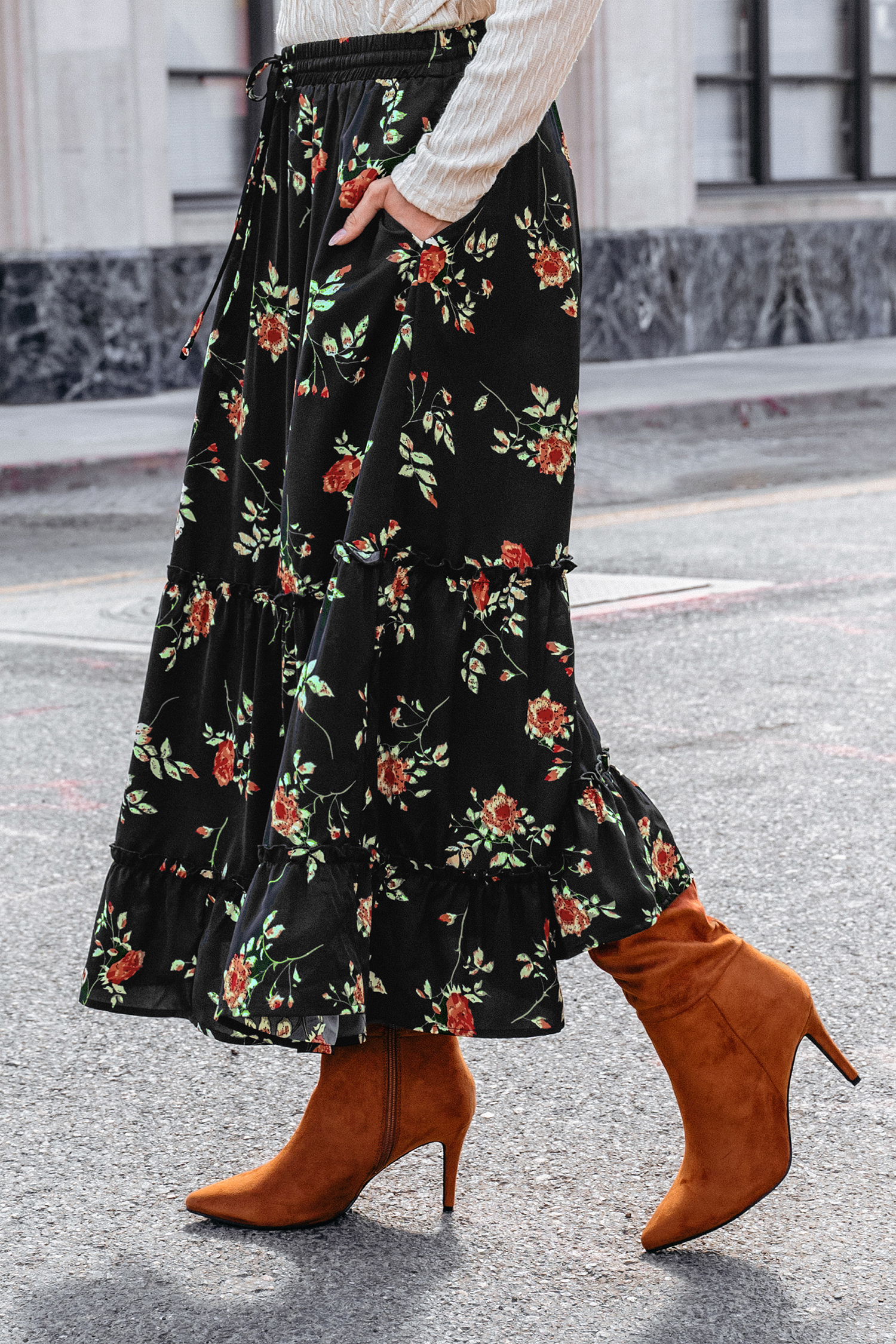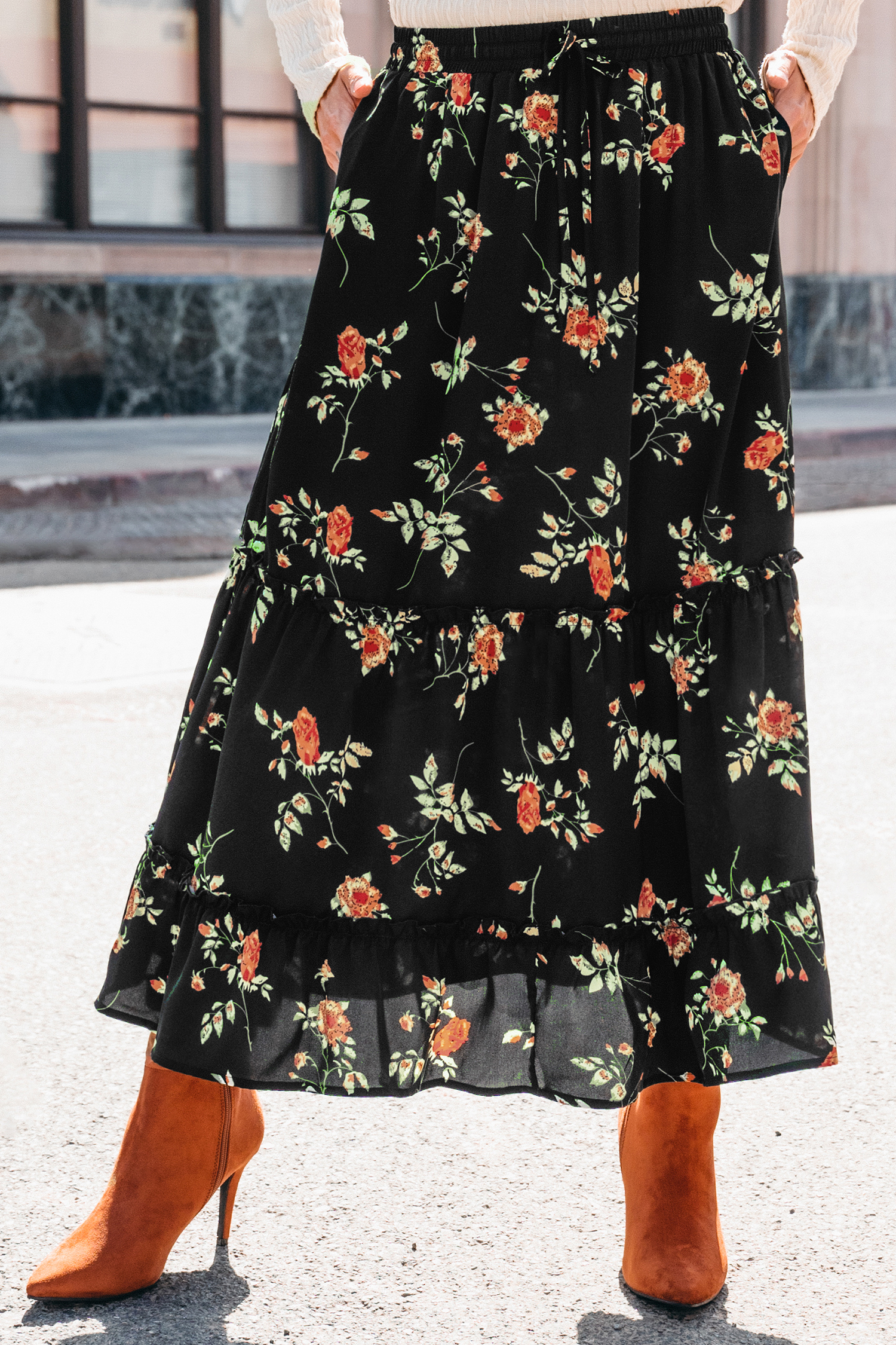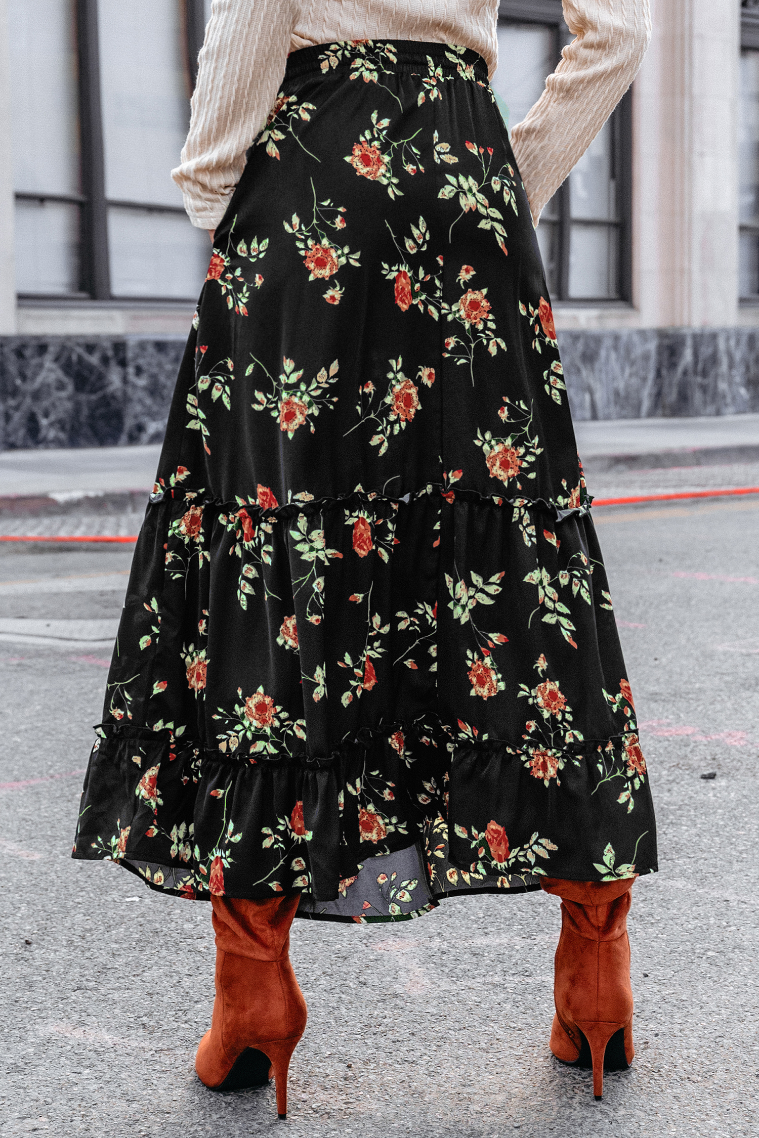 Black Floral Elastic Waist Maxi Skirt