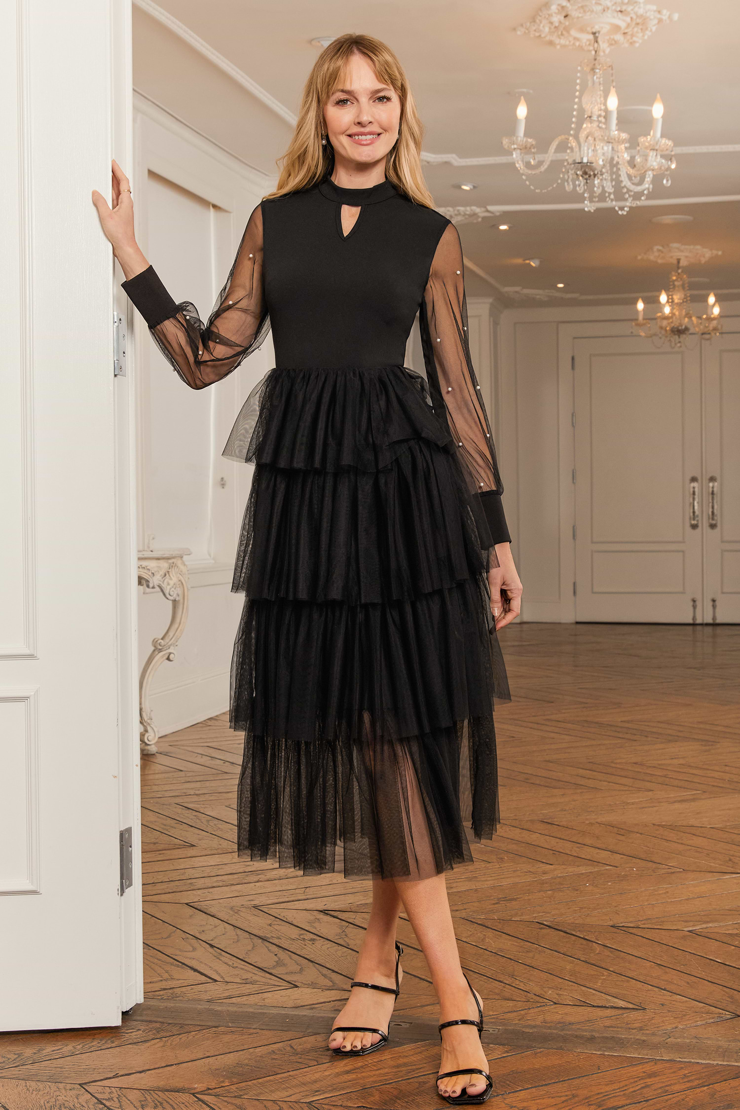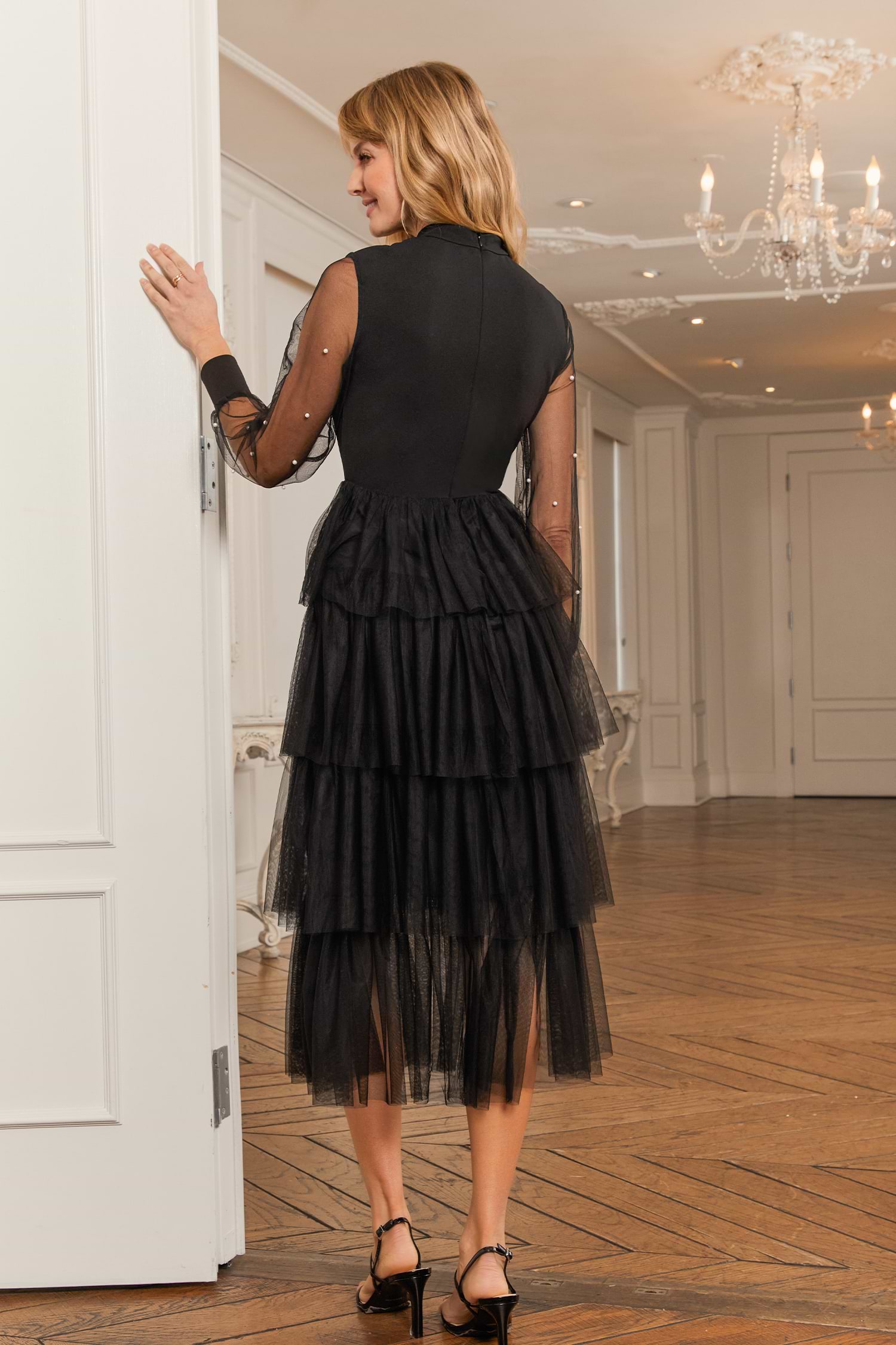 HomeBlack High Neck Sheer Sleeve Tiered Mesh Midi Dress