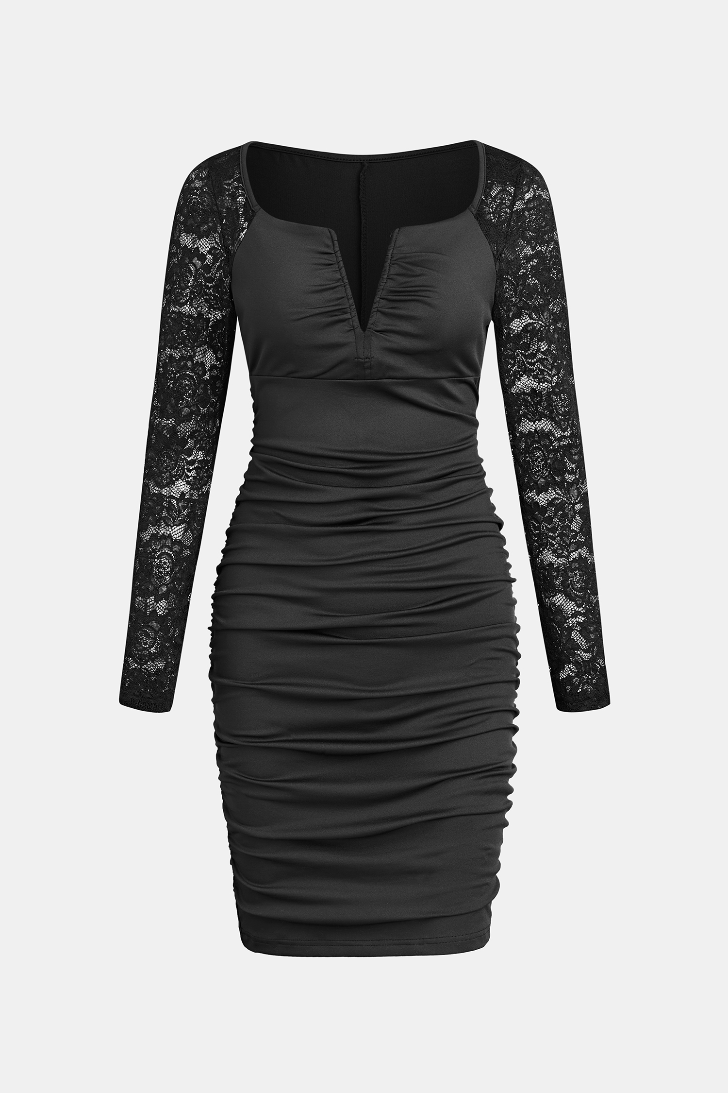 Black Lace Sleeve V-Neck Ruched Dress
