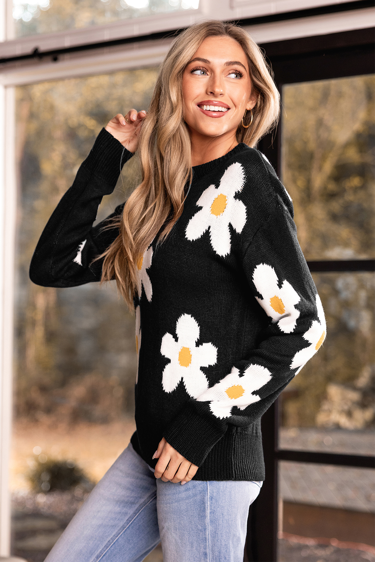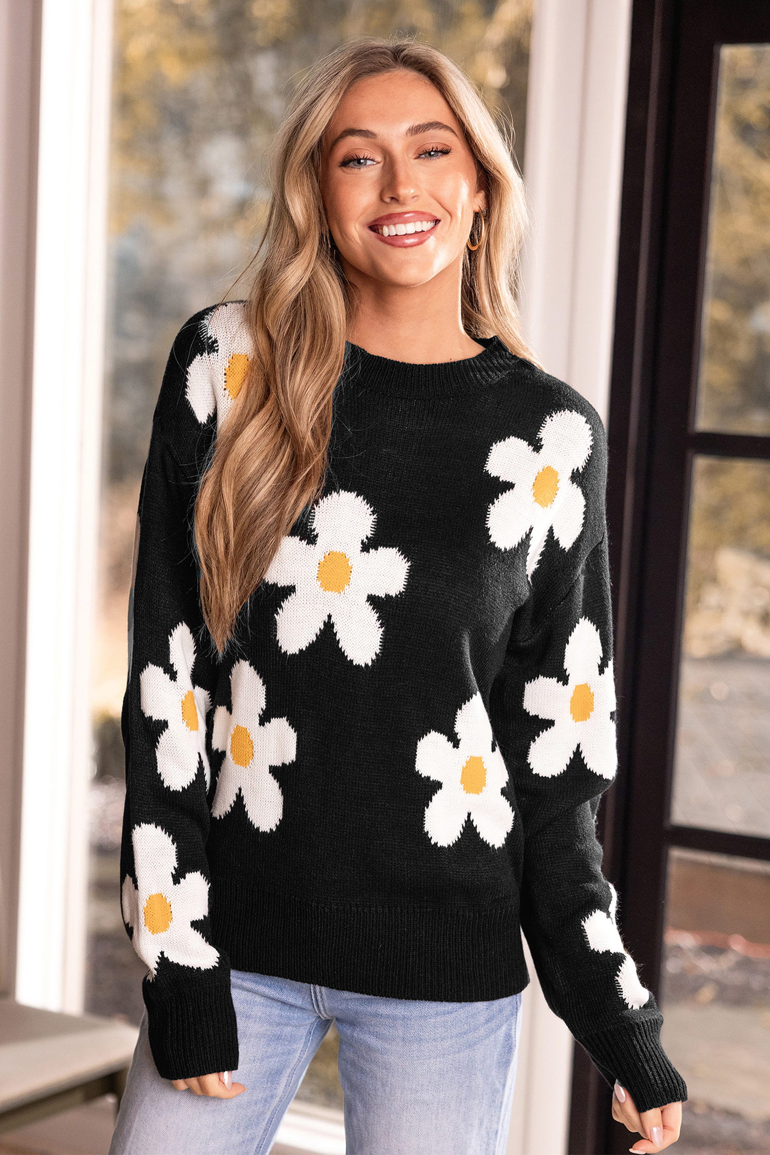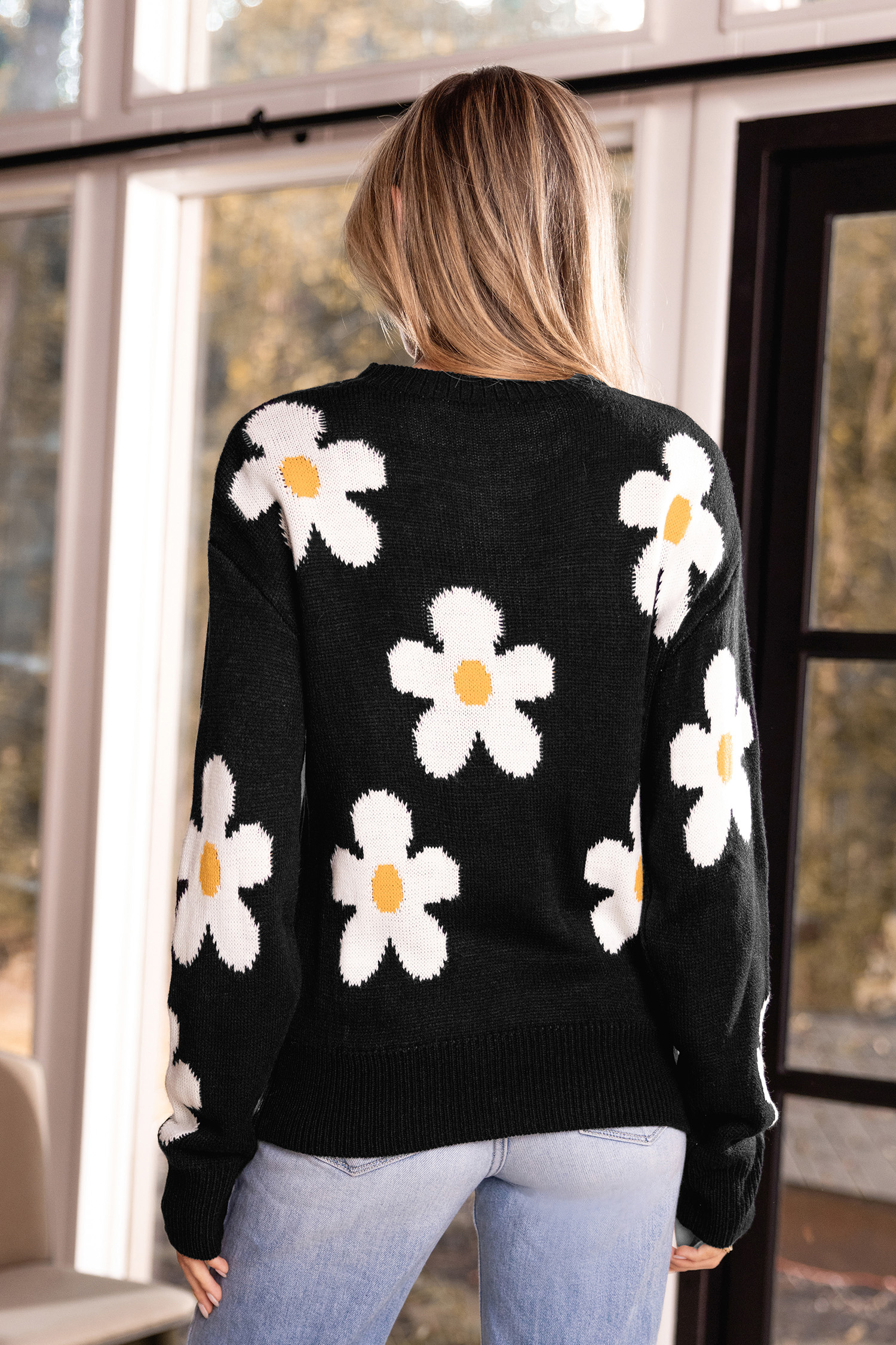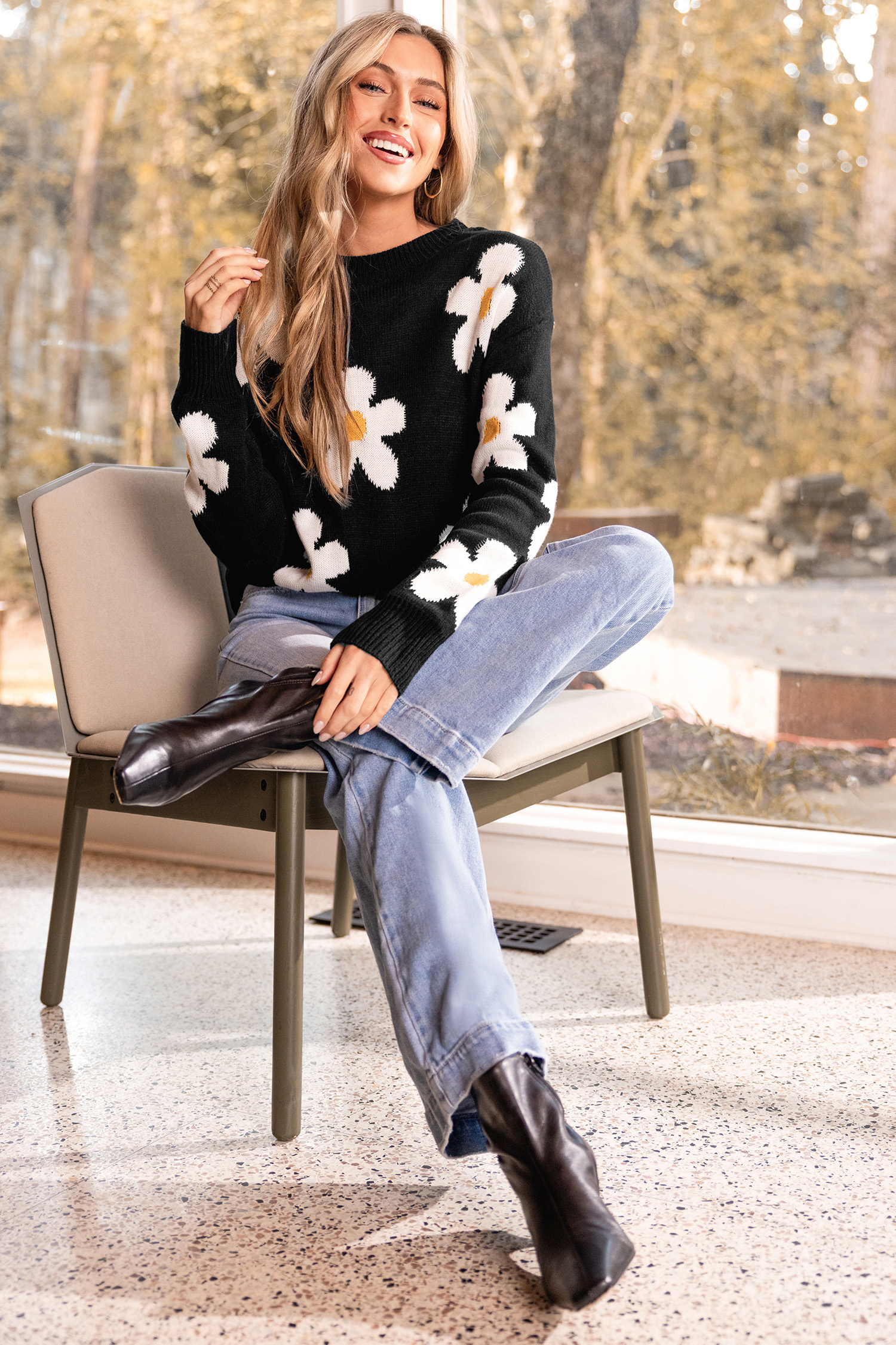 Black Long Sleeve Intarsia Knit Daisy Sweater
