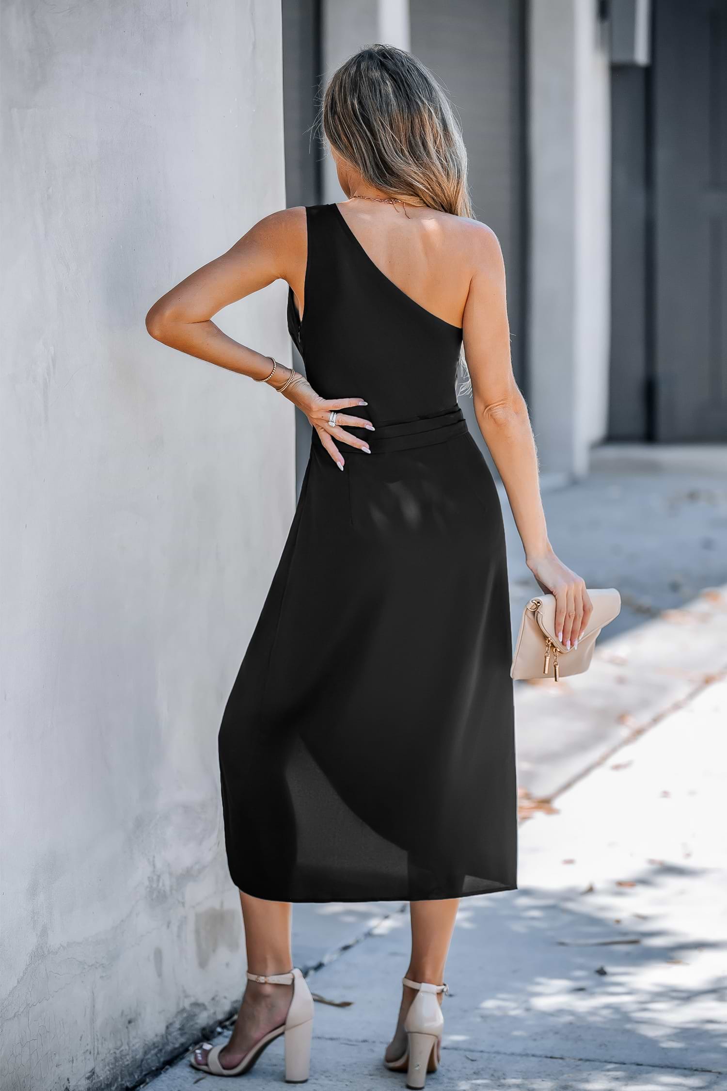 Black One-Shoulder Ruched Midi Dress