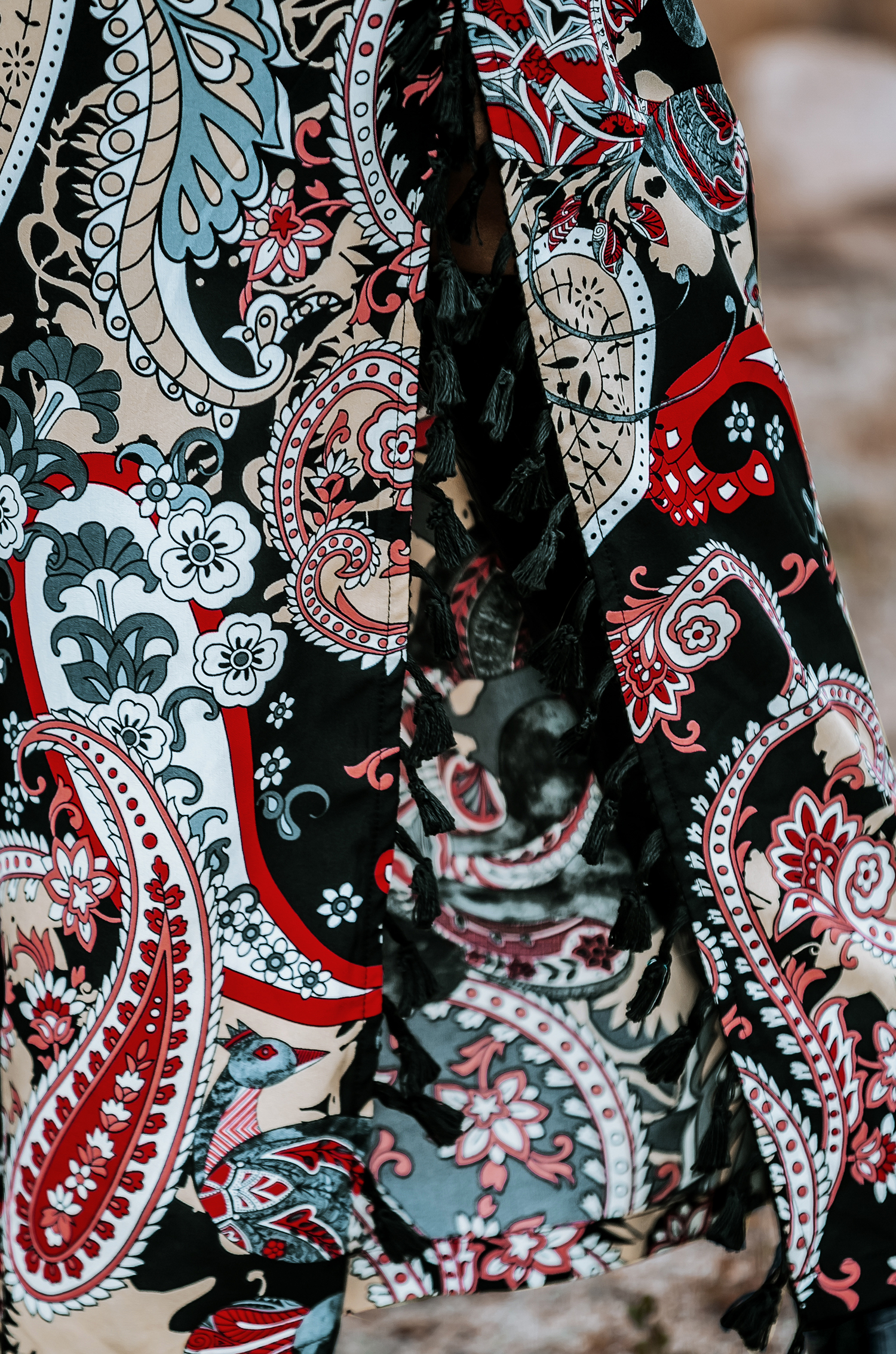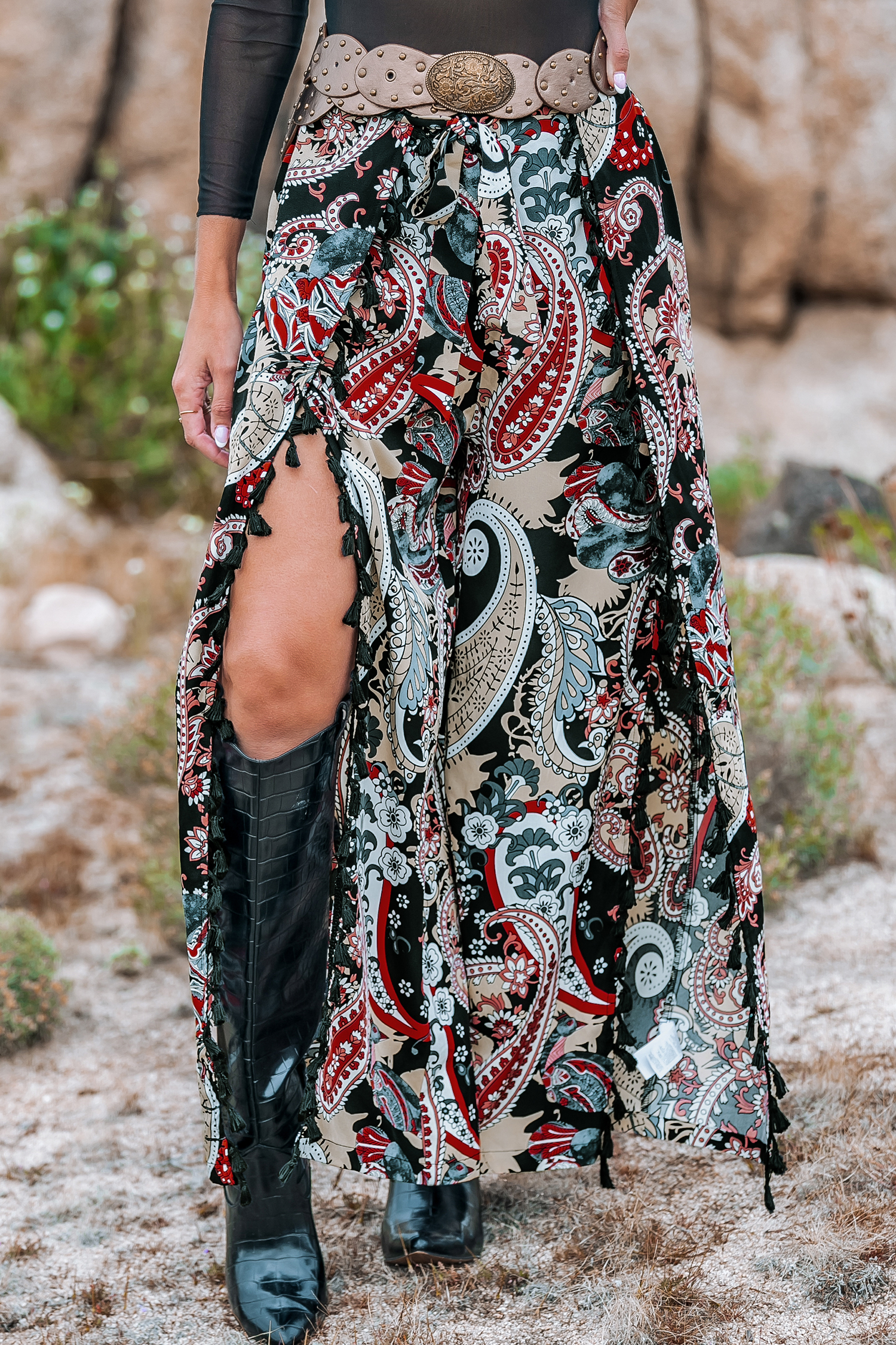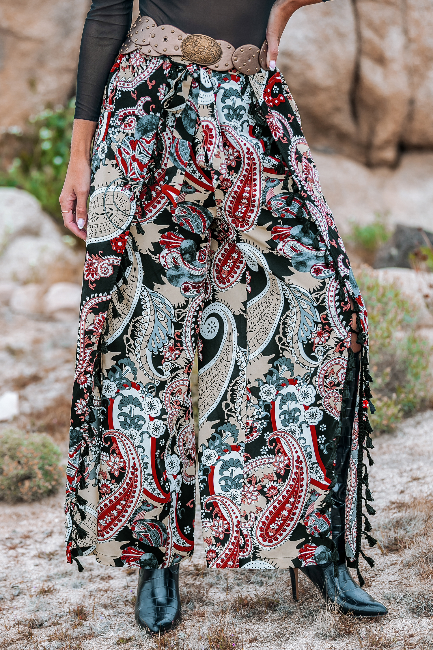 HomeBlack & Red Paisley Wide Leg Tassel Pants