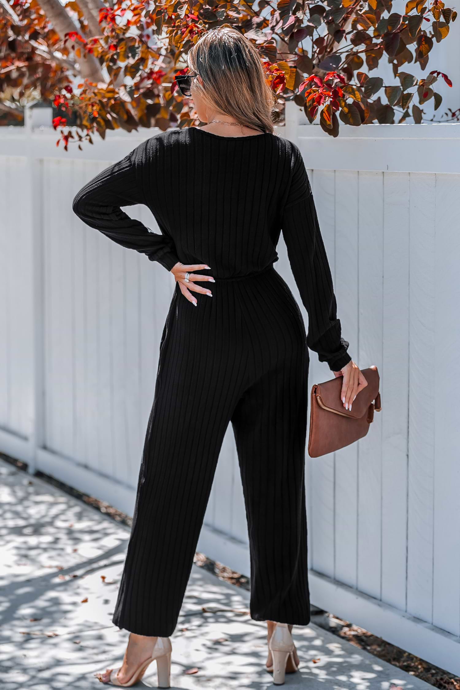 HomeBlack Ribbed Knit Long Sleeve Tapered Leg Jumpsuit