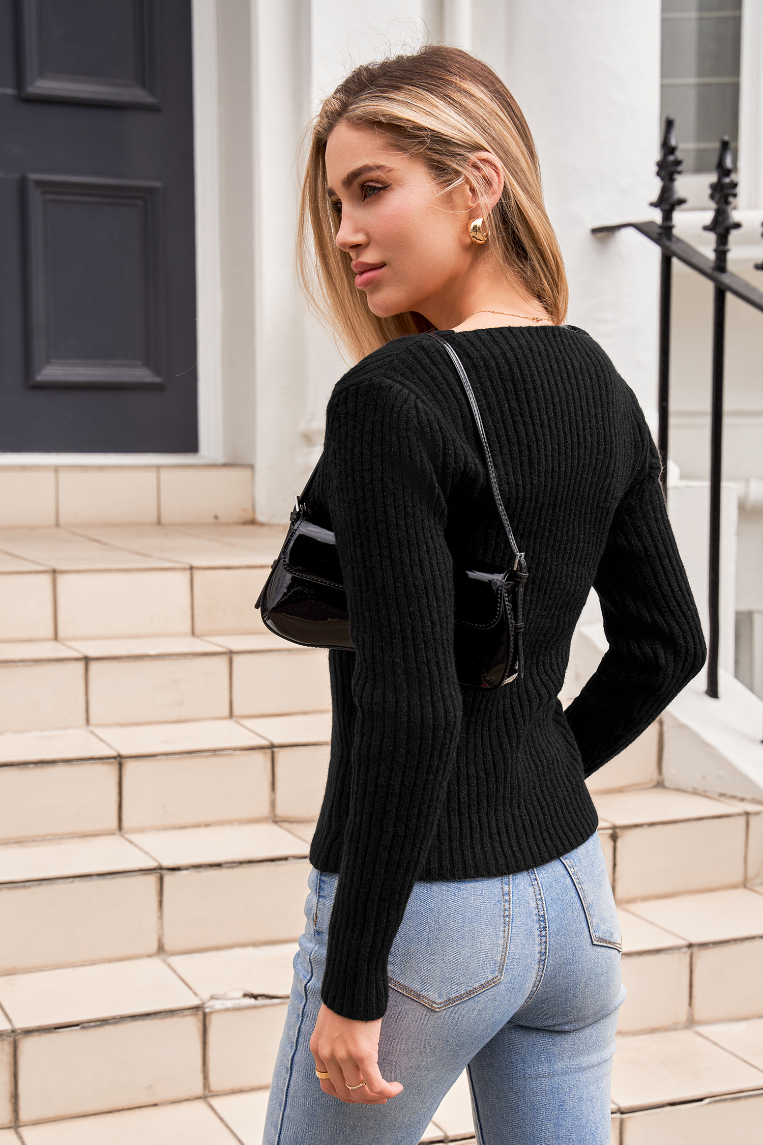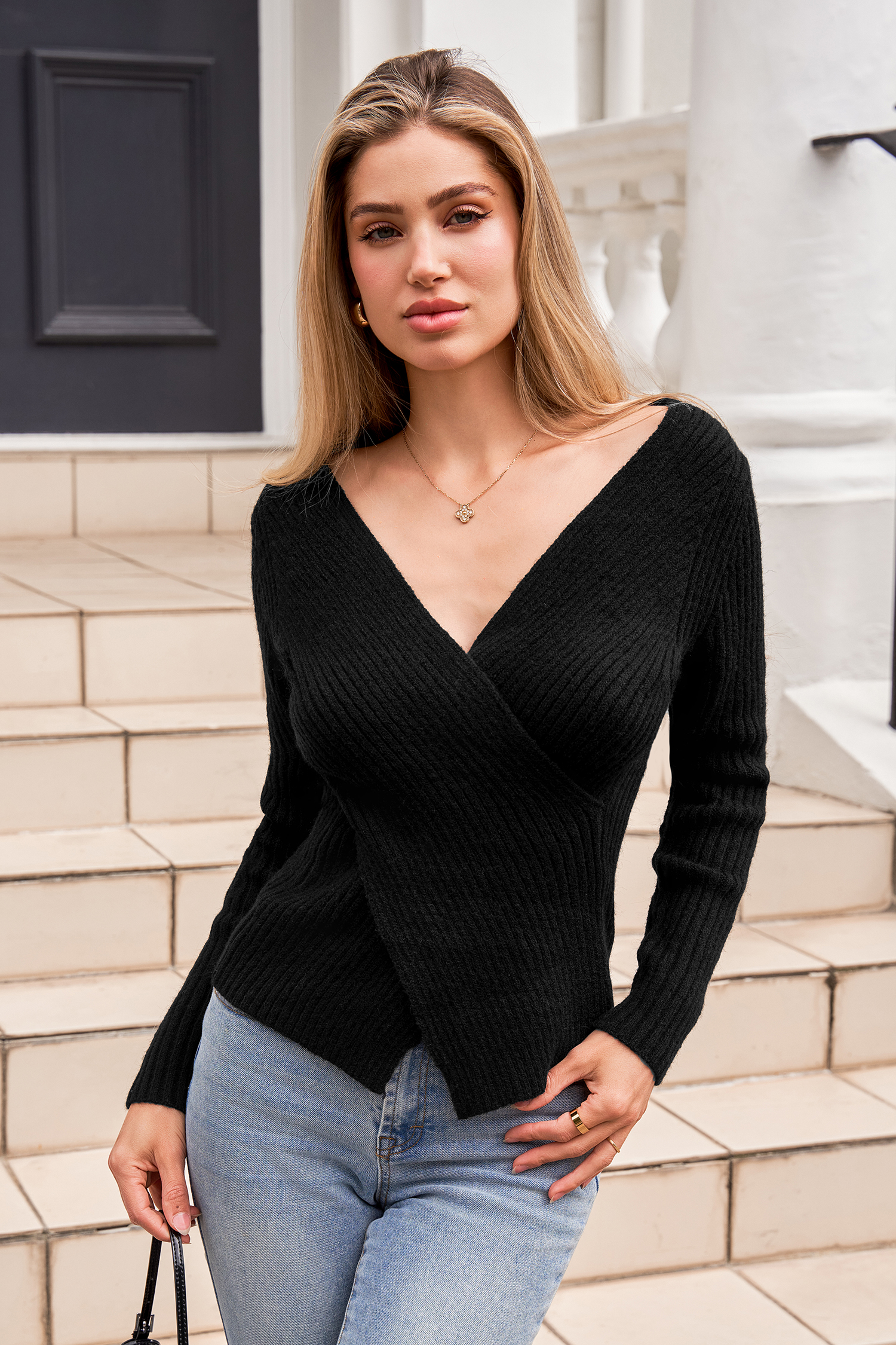 Black Ribbed Knit V-Neck Long Sleeve Wrap Sweater