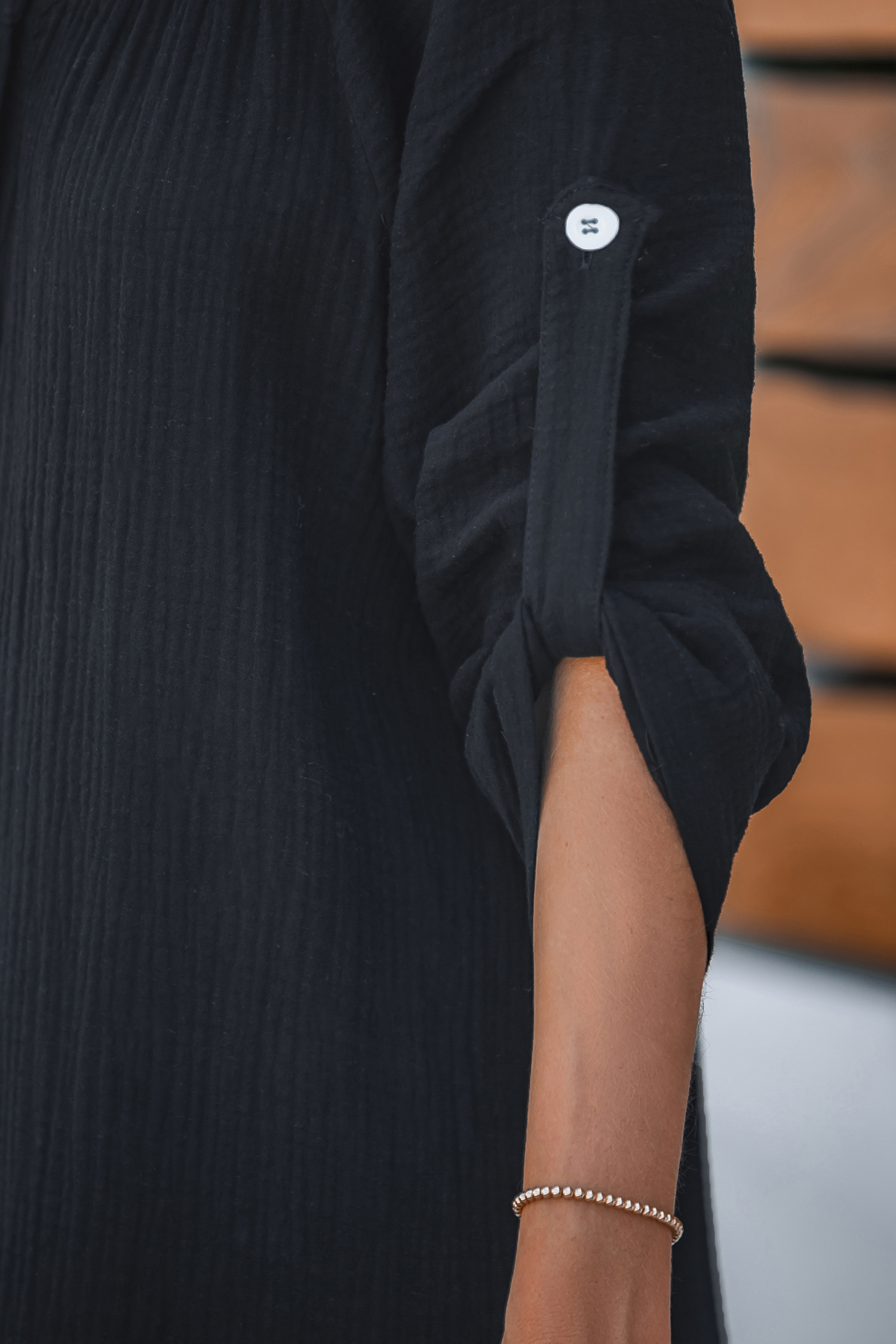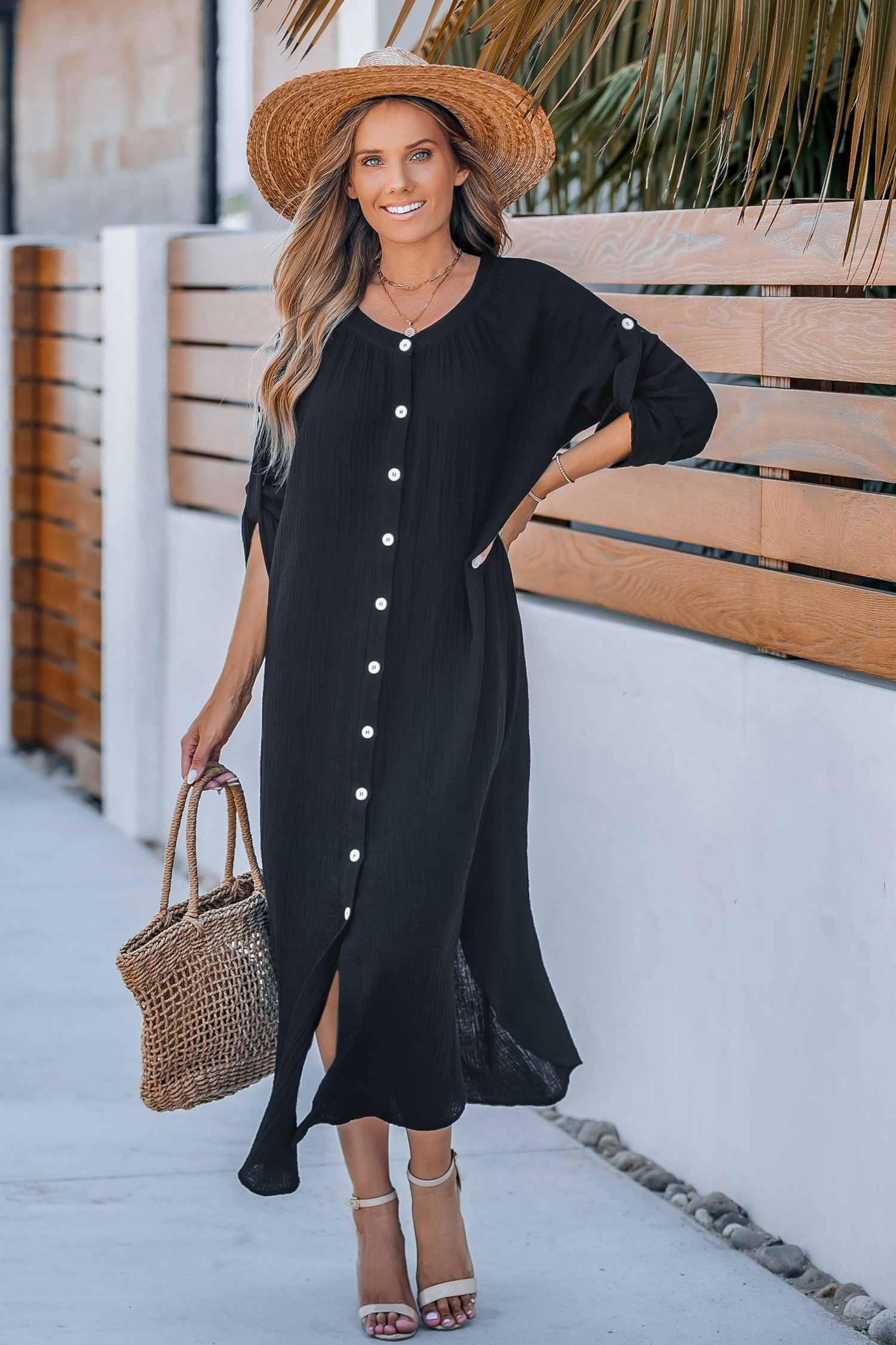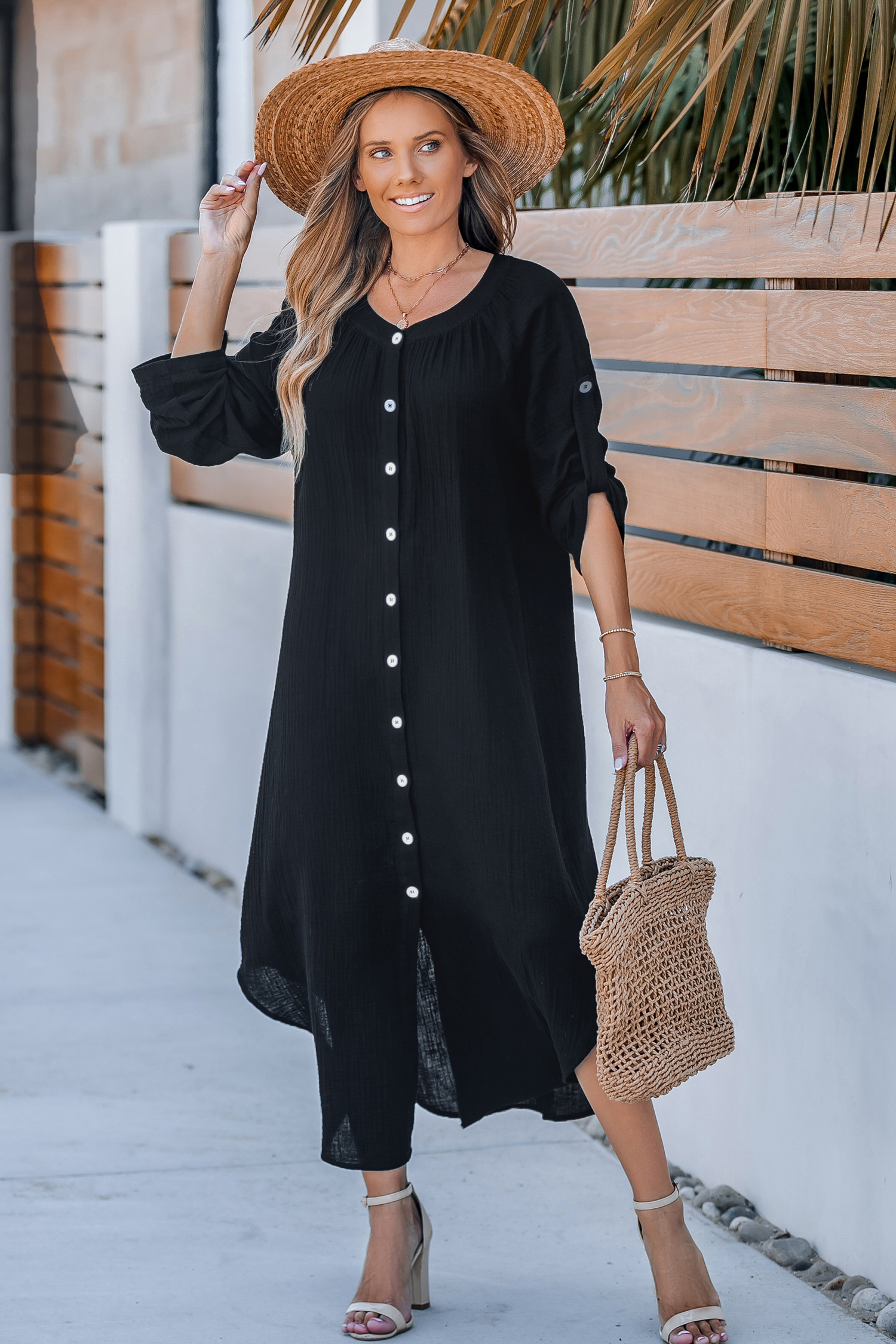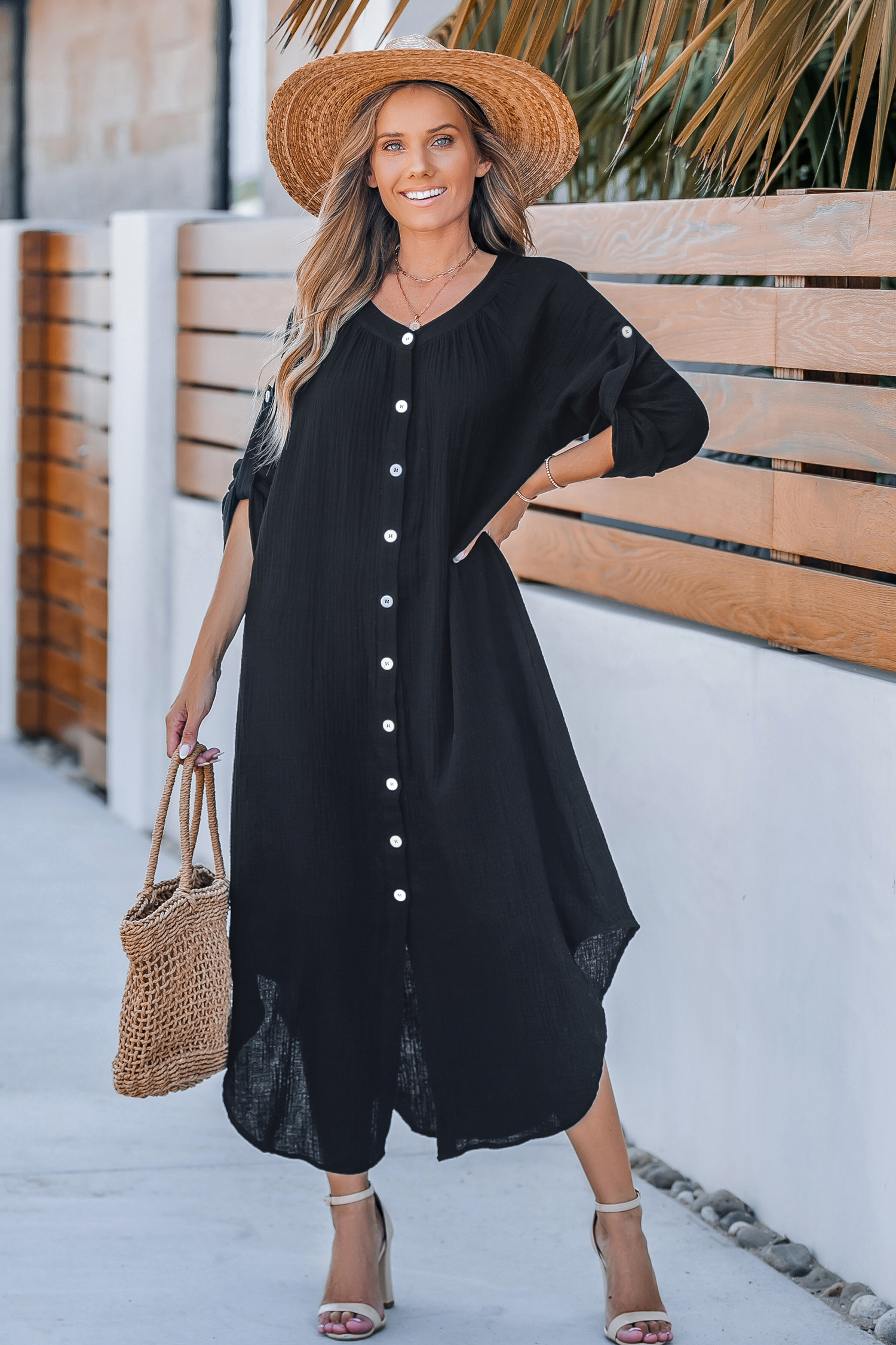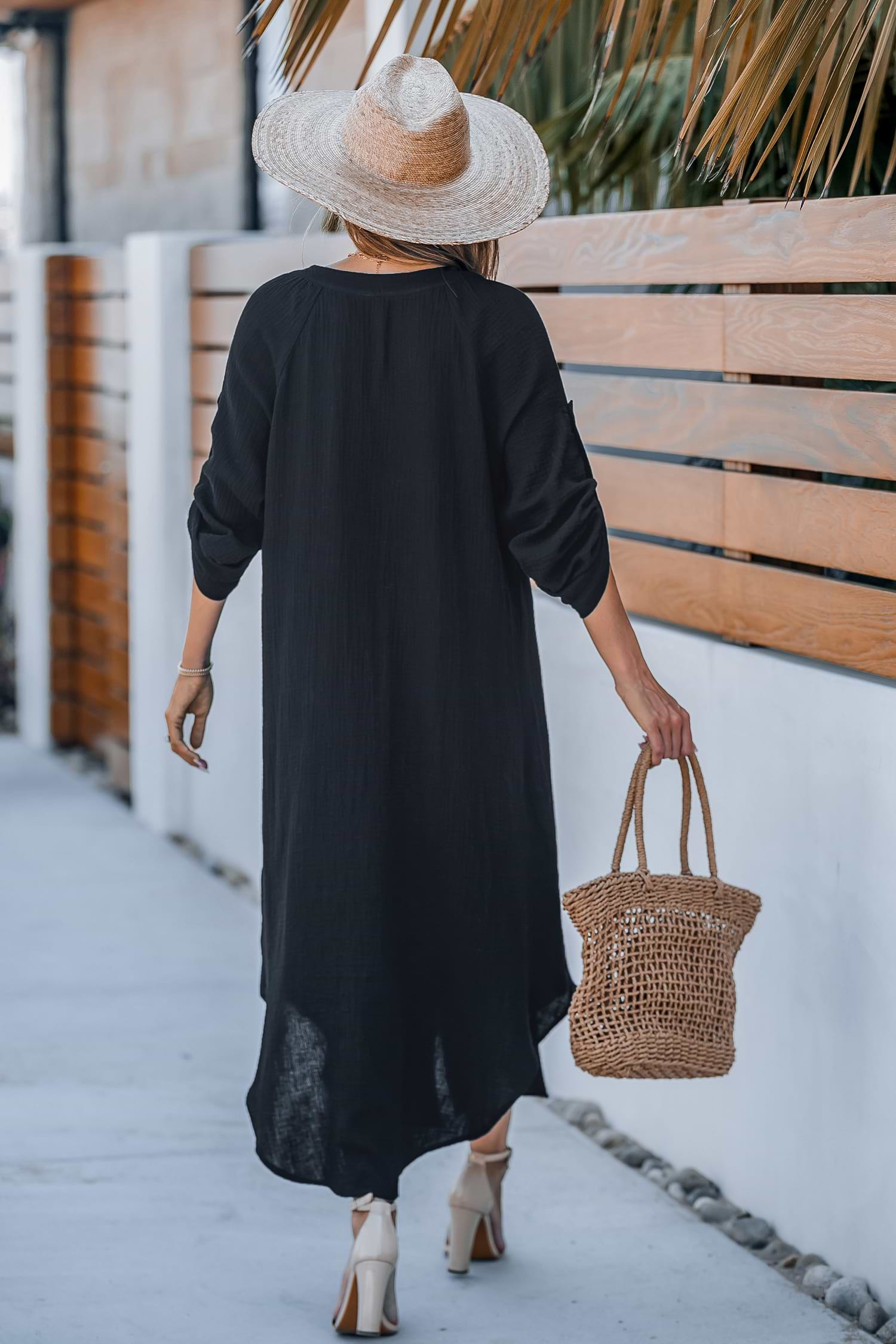 Black Round Neck Curved Hem Loose Fit Midi Dress