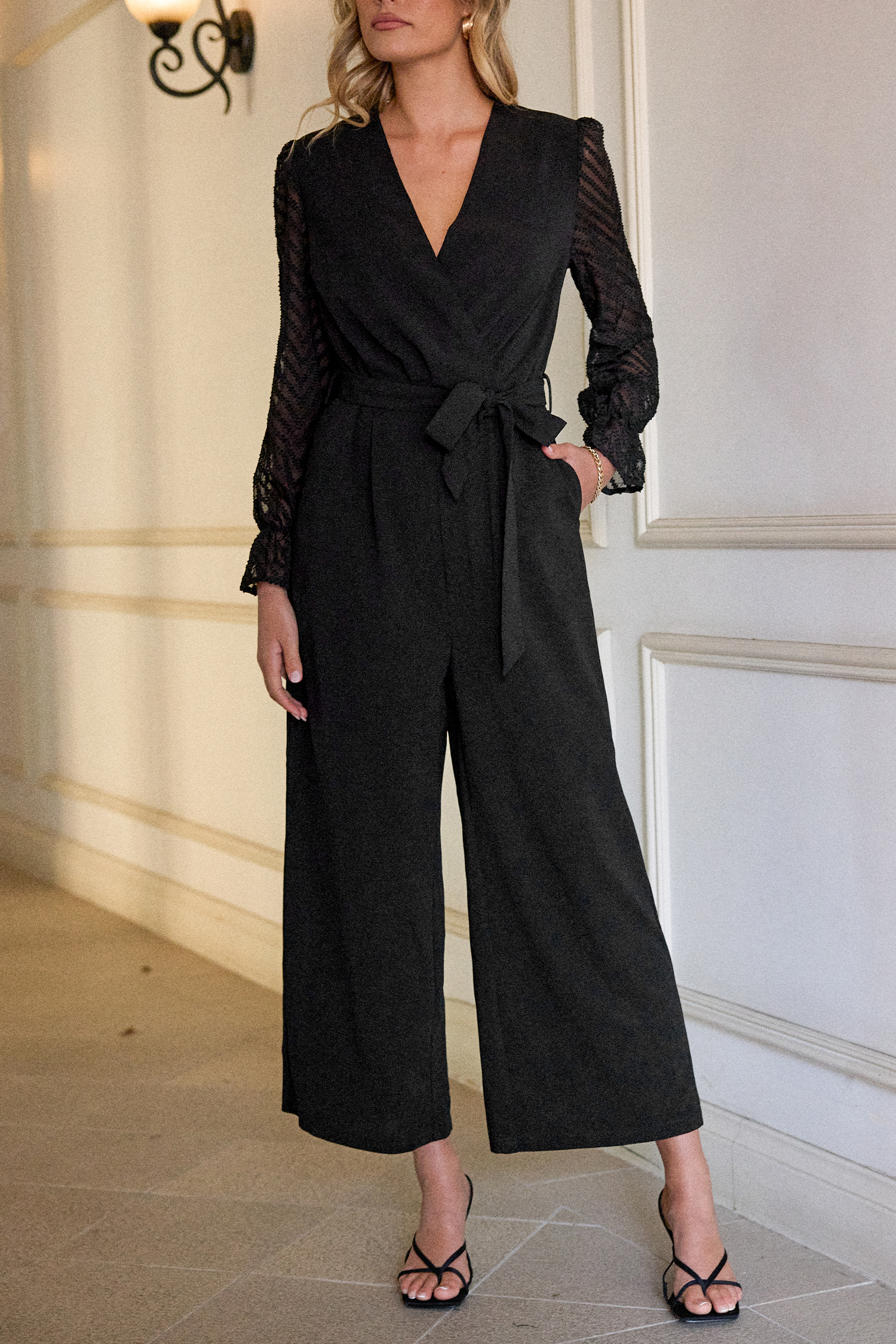 Black Sheer Sleeve Straight Leg Jumpsuit