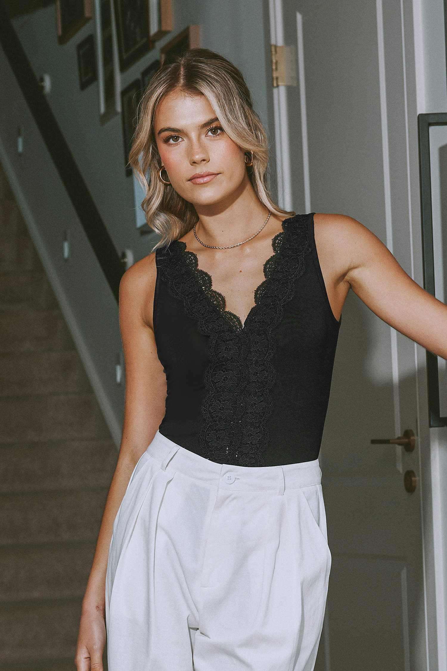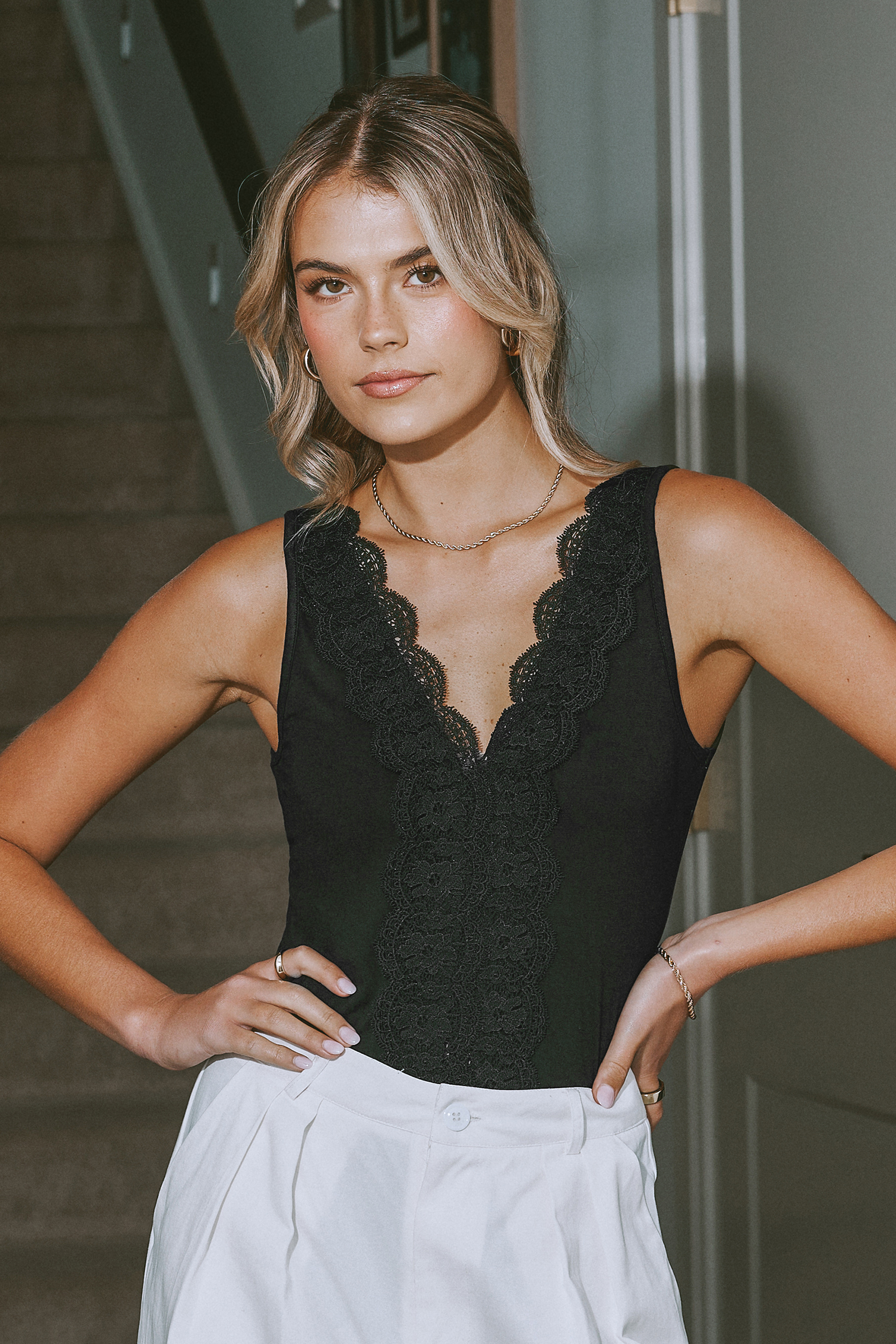 Black Sleeveless Scalloped Lace V-Neck Bodysuit