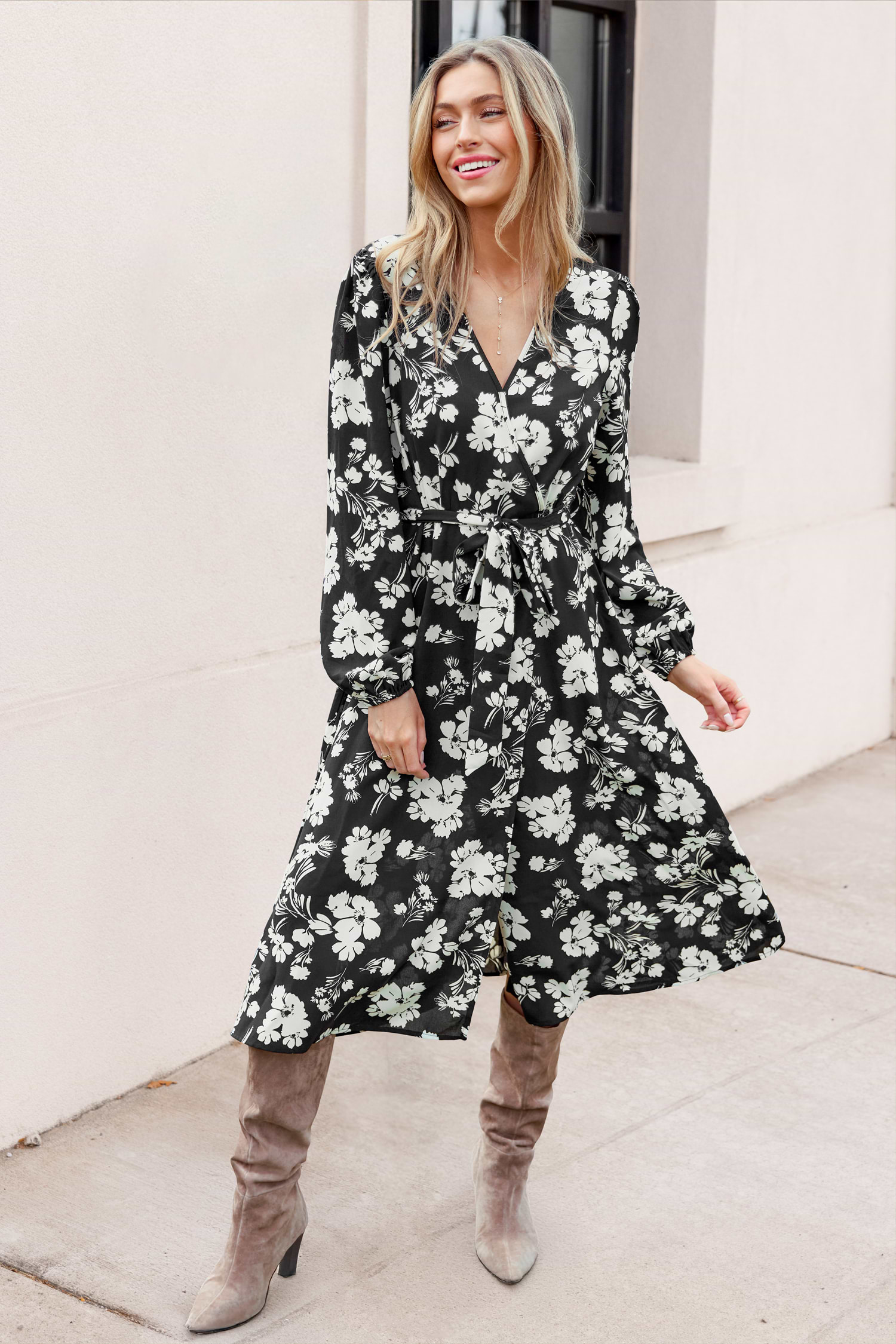 HomeBlack & White Floral Puff Sleeve Midi Dress