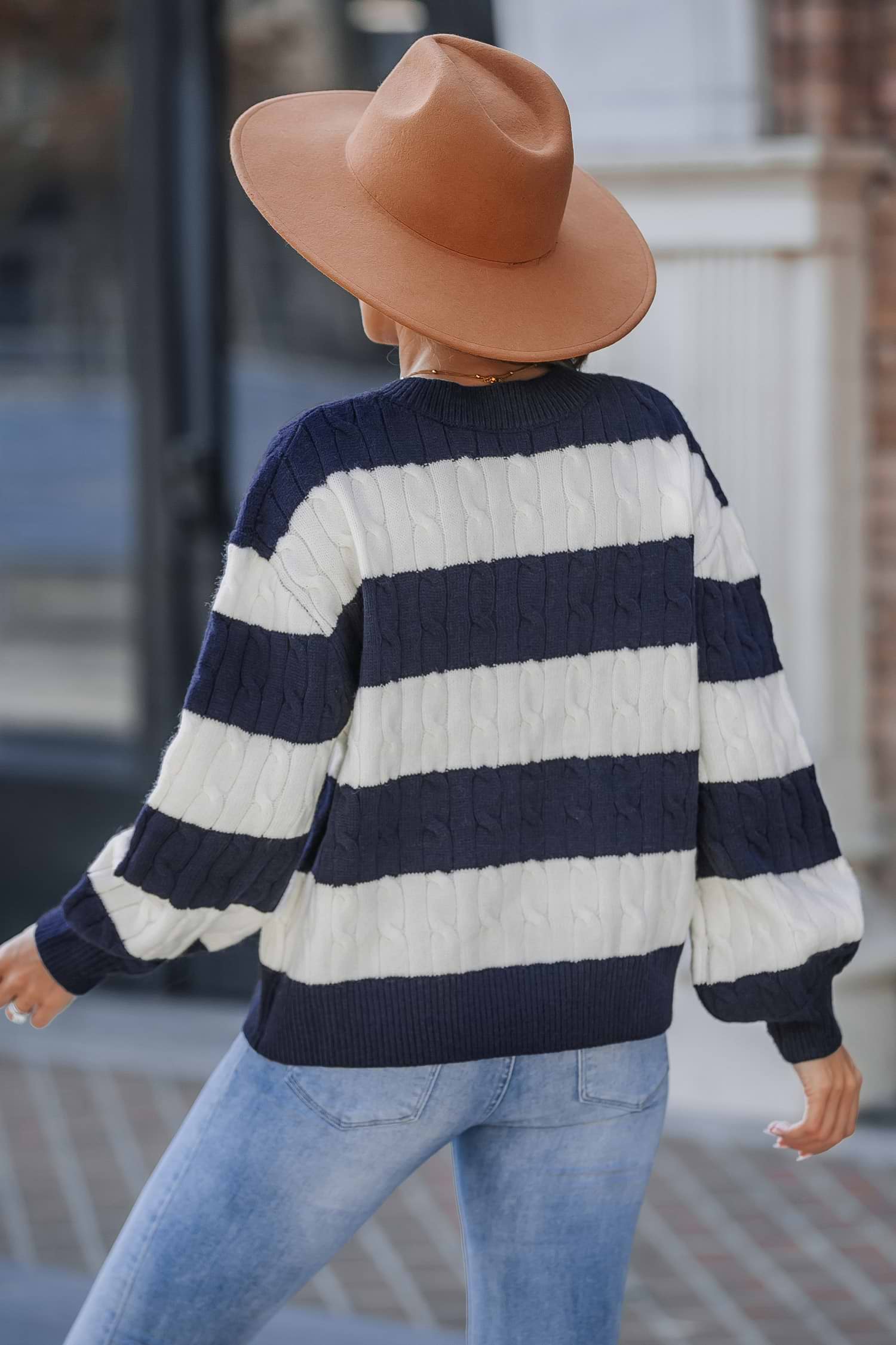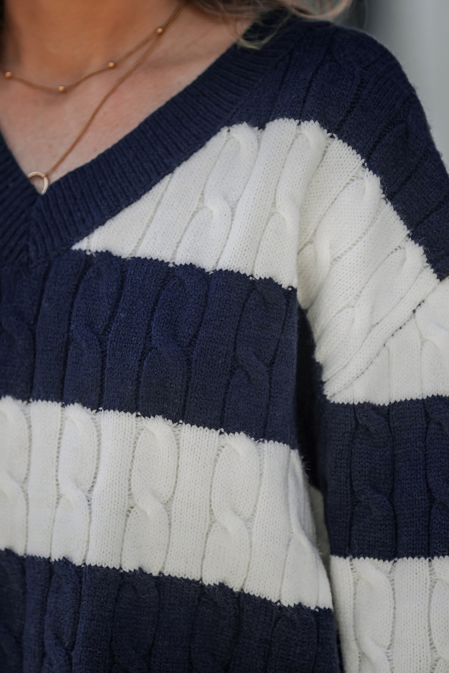 Black & White Stripe V-Neck Long Sleeve Cable Knit Sweater