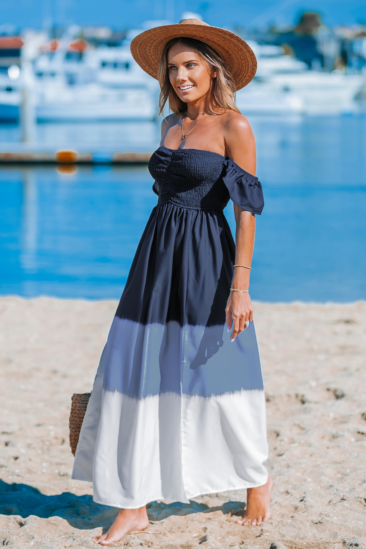 Blue Ombre Sweetheart Off-Shoulder Flutter Sleeve Maxi Dress