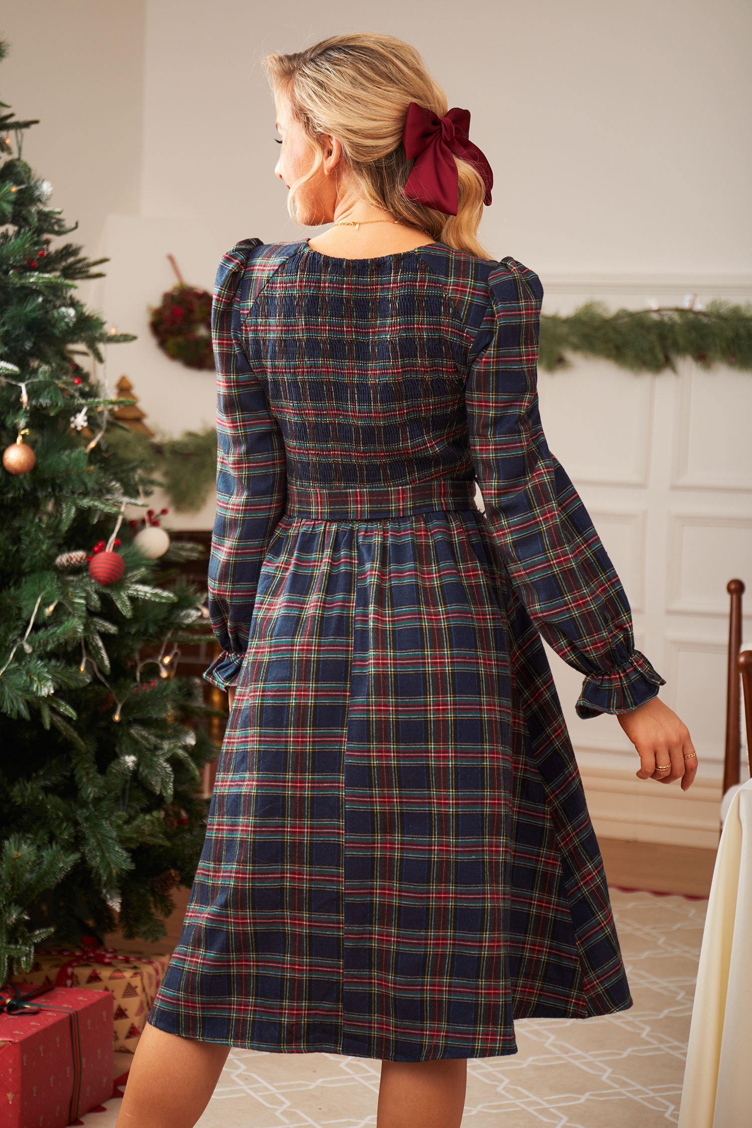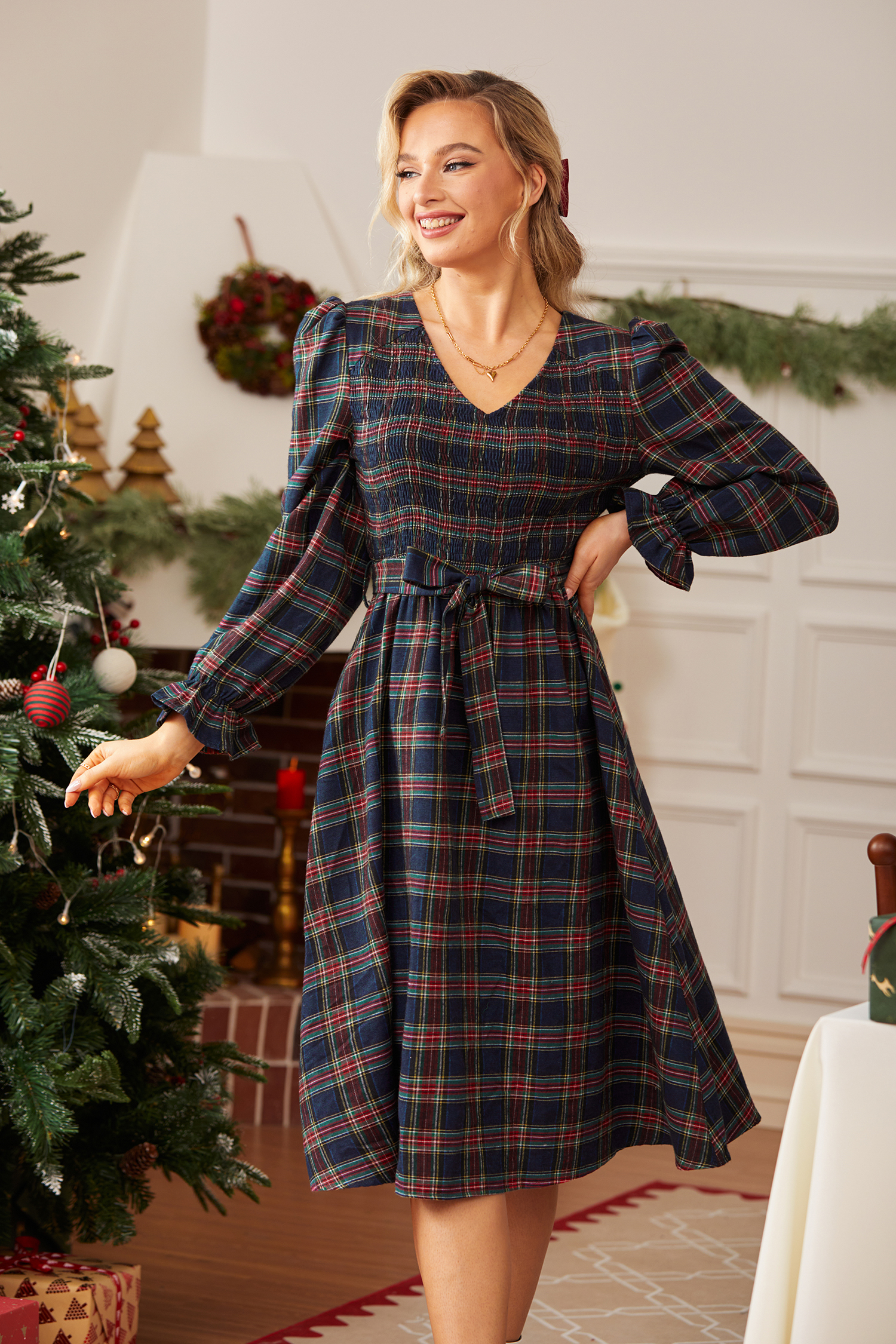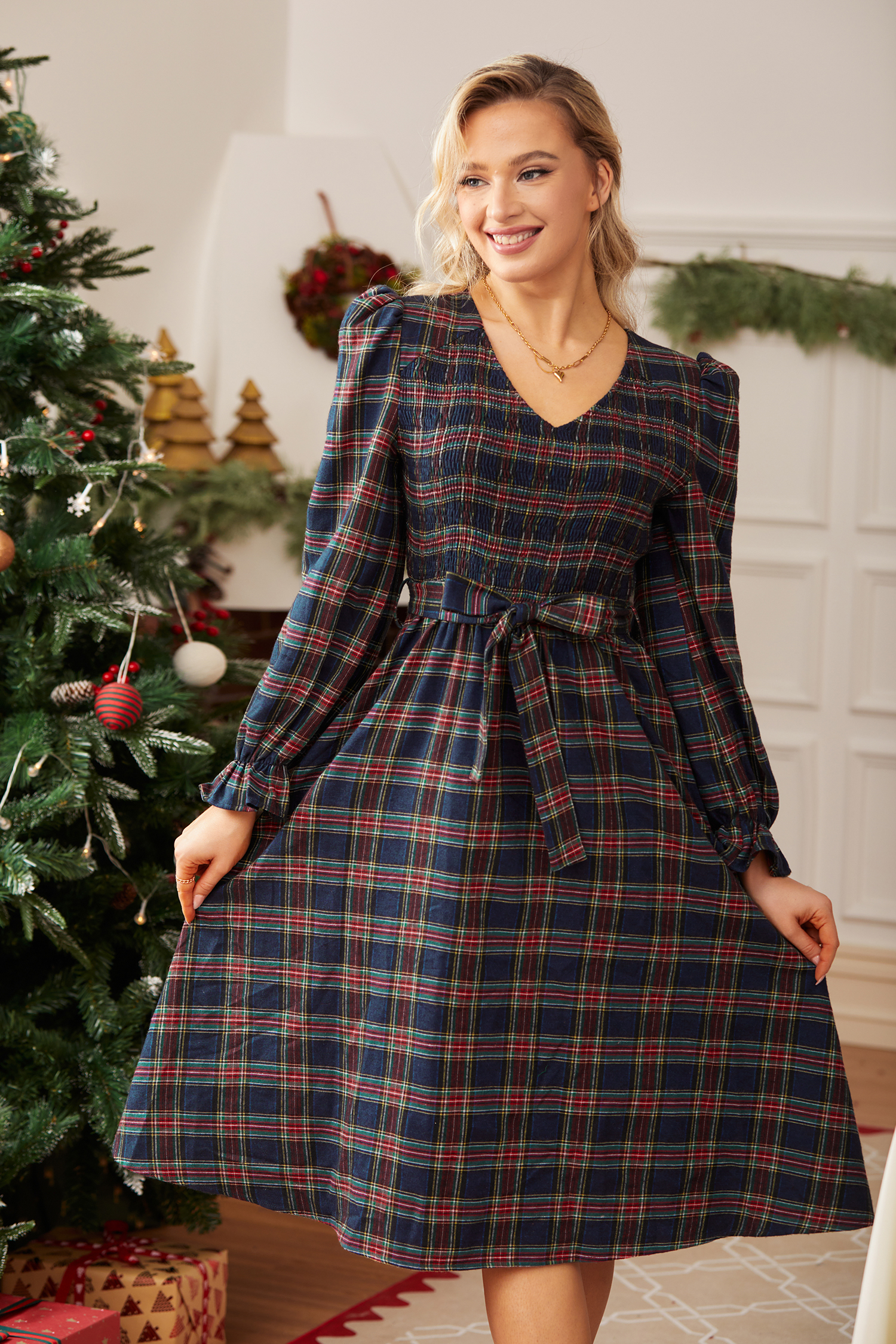 HomeBlue Plaid V-Neck Puff Shoulder Midi Dress