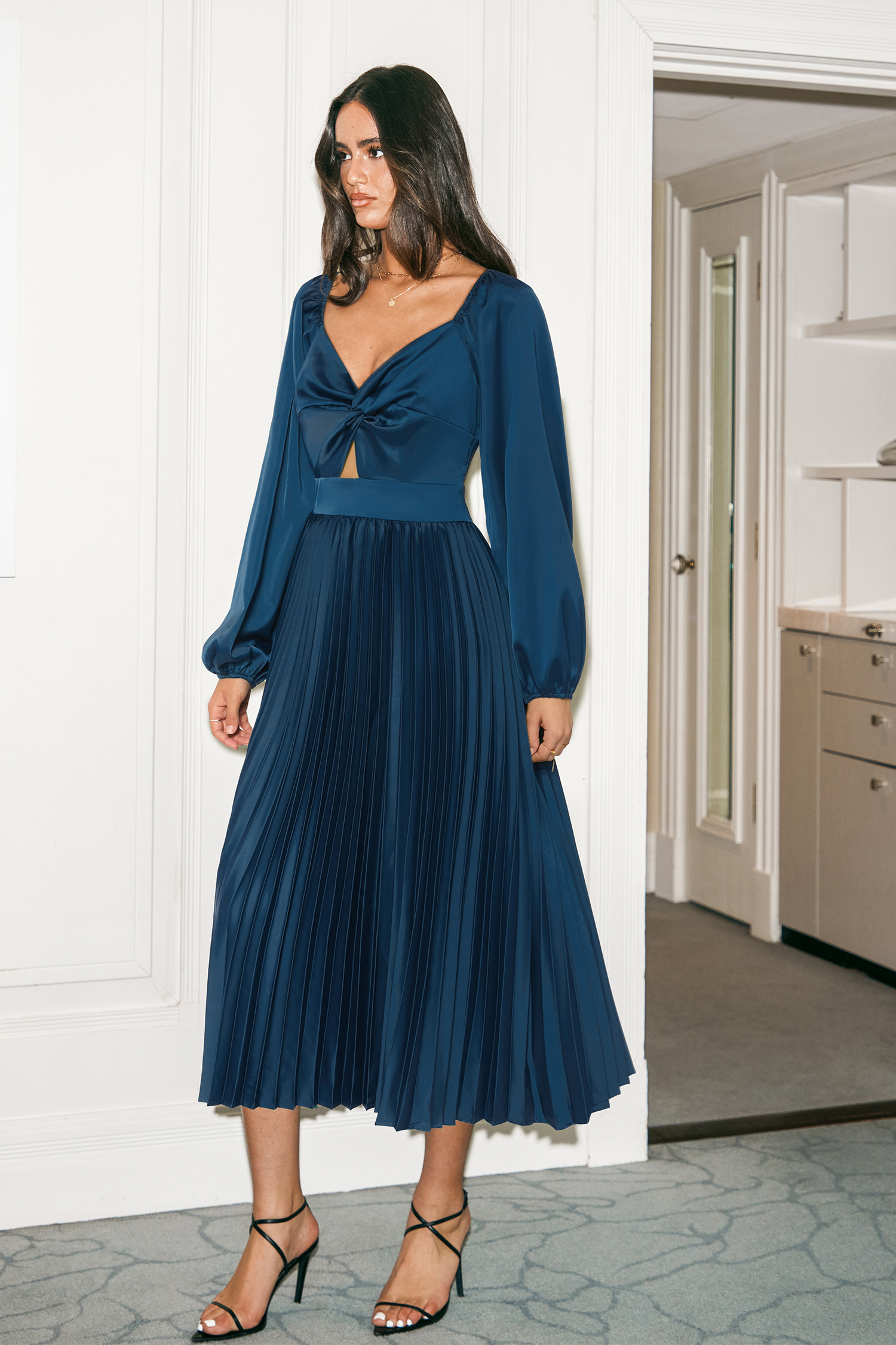 Blue Satin Sweetheart Puff Sleeve Midi Dress