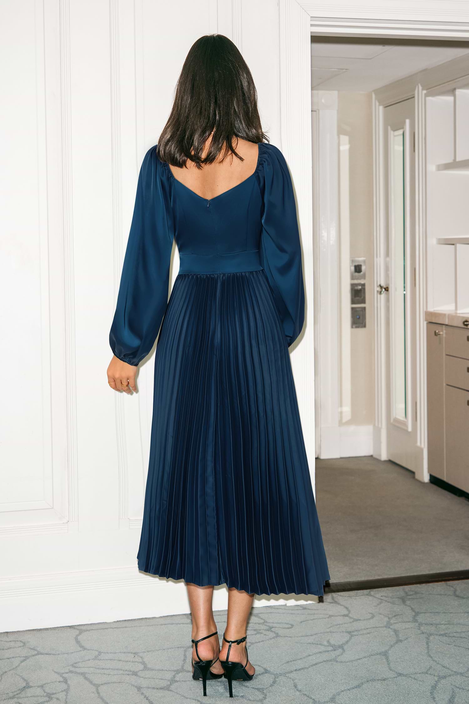 HomeBlue Satin Sweetheart Puff Sleeve Midi Dress