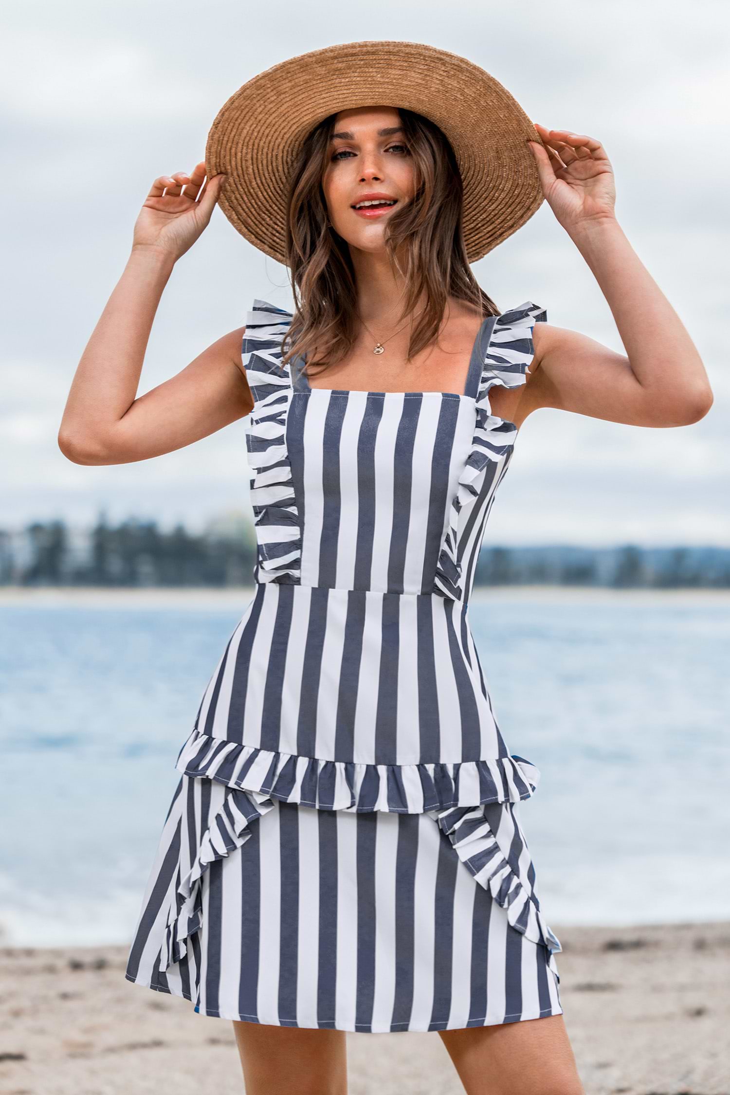 HomeBlue Stripe Square Neck Ruffle Mini Dress