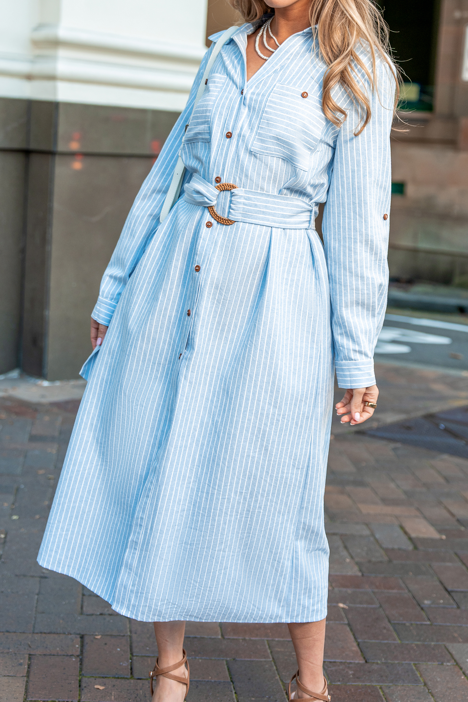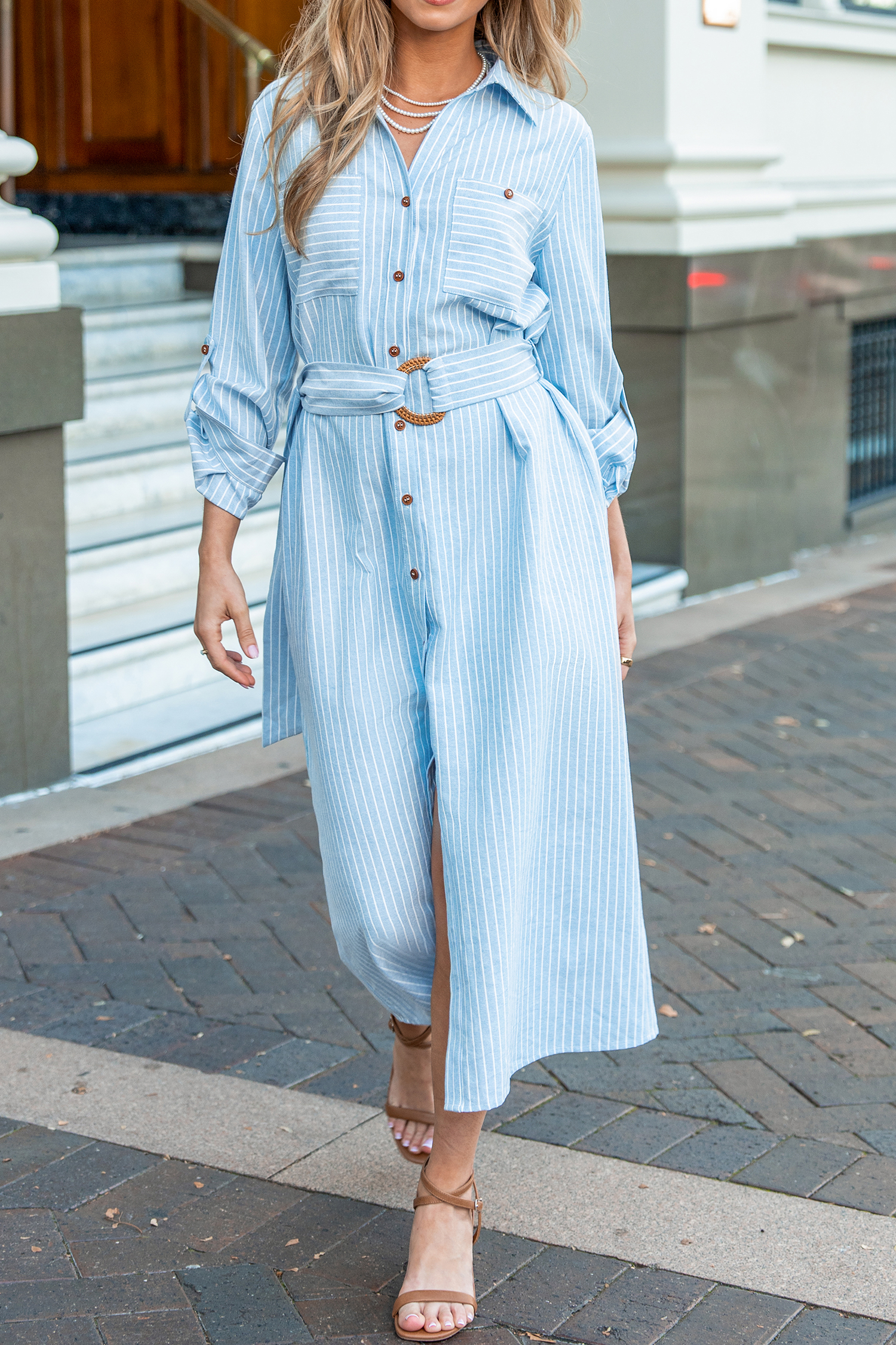 Blue Striped Collared Front Button Midi Shirt Dress