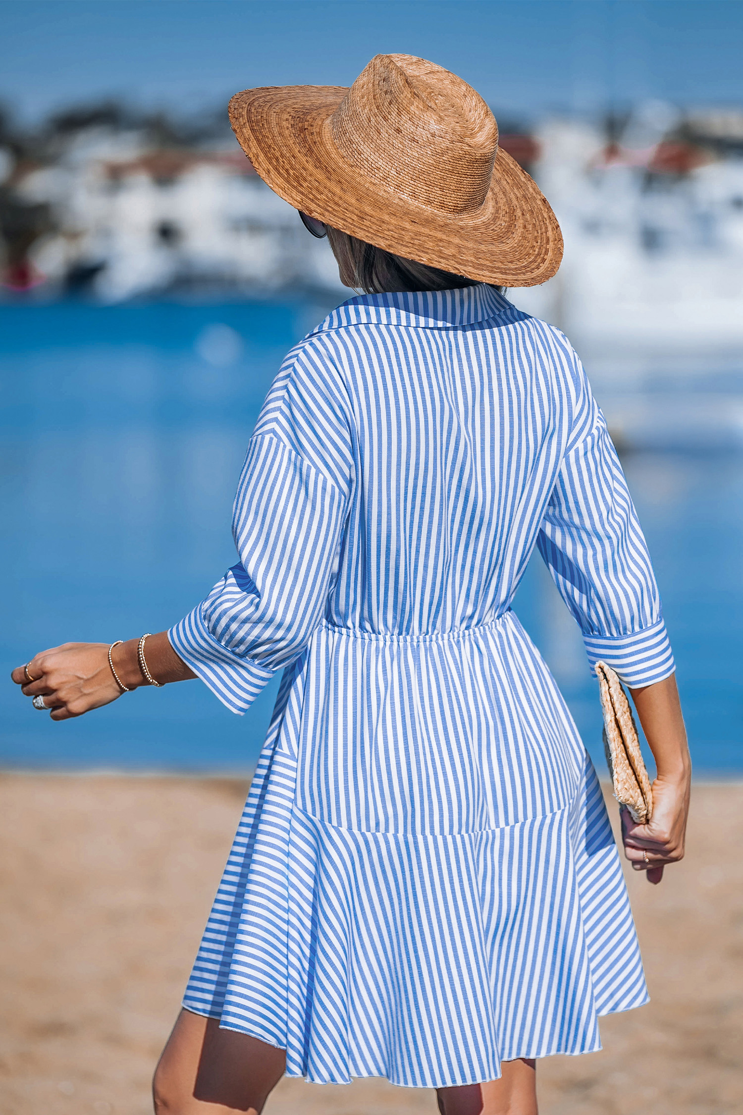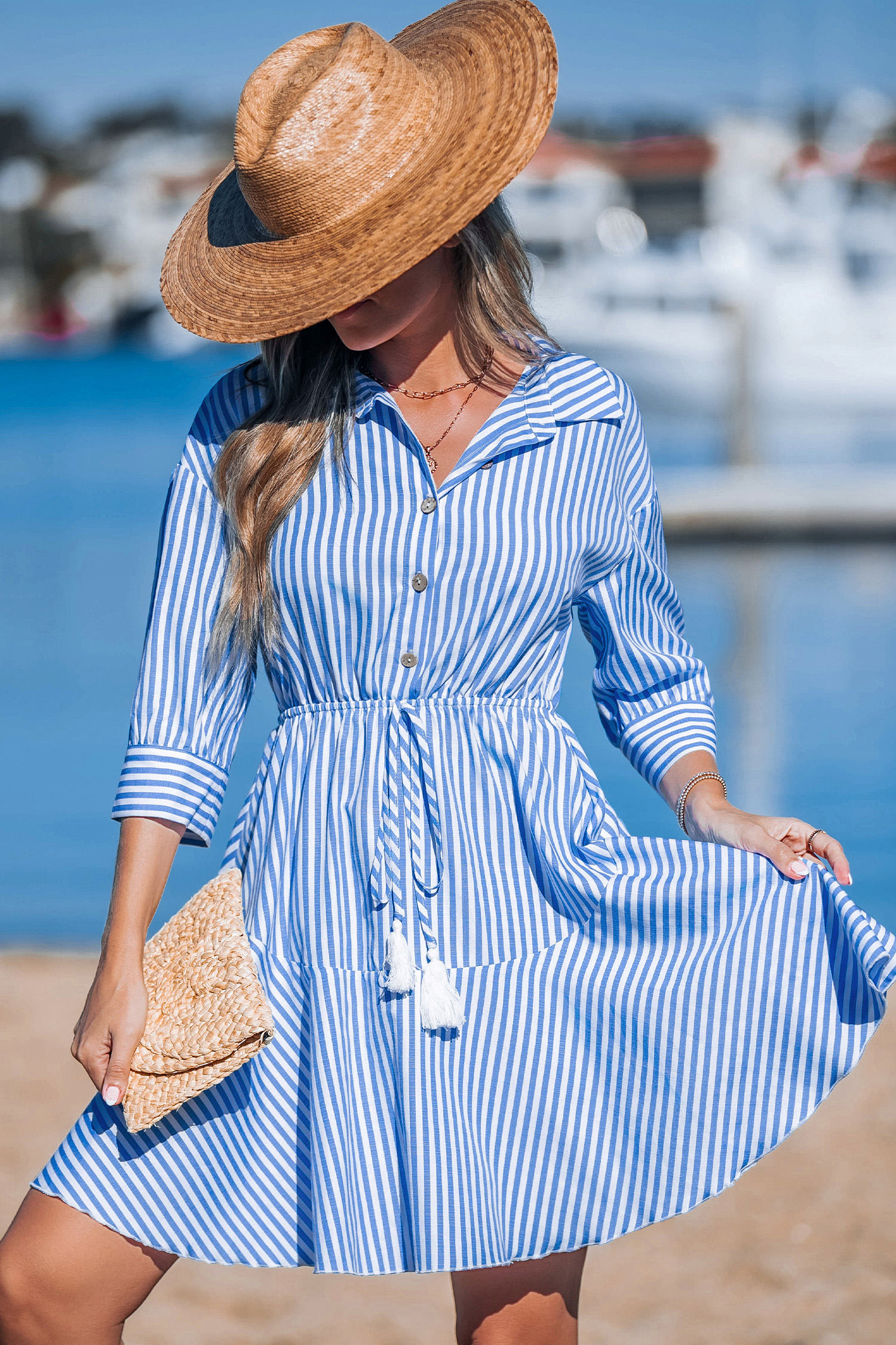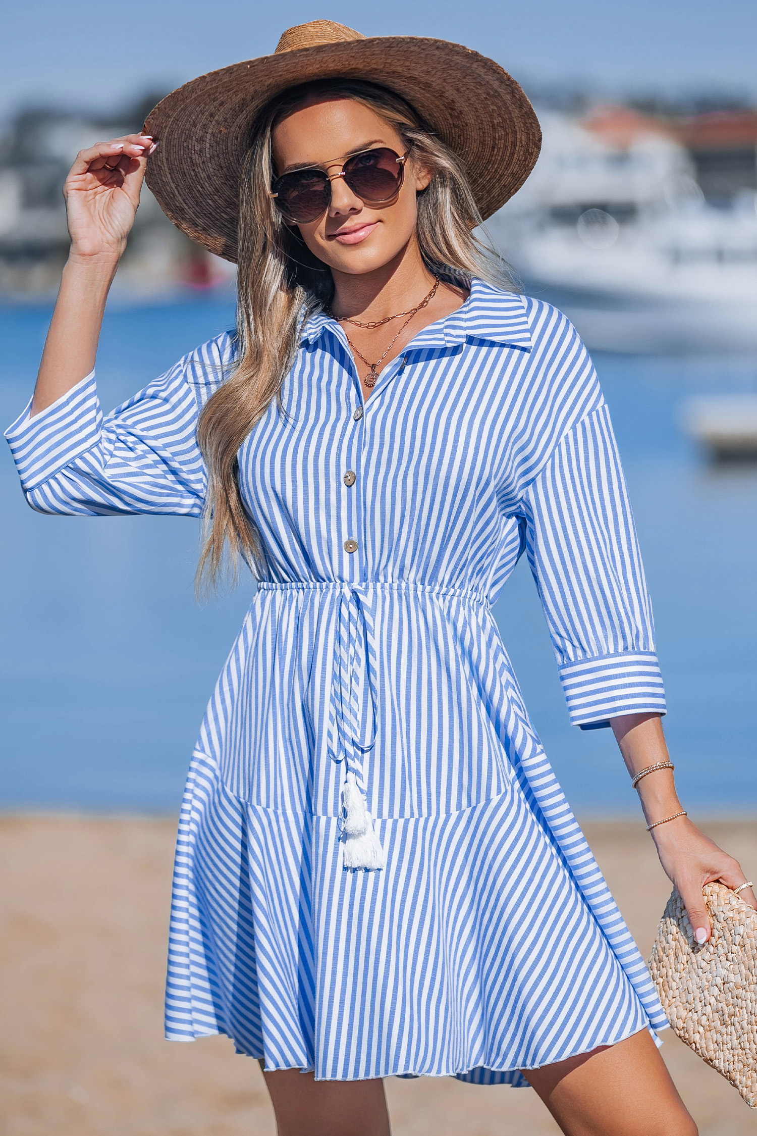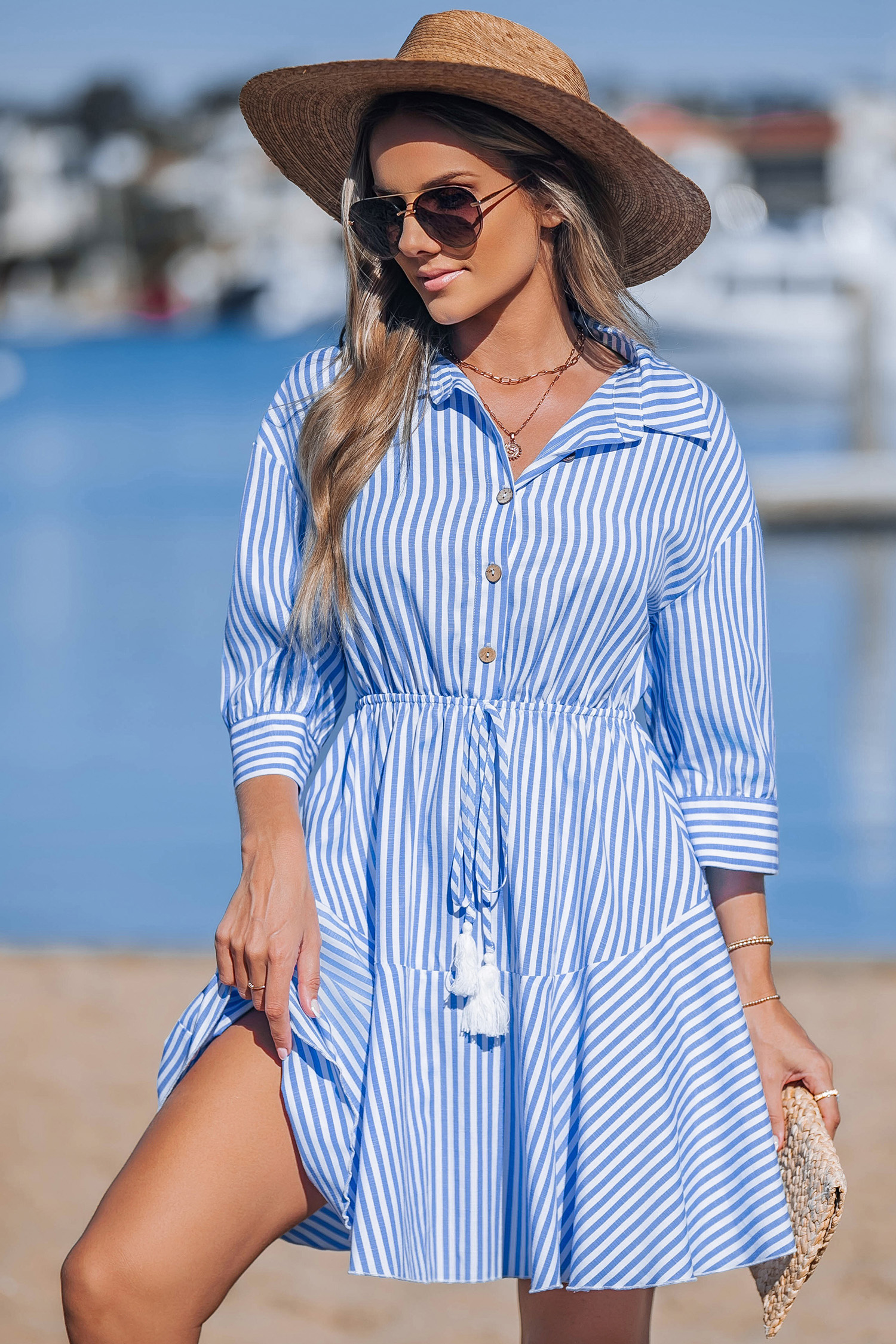 Blue Striped Collared Tassel Tie Waist Mini Shirt Dress