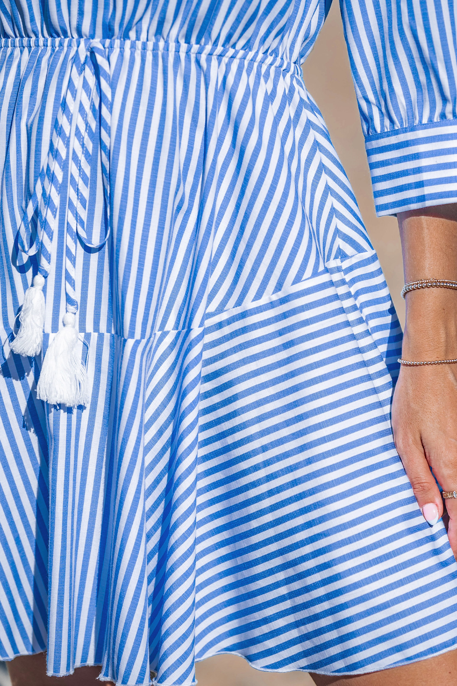 HomeBlue Striped Collared Tassel Tie Waist Mini Shirt Dress