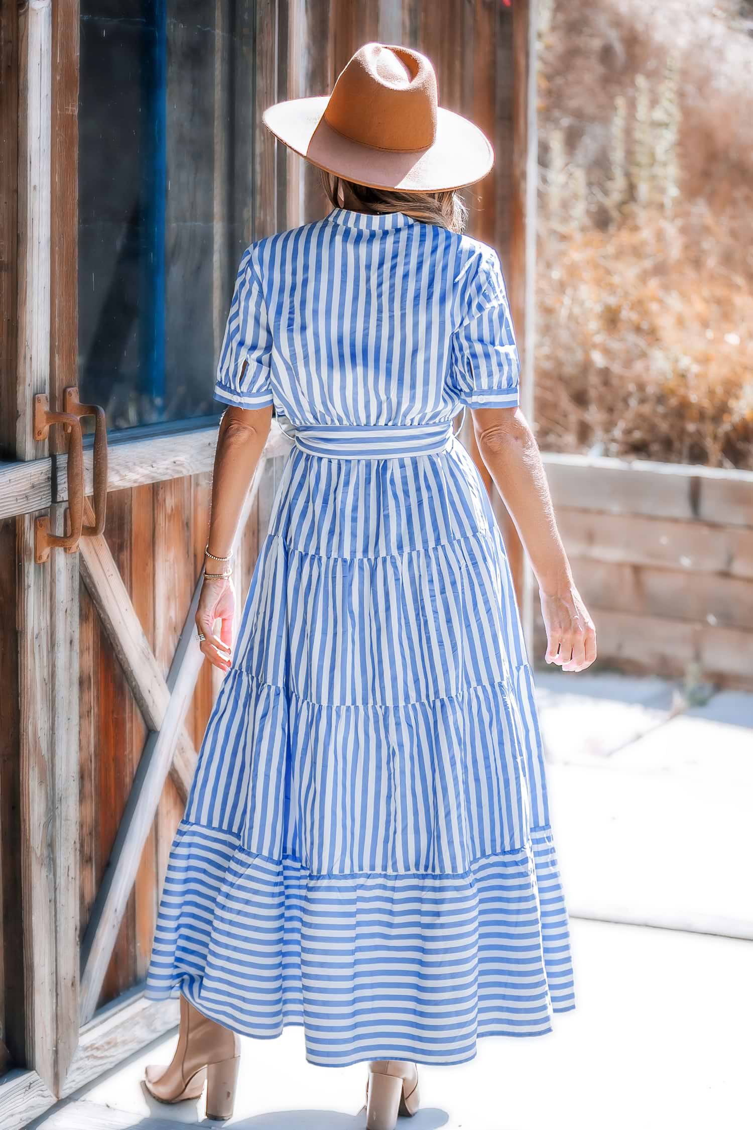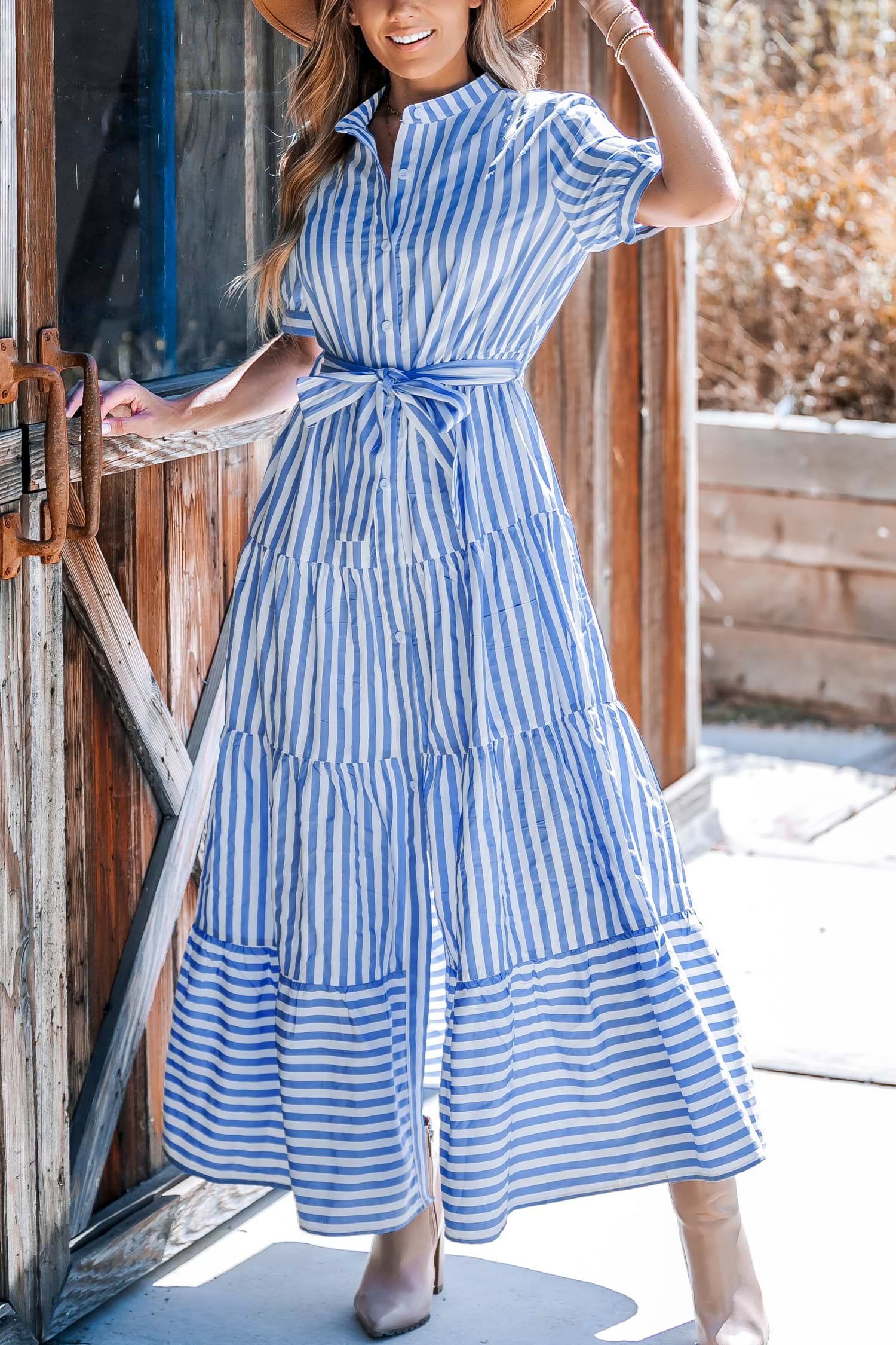 Blue Striped Puff Sleeve Front Button Maxi Dress