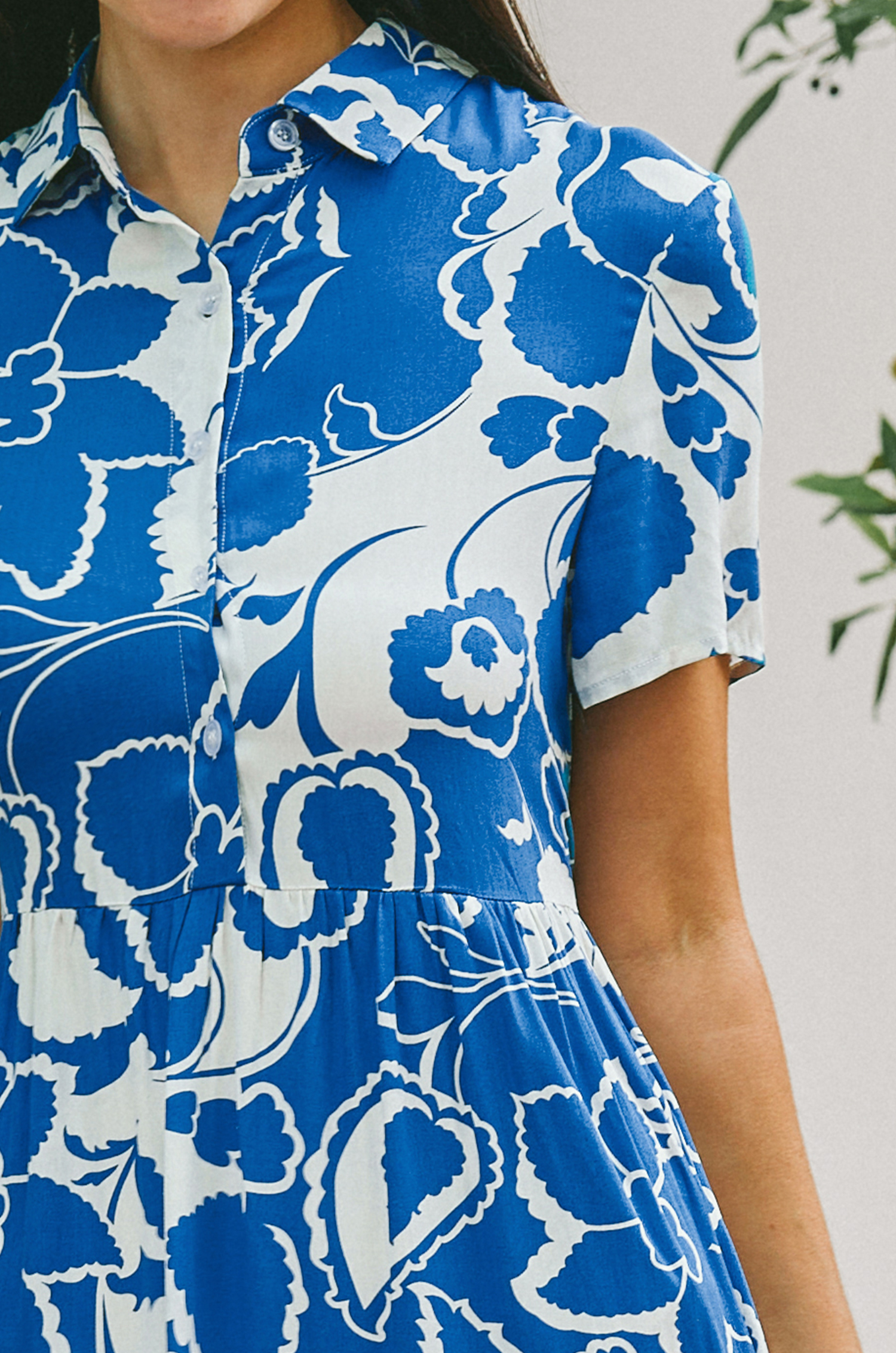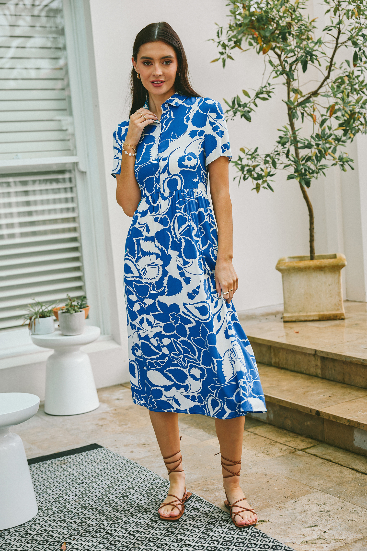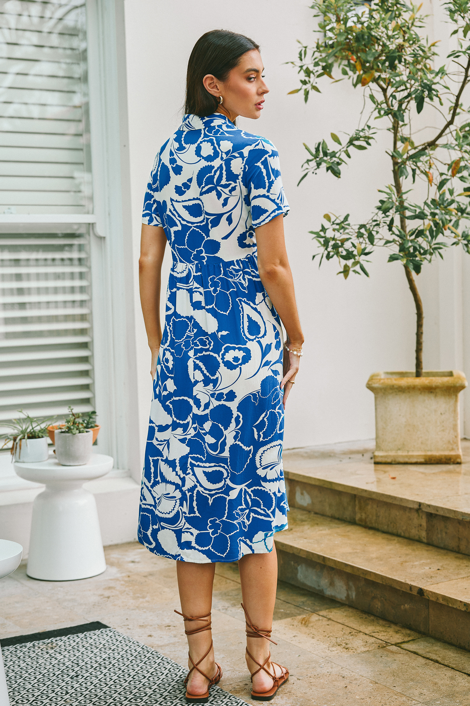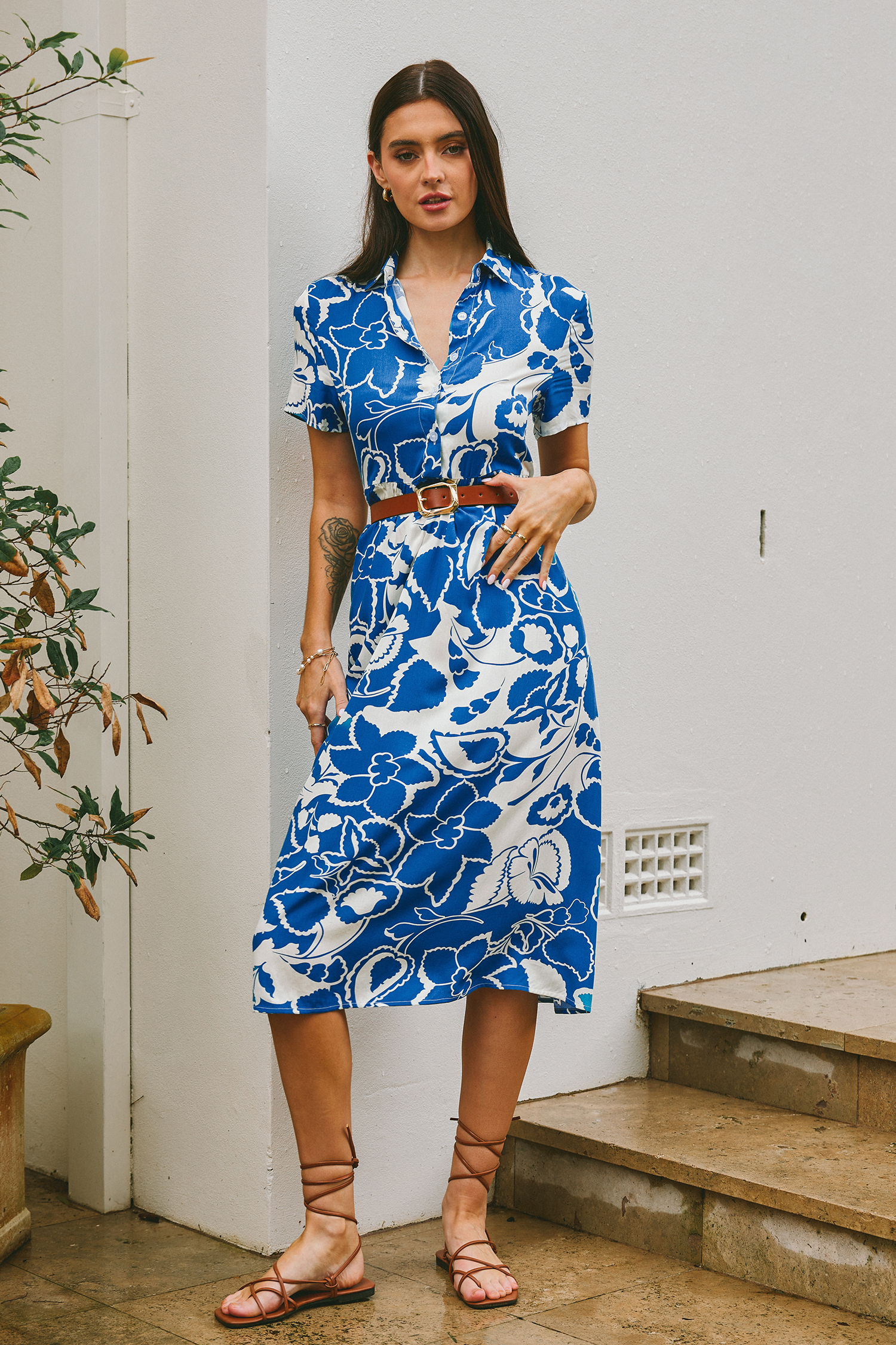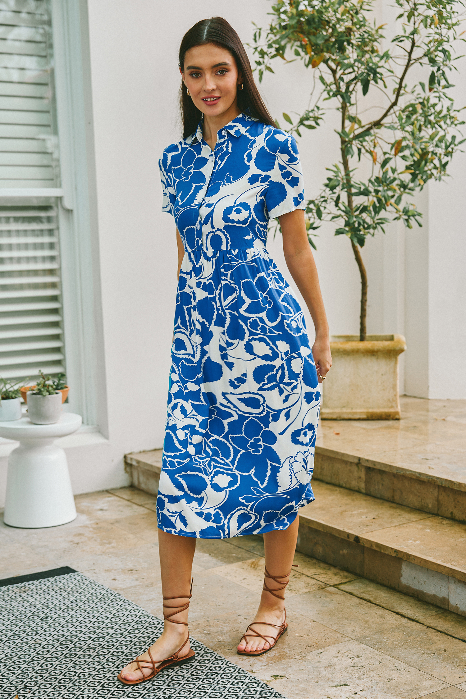 HomeBlue Tropical Floral Collared Midi Shirt Dress