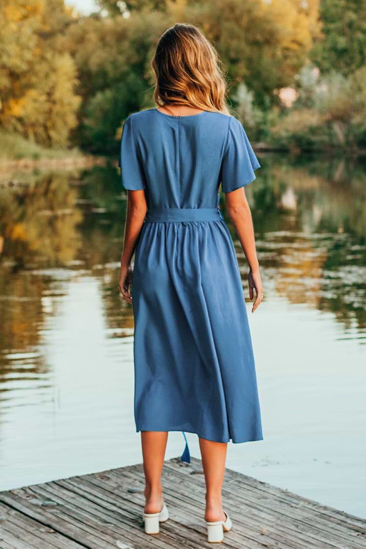 Blue V-Neck Belted Midi Dress
