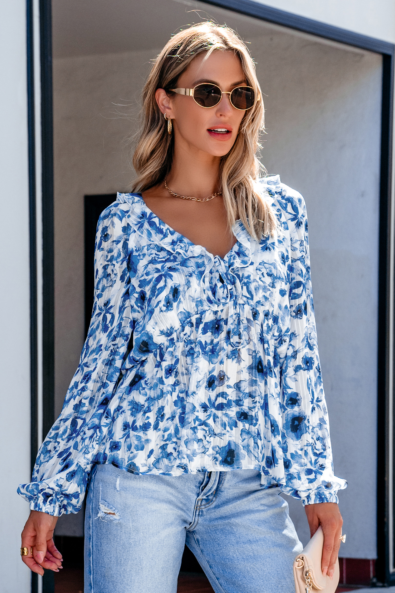 HomeBlue & White Floral Ruffled Plunging Blouse