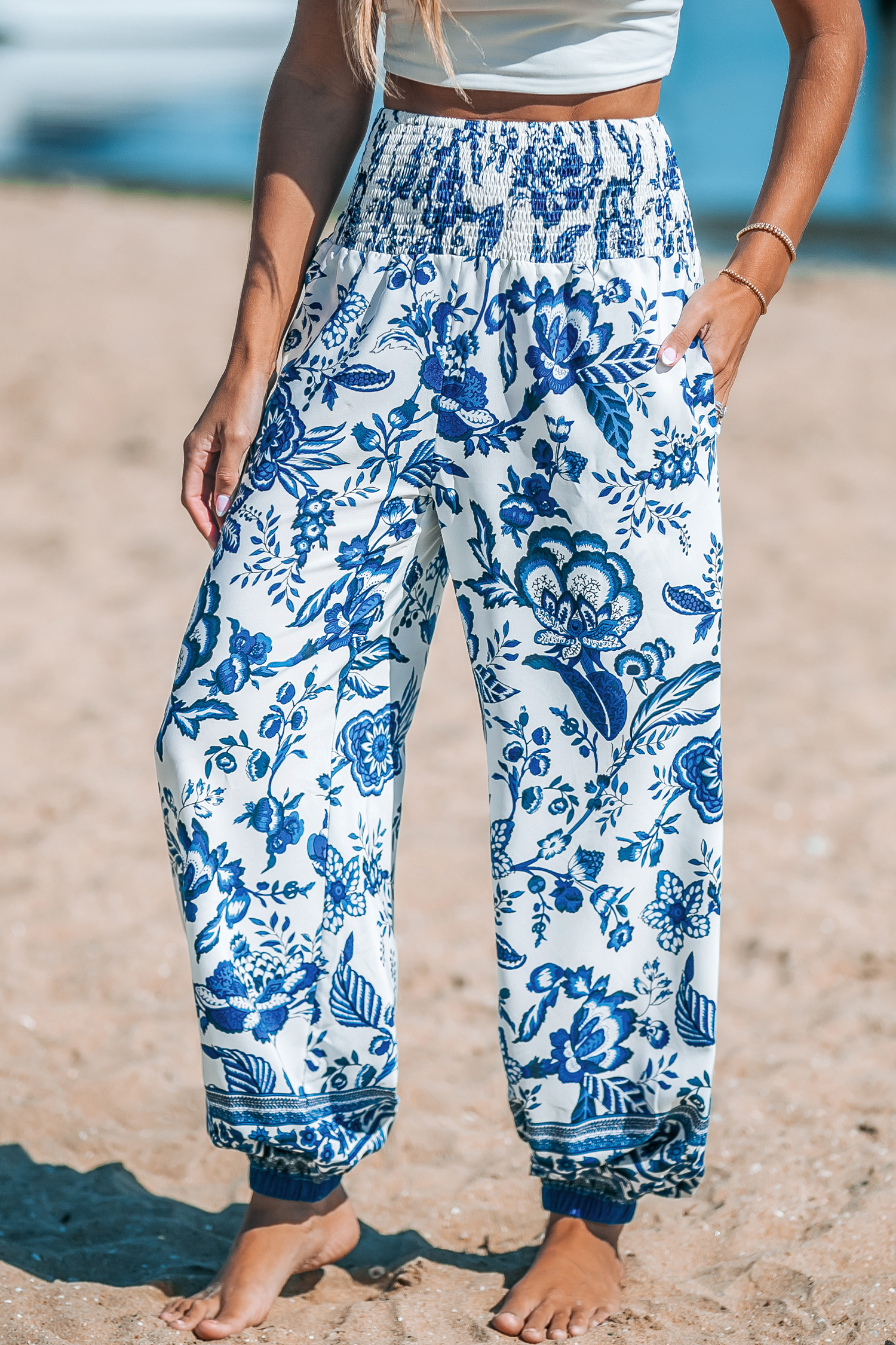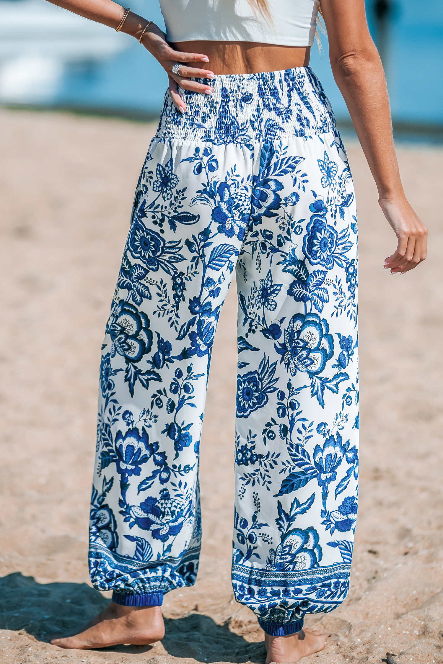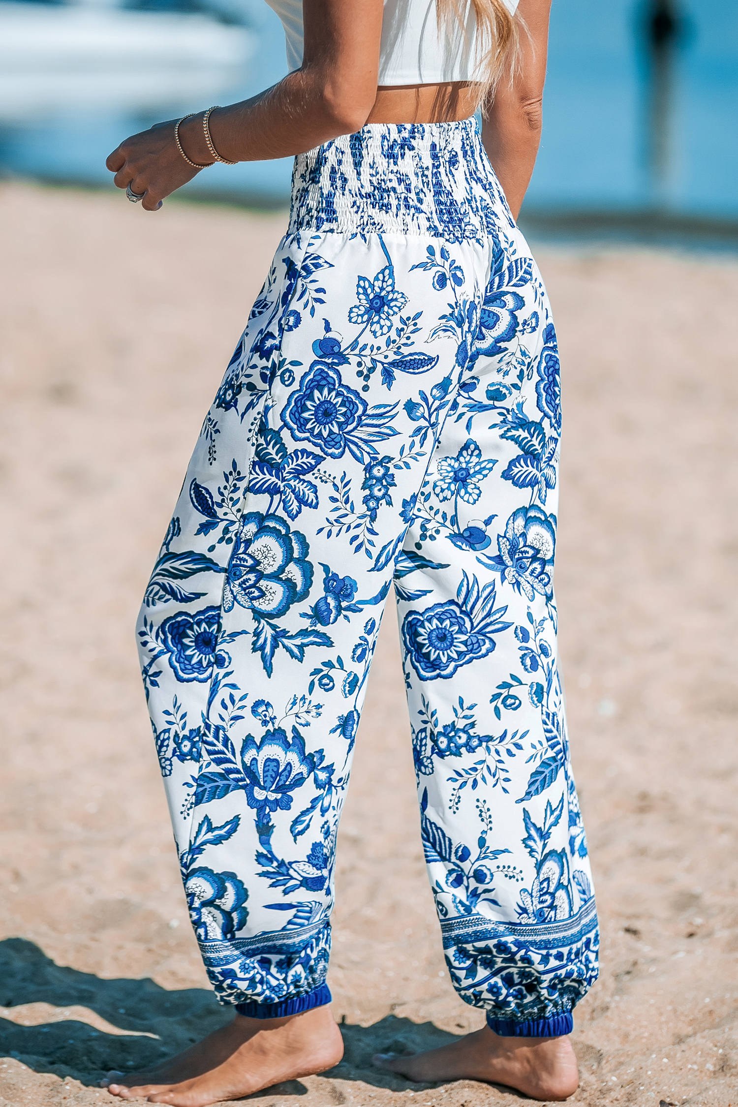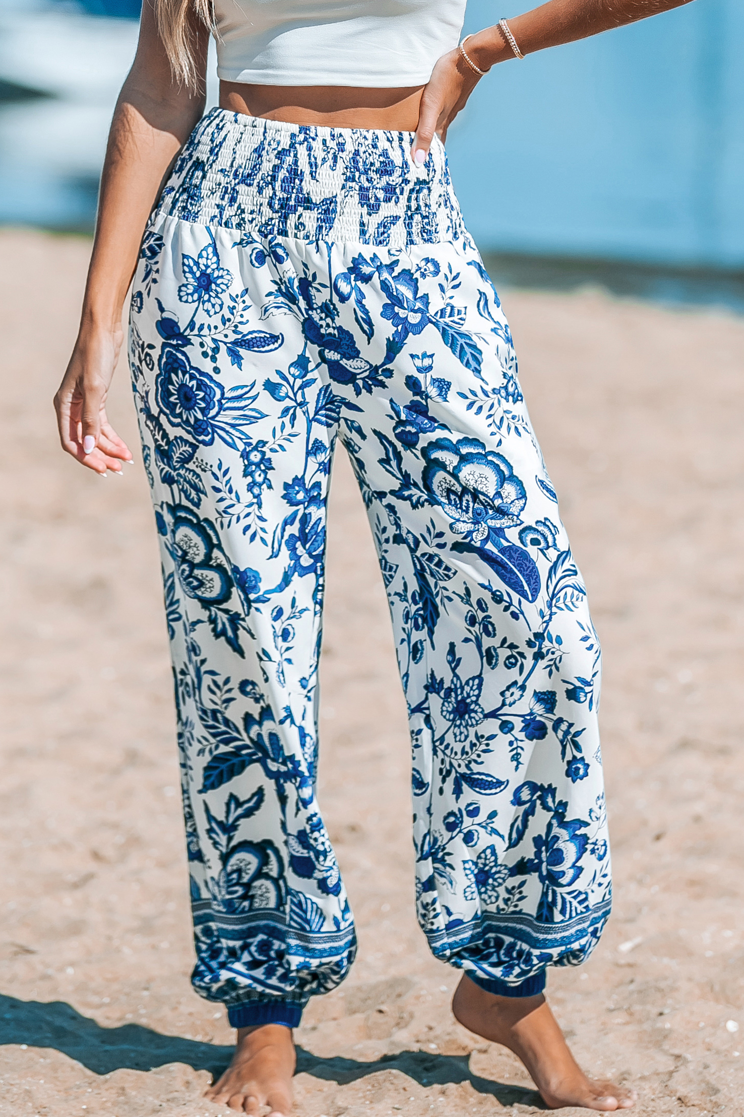 Blue & White Floral Smocked Waist Tapered Leg Pants