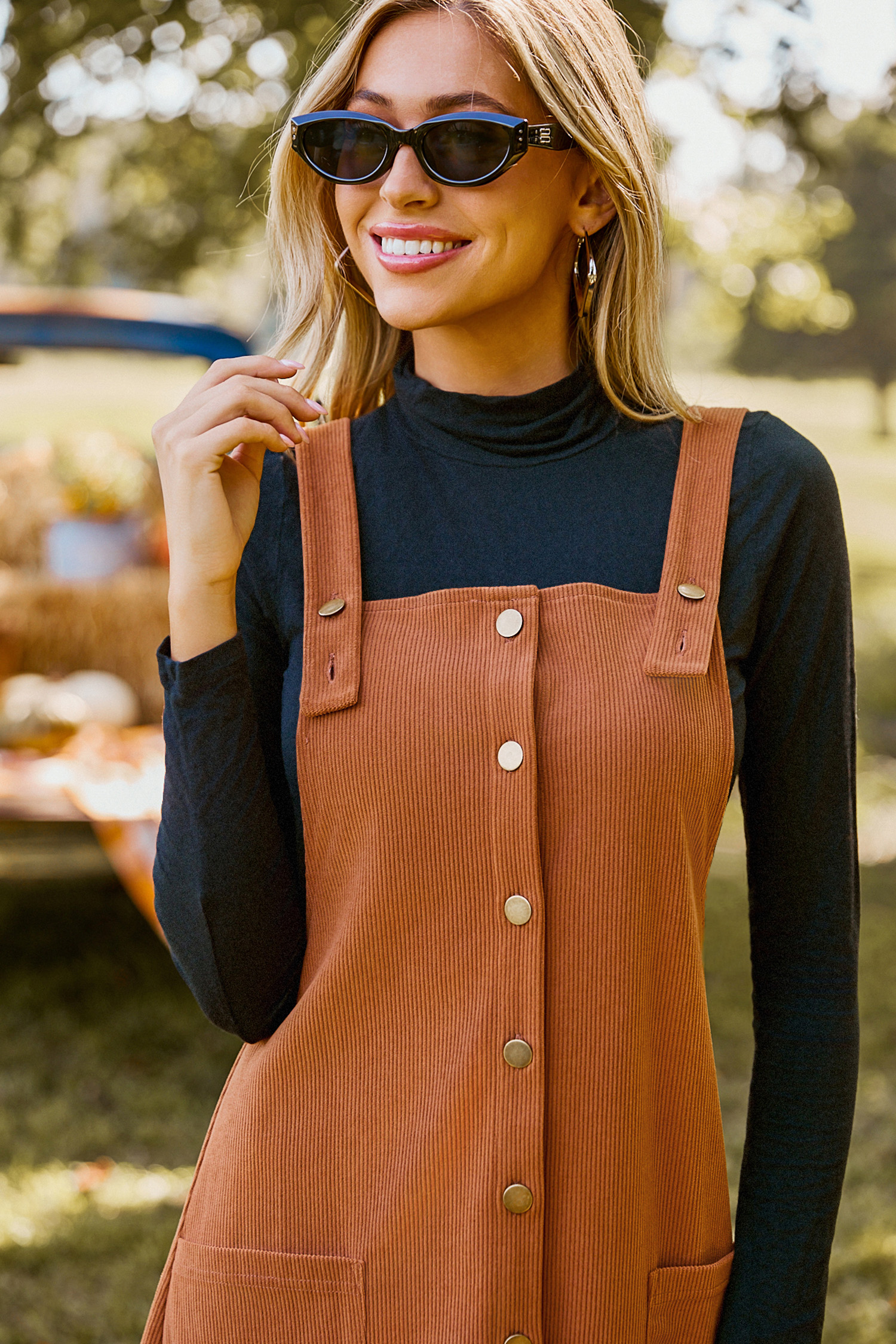 The shoulder straps may run a little long, so we recommend adjusting them for comfort and layering with a tee or base for extra coverage. Who knew corduroy could look this cool? The Brown Corduroy Square Neck Pinafore Dress merges retro charm with contemporary style. Its square neckline and relaxed fit make it a perfect choice for anyone who loves a touch of nostalgia.
