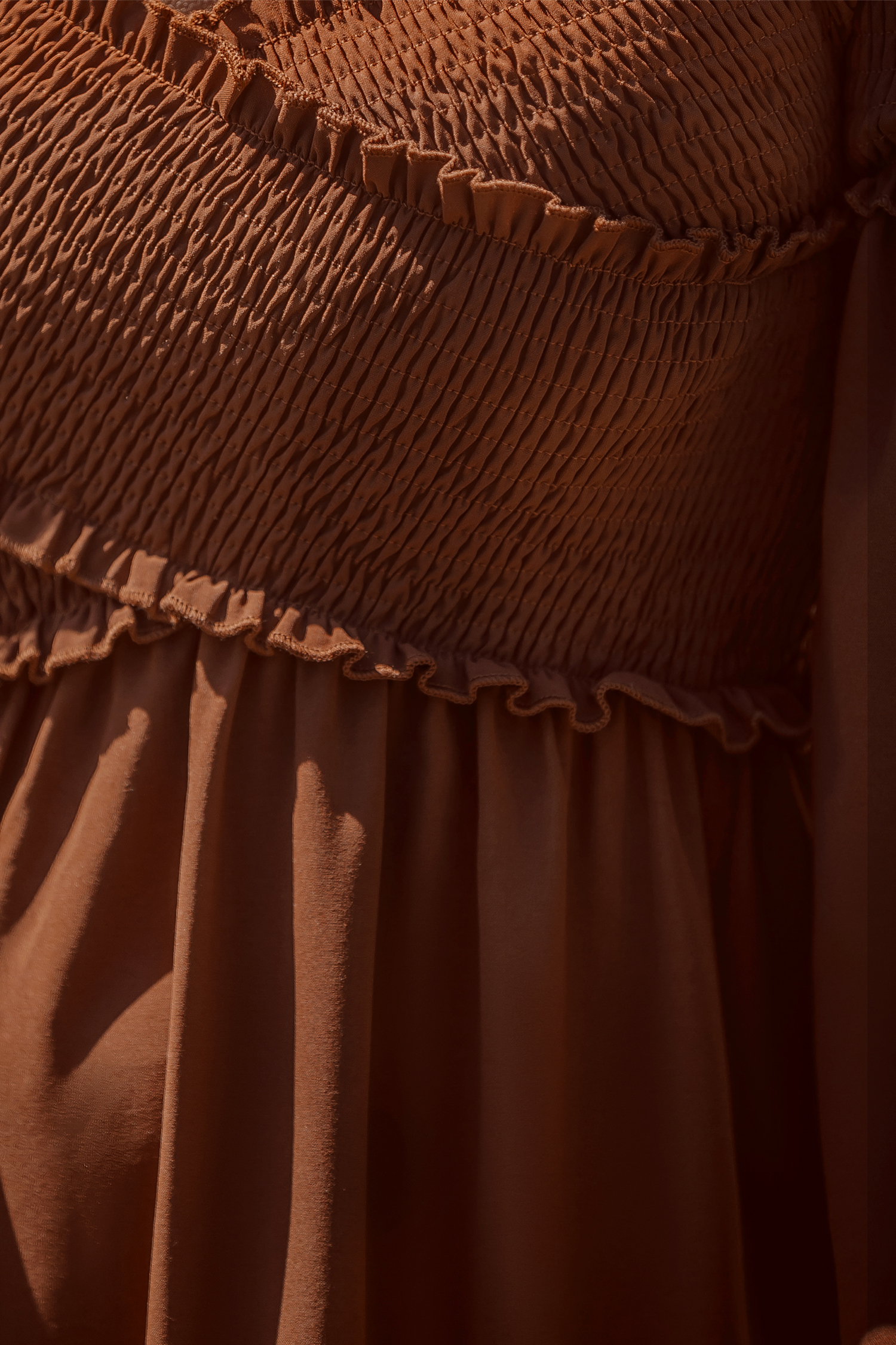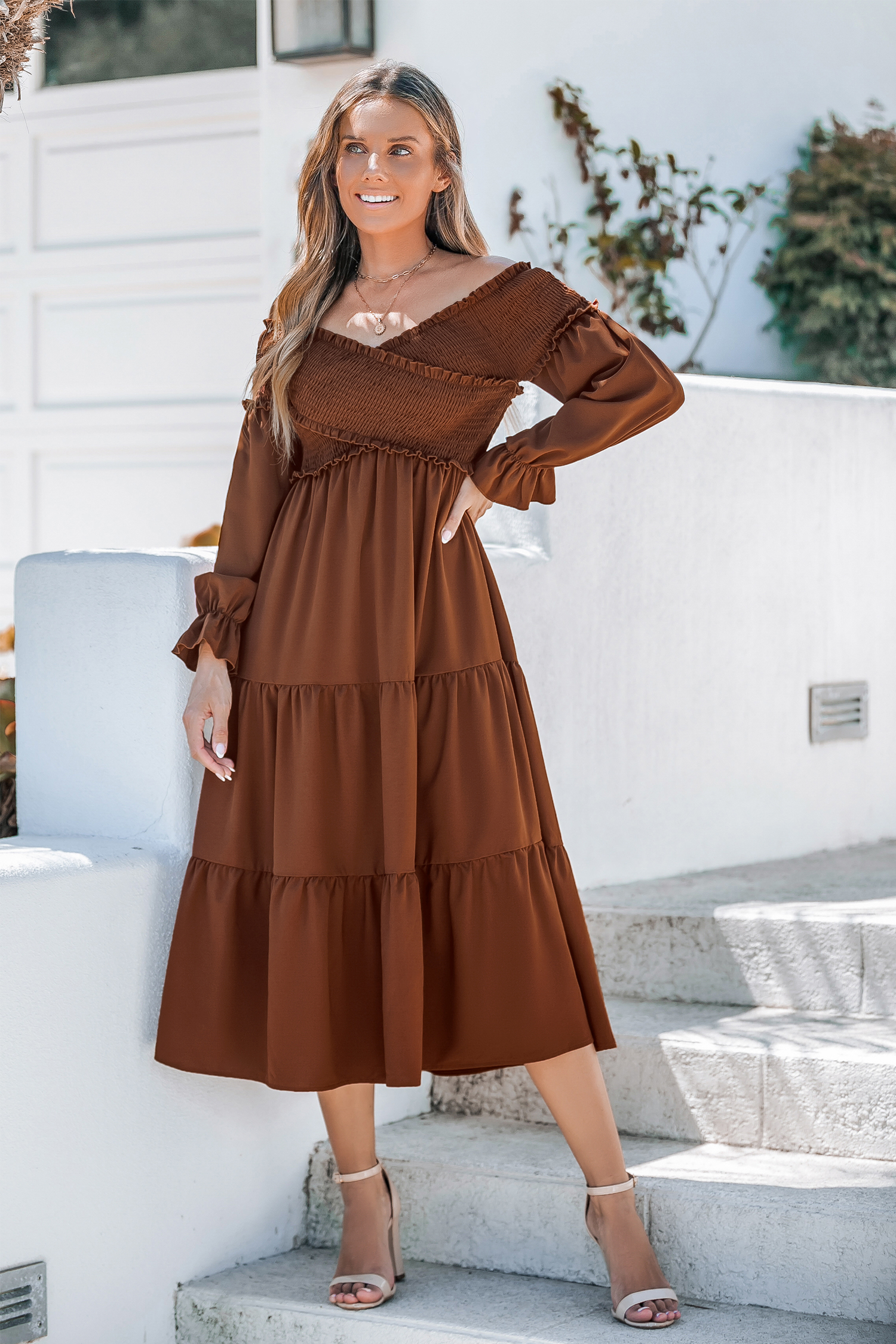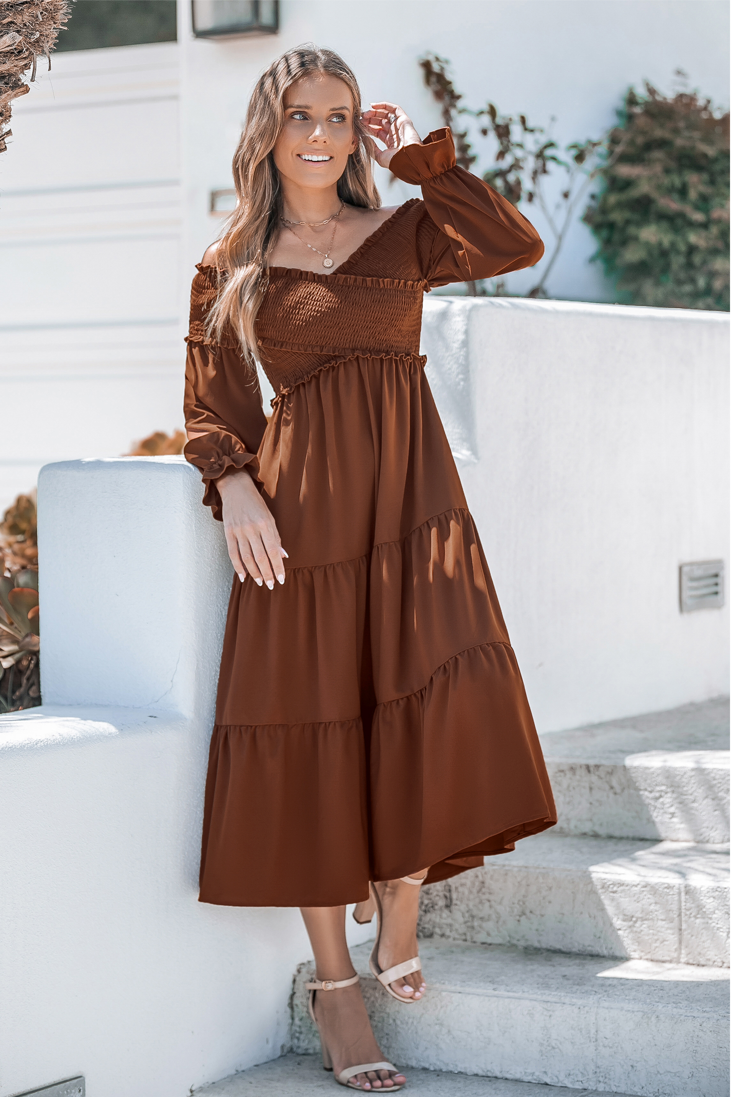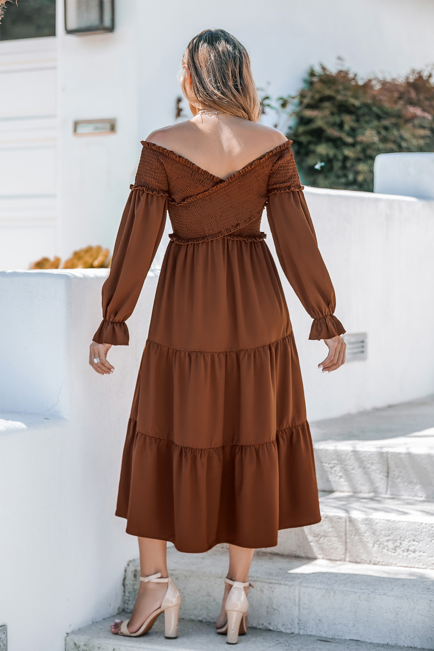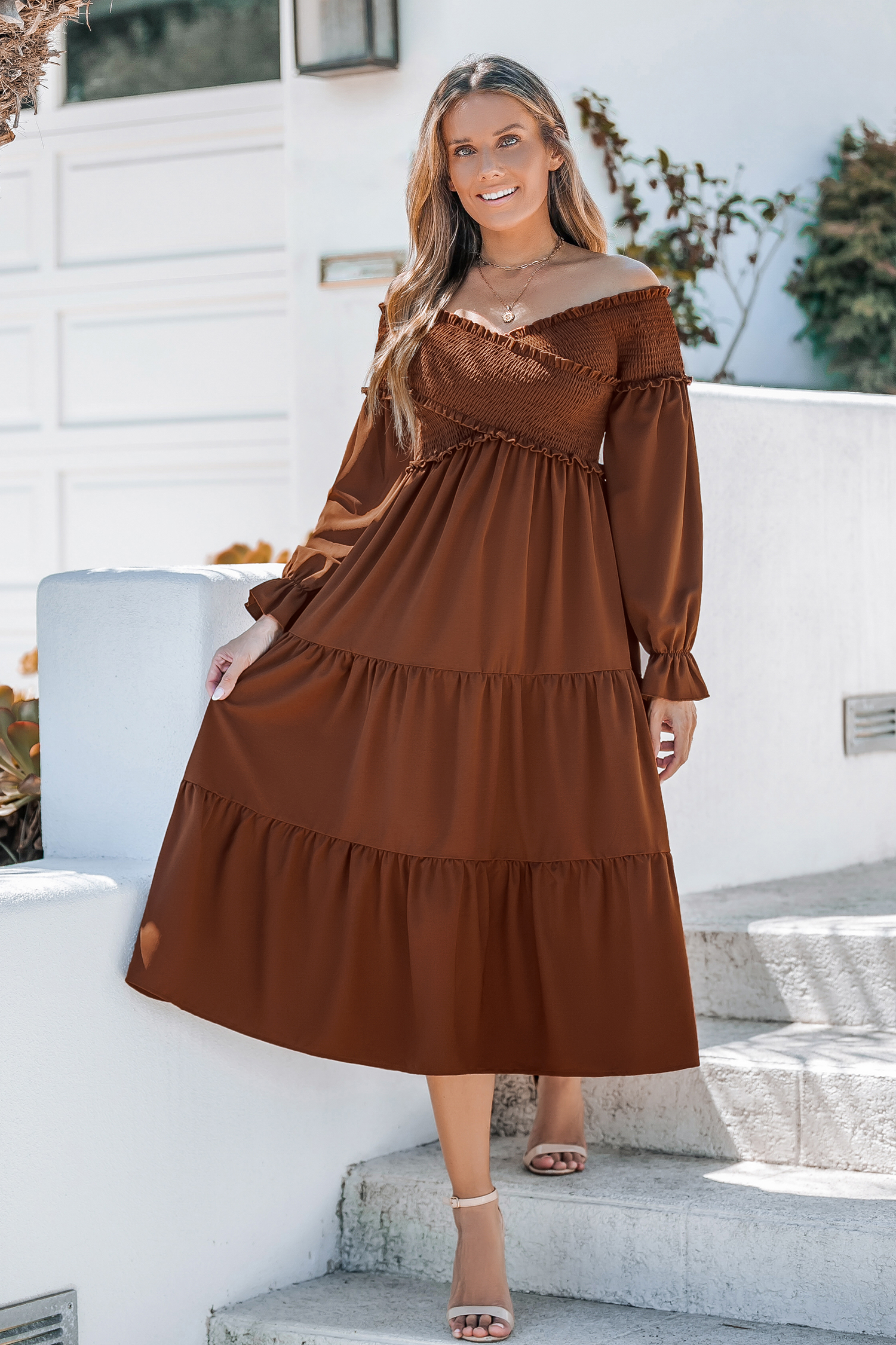 Brown Off-Shoulder Smocked Bodice Poet Sleeve Midi Dress