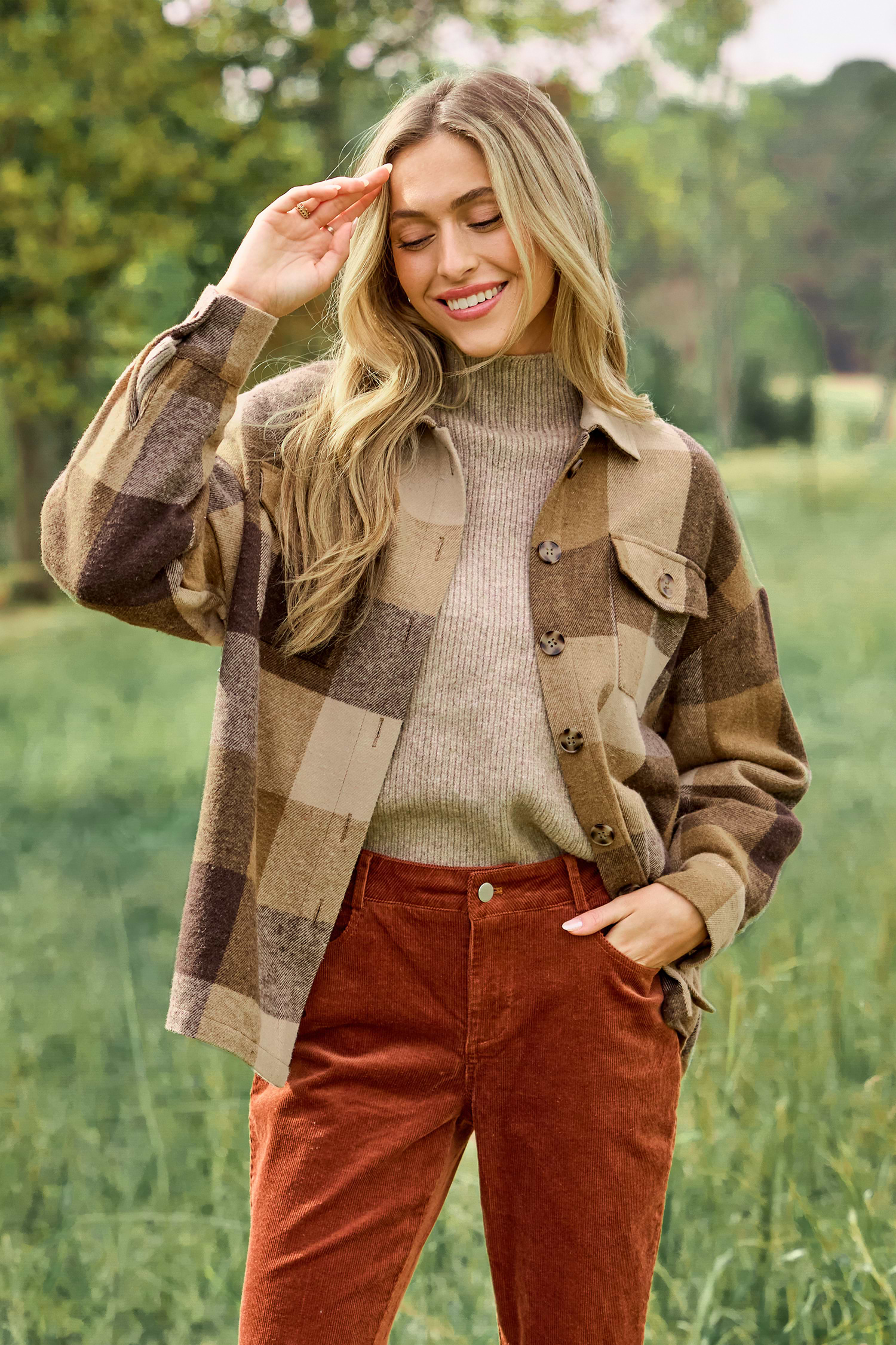 Brown Plaid Collared Button Up Shacket