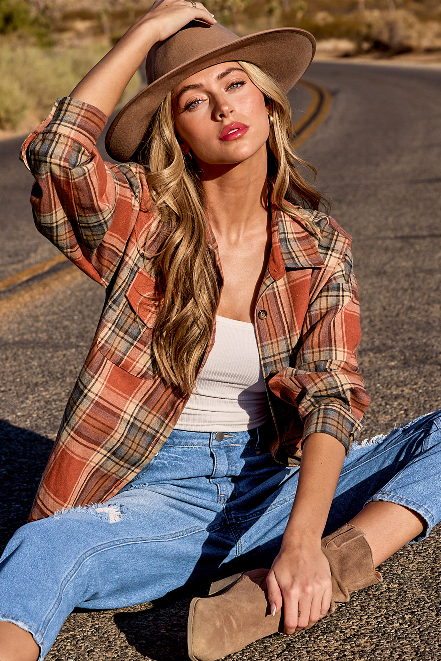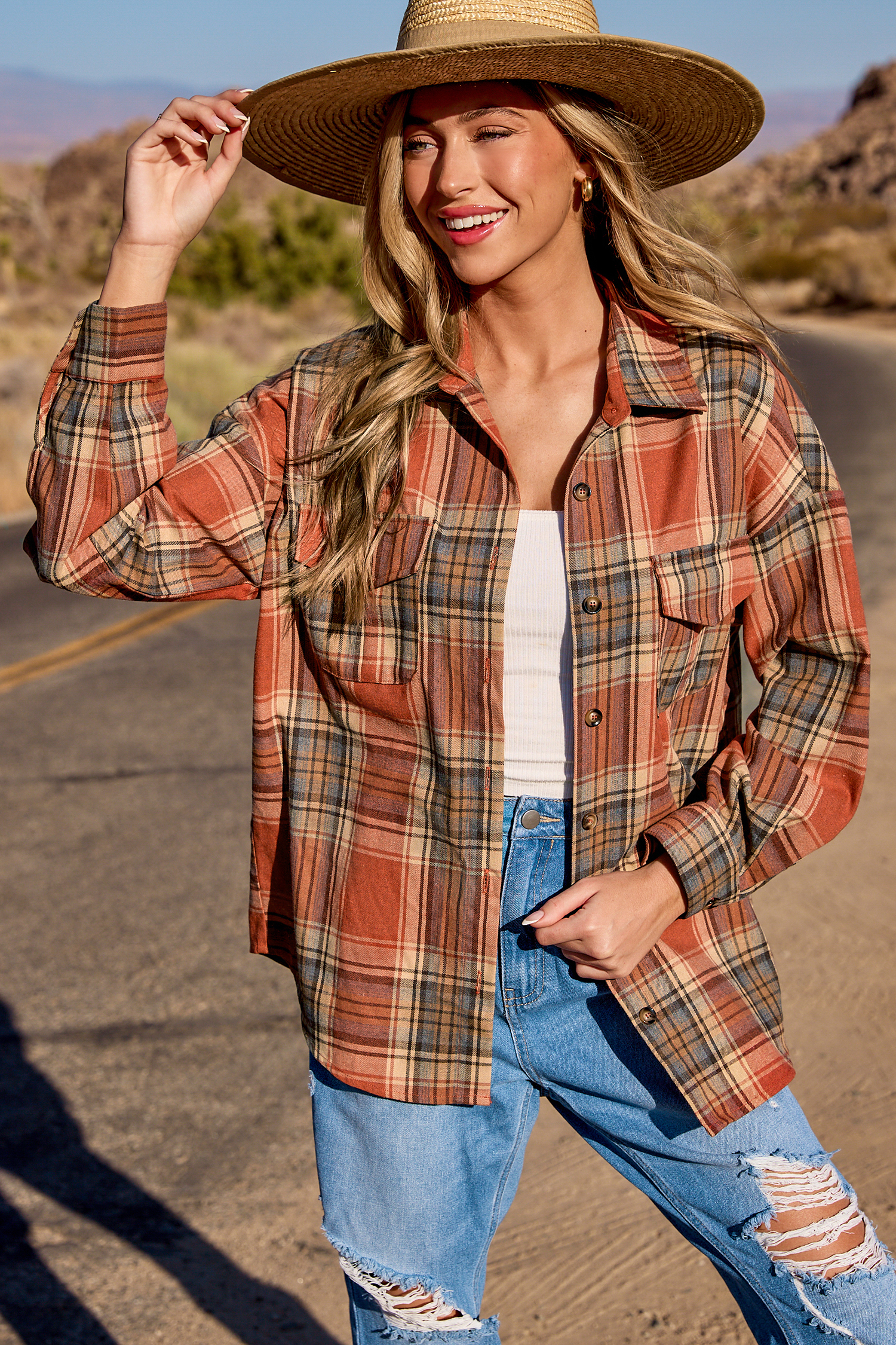 Brown Plaid Collared Long Sleeve Button-Up Shirt