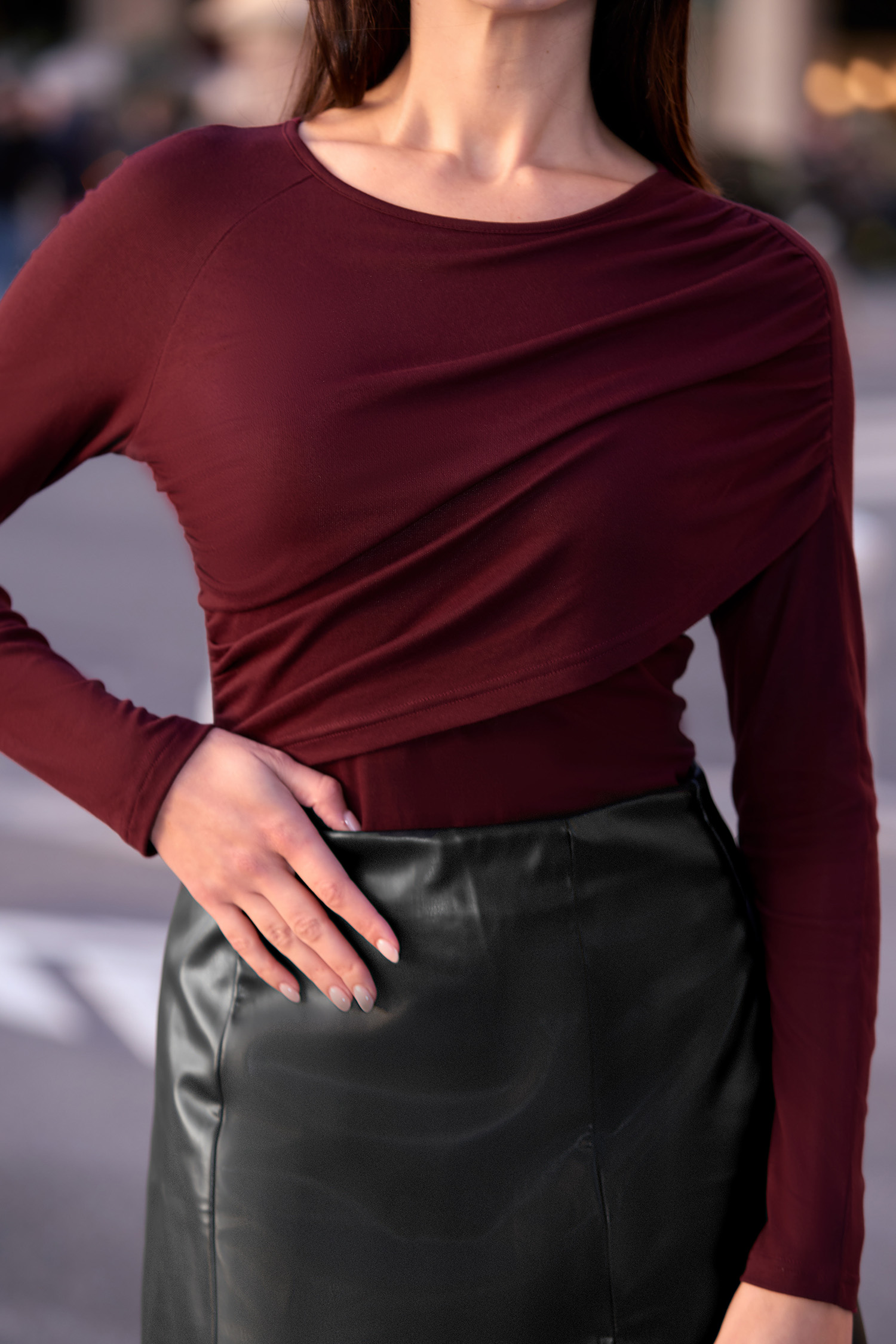 Burgundy Asymmetrical Ruched Long Sleeve Top