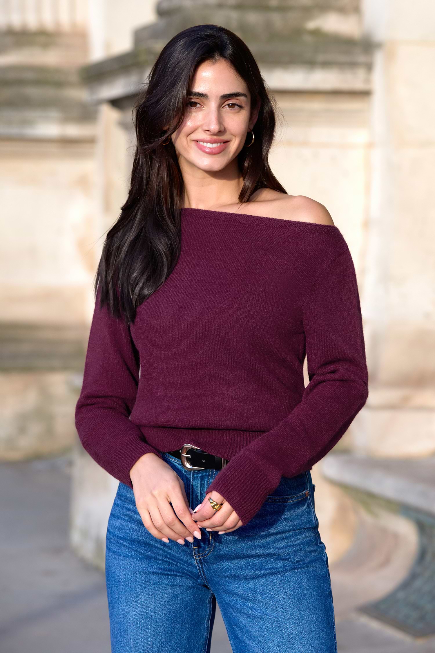 HomeBurgundy Off-Shoulder Long Sleeve Knit Top
