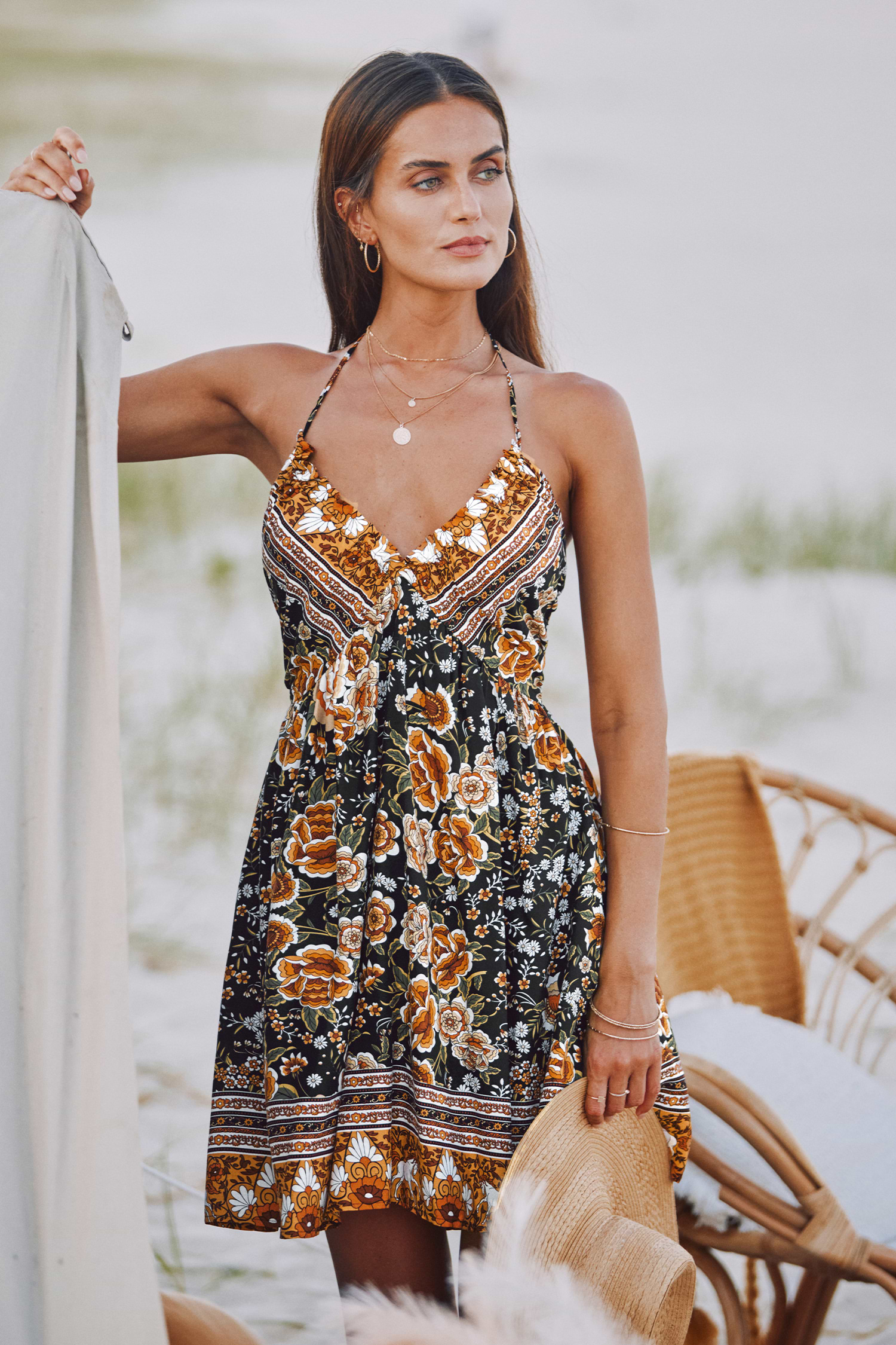 HomeBurnt Orange & Brown Halterneck Sweetheart Mini Dress