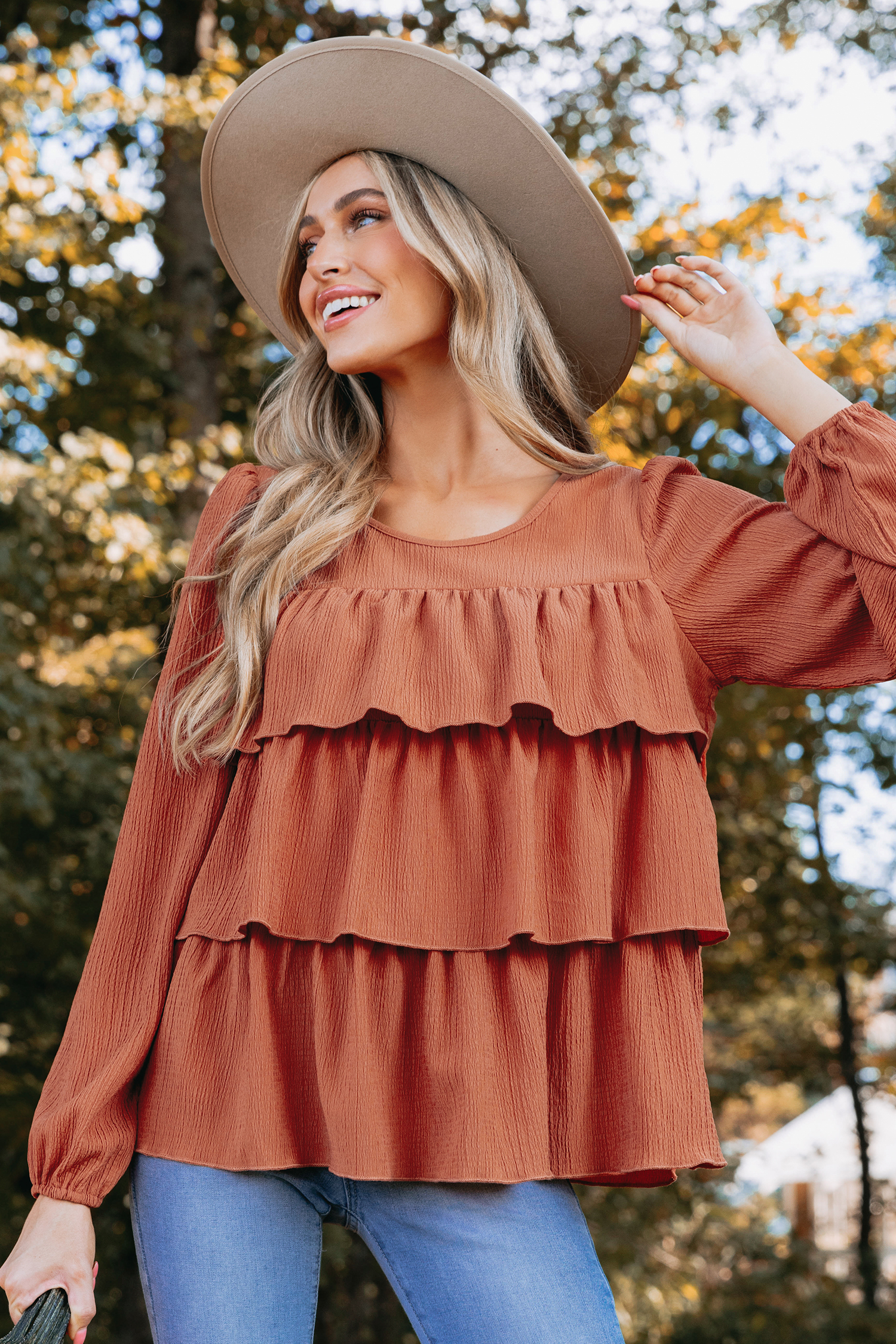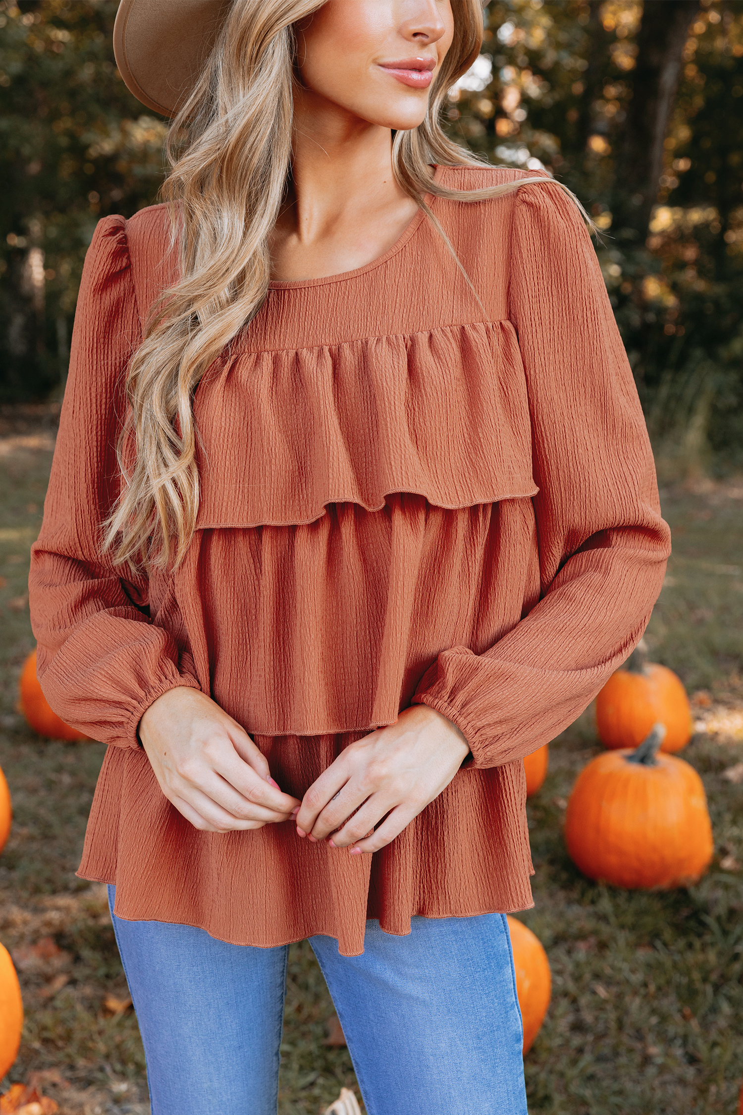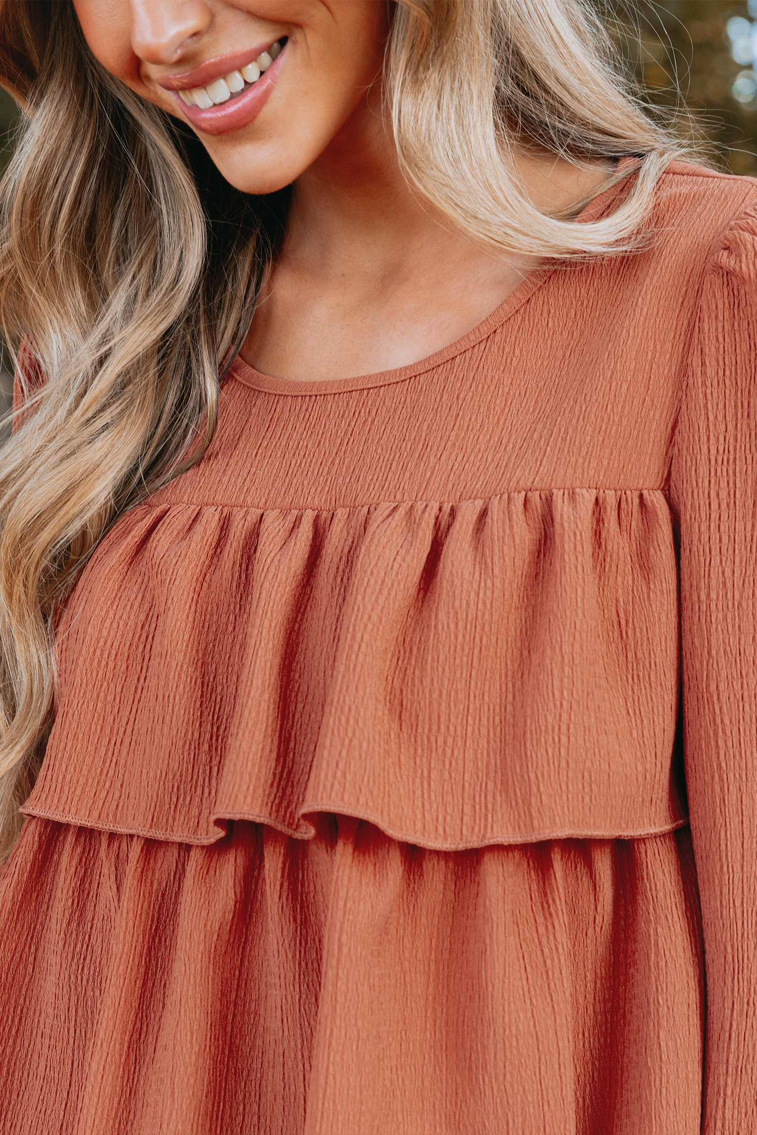 Burnt Orange Crinkle Woven Tiered Flounce Top
