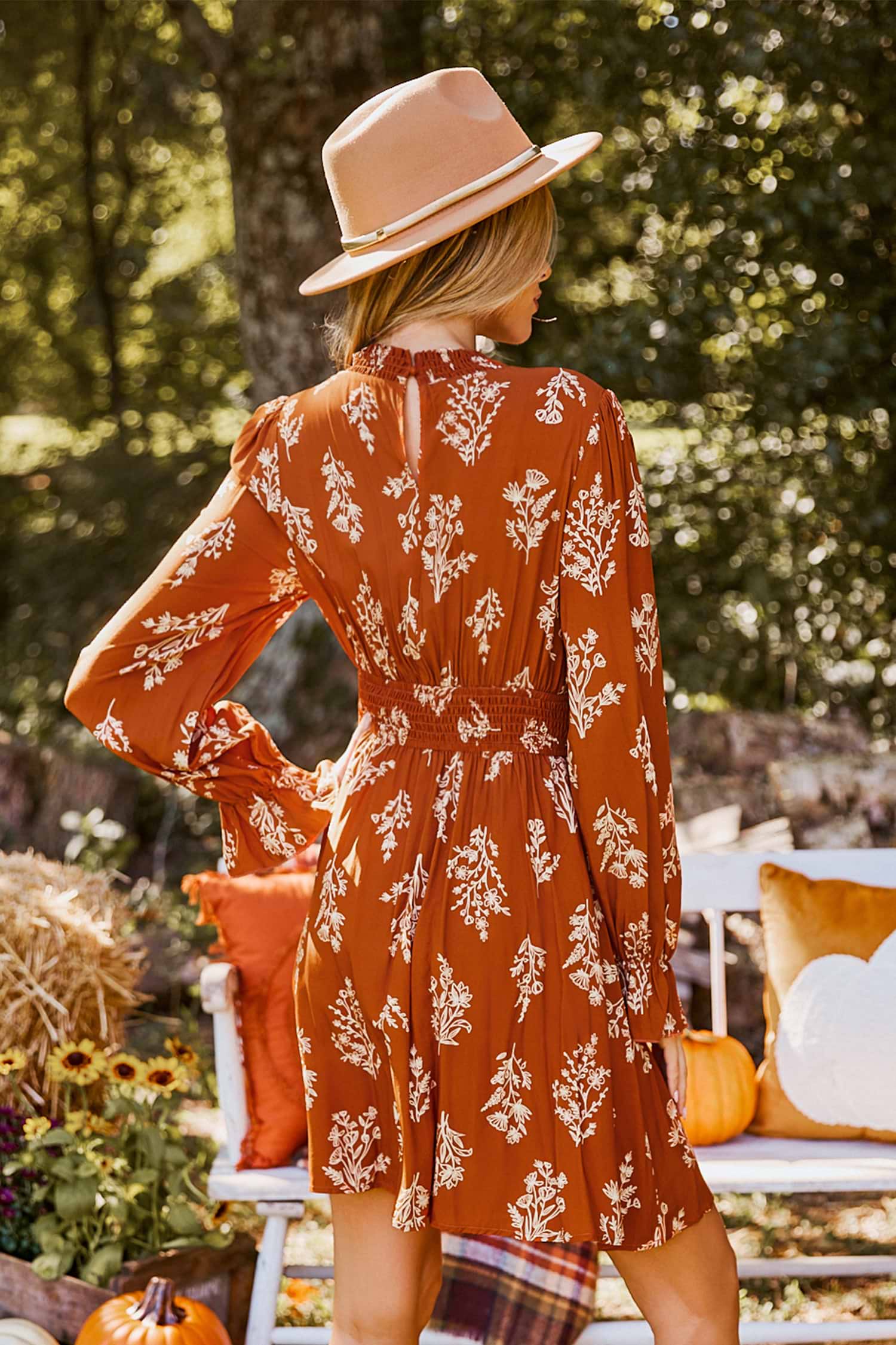 The Burnt Orange Floral Blouson Sleeve Mini Dress wraps you in vibrant florals and playful blouson sleeves. It’s the perfect dress for making a statement while staying effortlessly chic.
