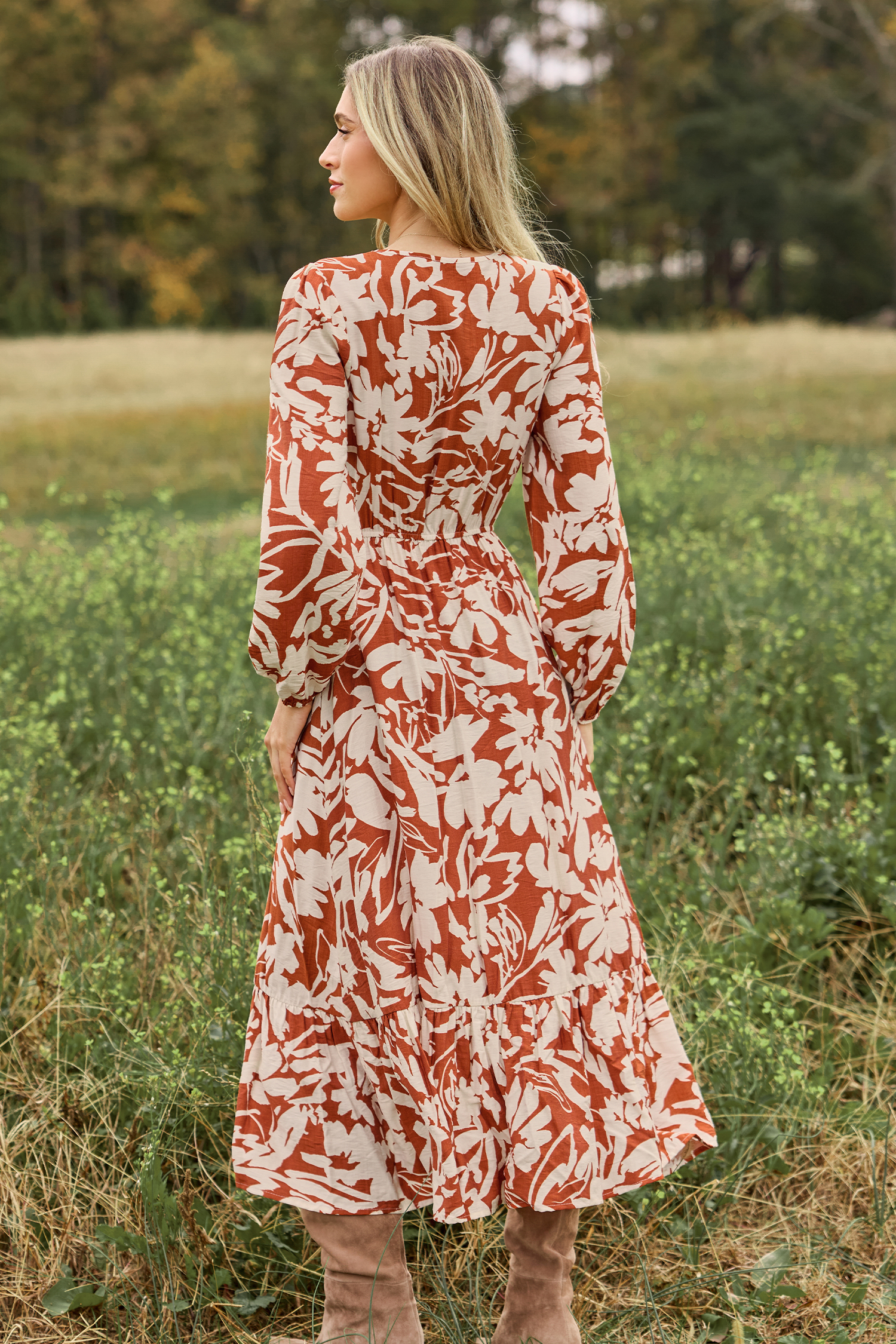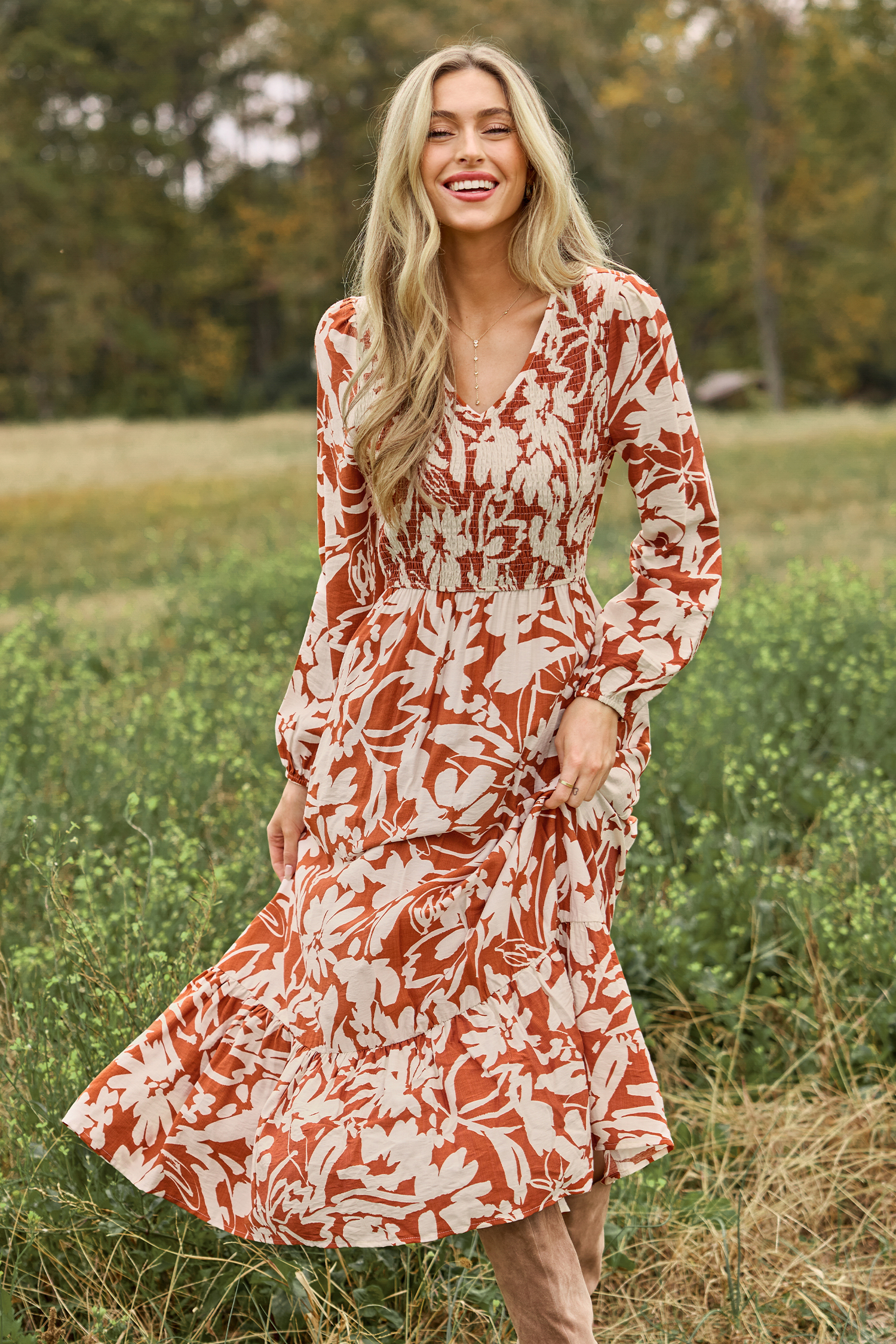 Burnt Orange Floral Puff Sleeve Maxi Dress