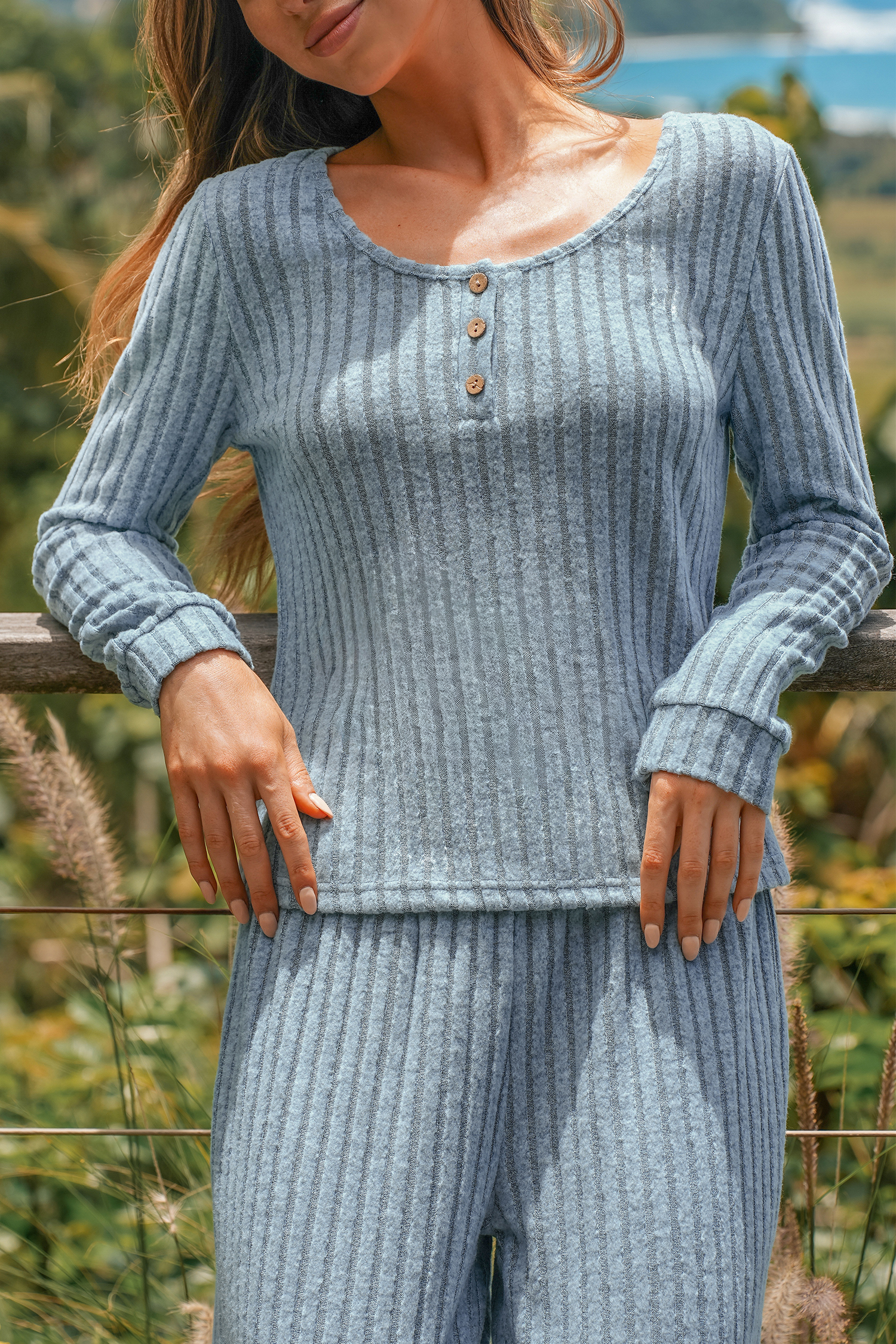 The Buzz-Worthy Blue Pajama Set is cozy with a side of style! A round-neck, long-sleeve top pairs with matching bottoms for all-day lounging or a comfy night in.