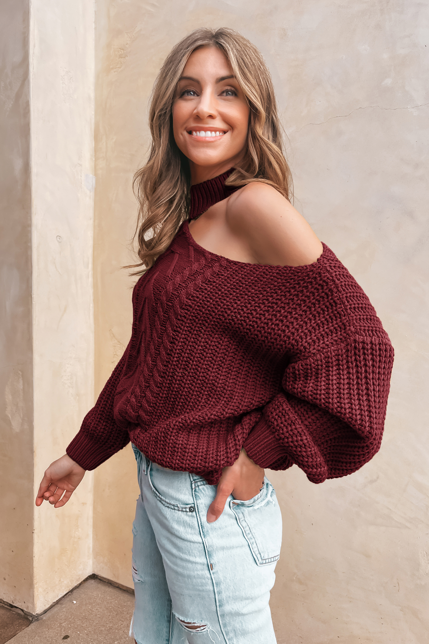 Burgundy Cable Knit Cutout One Shoulder Sweater